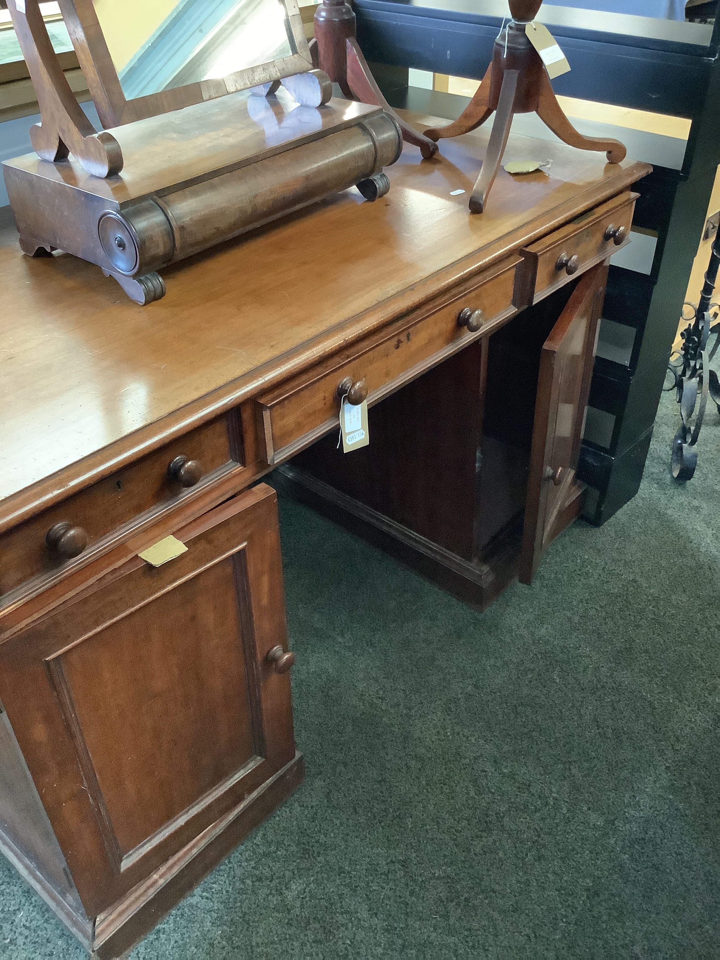 A Victorian mahogany pedestal desk the top having three drawers above two cupboards