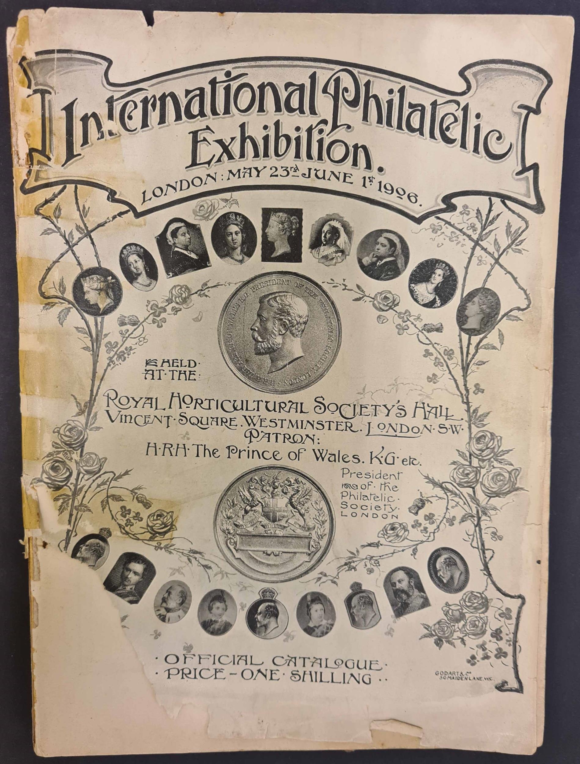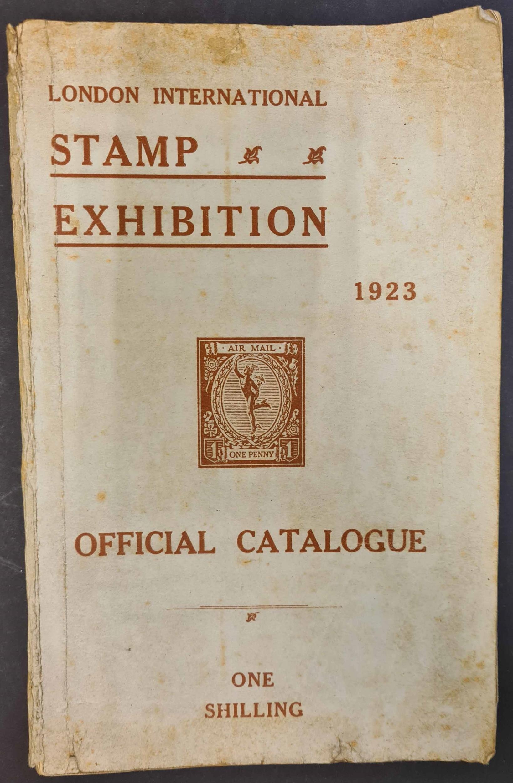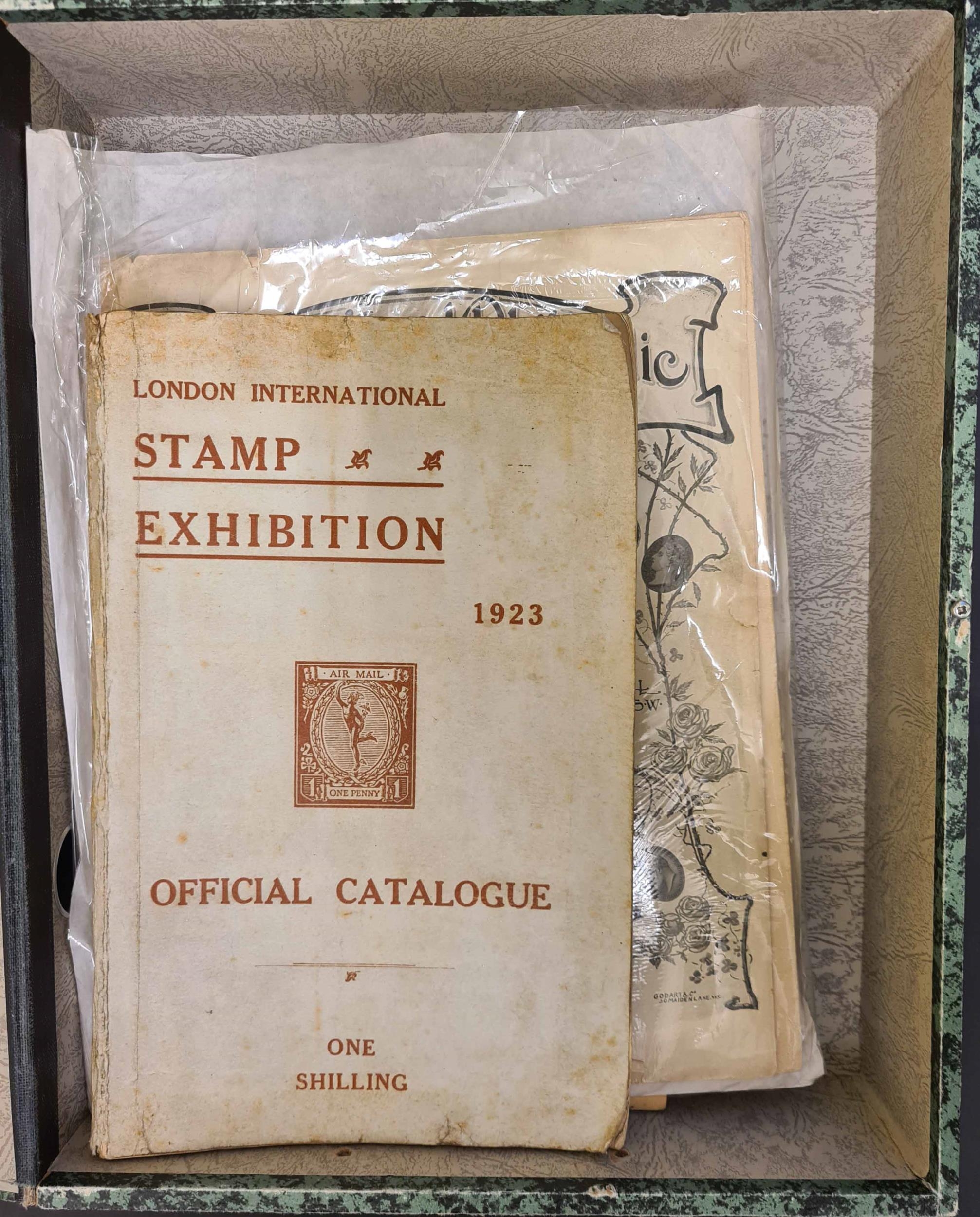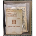 PHILATELIC EXHIBITION CATALOGUES; A box-file containing catalogues from a selection of philatelic exhibitions inc. 1923 (some stains & wear to cover but complete contents); 1926 (cover damaged/missing but contents sound); 1950 Prospectus, Catalogue & Stamp Collecting Exhibition Number and 1960 Exhibition catalogue. (6)