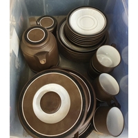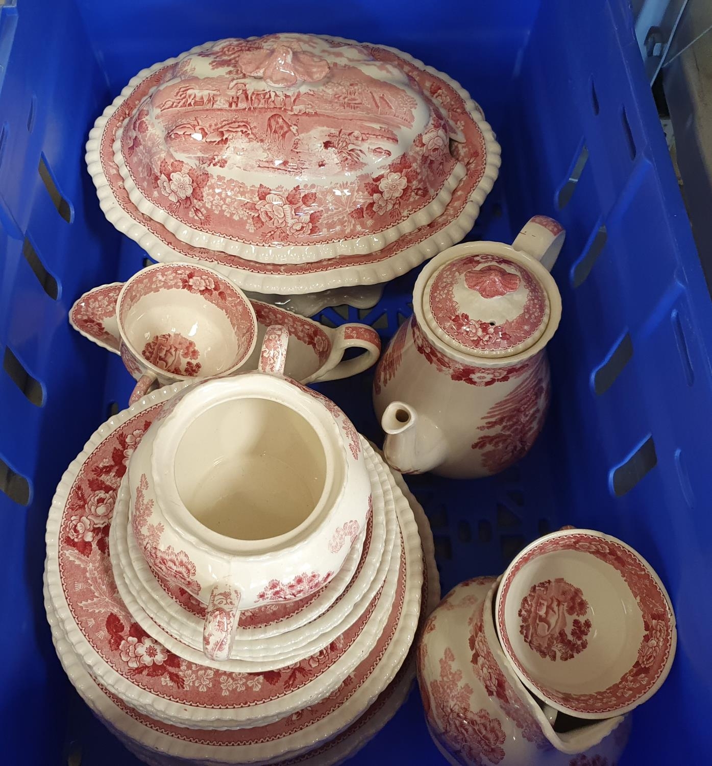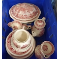 Box of antique Staffordshire transferware dinner service with lidded tureen (Qty)
