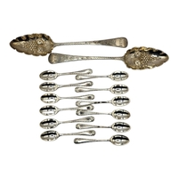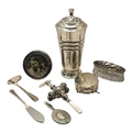 Comprising a sugar sifter, hallmarked Birmingham, 1936, silver fronted picture frame, hallmarked A&J Zimmerman Ltd, Birmingham, 1917, silver trinket box, blue satin and felt interior (lacking foot), hallmarked Deakin & Francis Ltd, Birmingham, 1910, silver topped oval box, hallmarked Edwin Joseph Houlston, Birmingham, 1905, novelty silver hand mirror, hallmarked Crisford & Norris Ltd, Birmingham, 1909, silver baby pusher, hallmarked Allen & Darwin, Sheffield, 1922 and silver butter spreader, hallmarked Francis Howard Ltd, Sheffield, 1975.