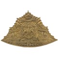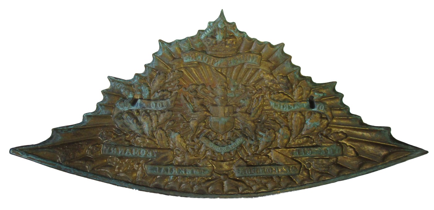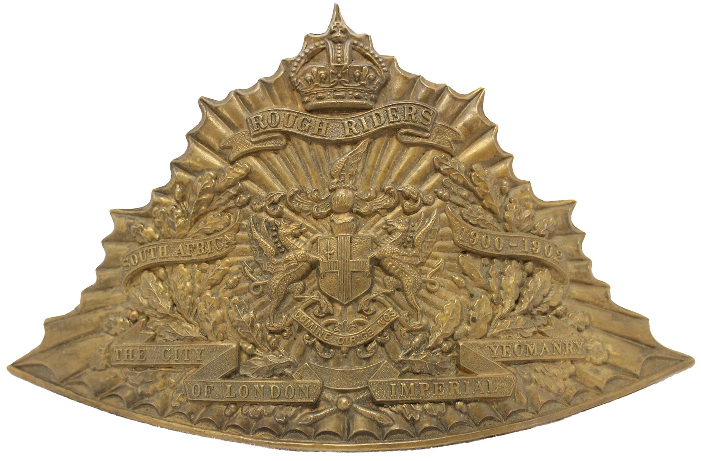 City of London Imperial Yeomanry lance cap plate, KC, Rough Riders in scroll below crown, battle honours South Africa and 1900-1902 in scrolls either side of central badge, The City of London Imperial Yeomanry in scroll below, 2 screw posts, no nuts, minor verdi gris to reverse, otherwise extremely fine. (See photo) (T)