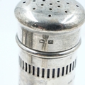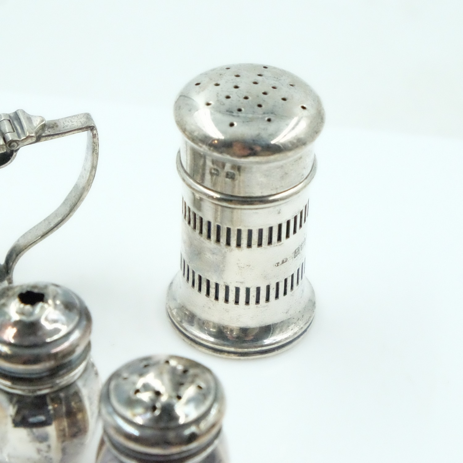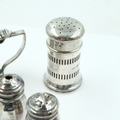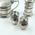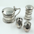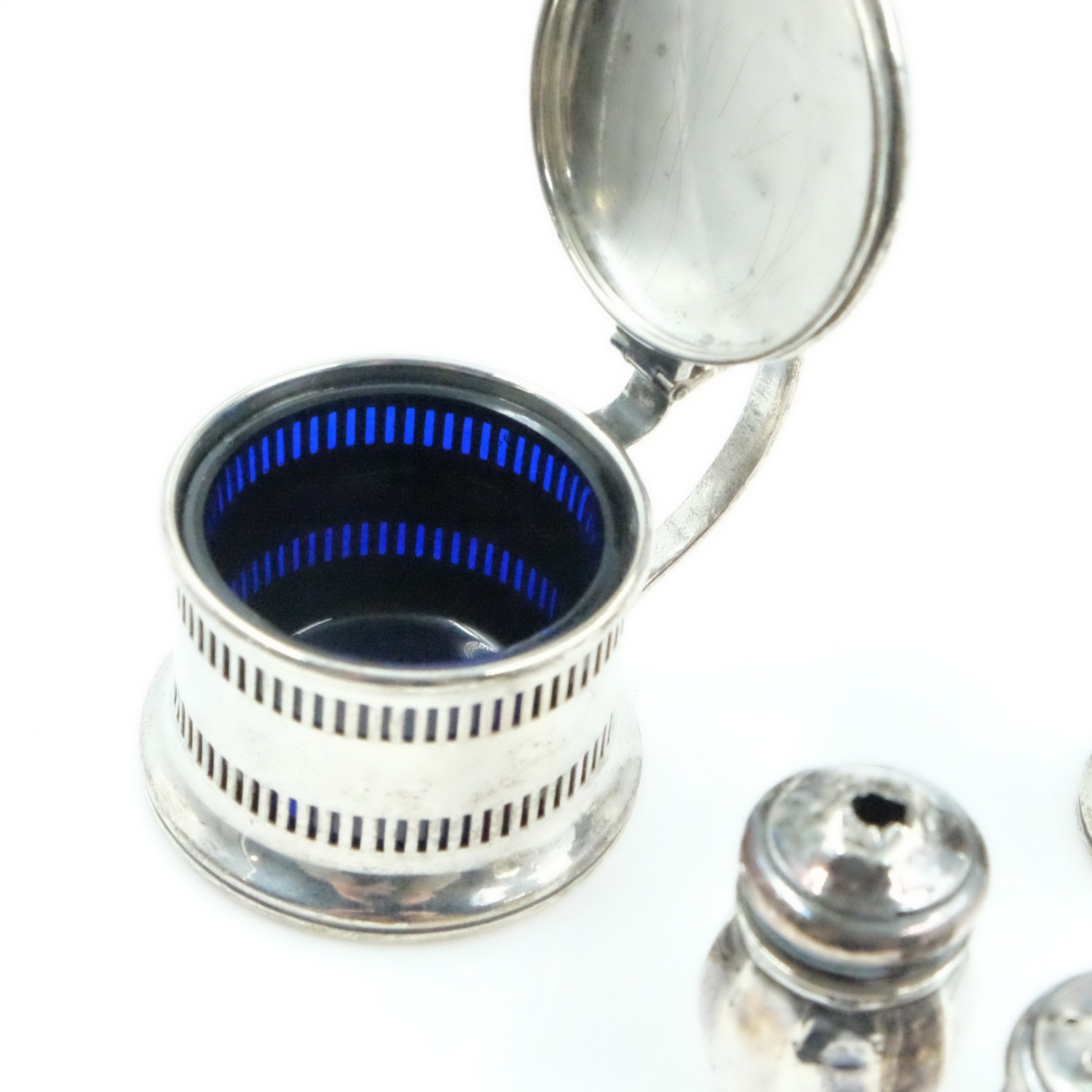 Hallmarked silver mustard and pepperette with blue glass liners, with a pair of miniature salt and pepper pots, combined 58g. UK P&P Group 2 (£24+VAT for the first lot and £5+VAT for subsequent lots)