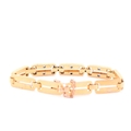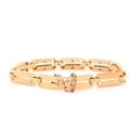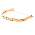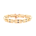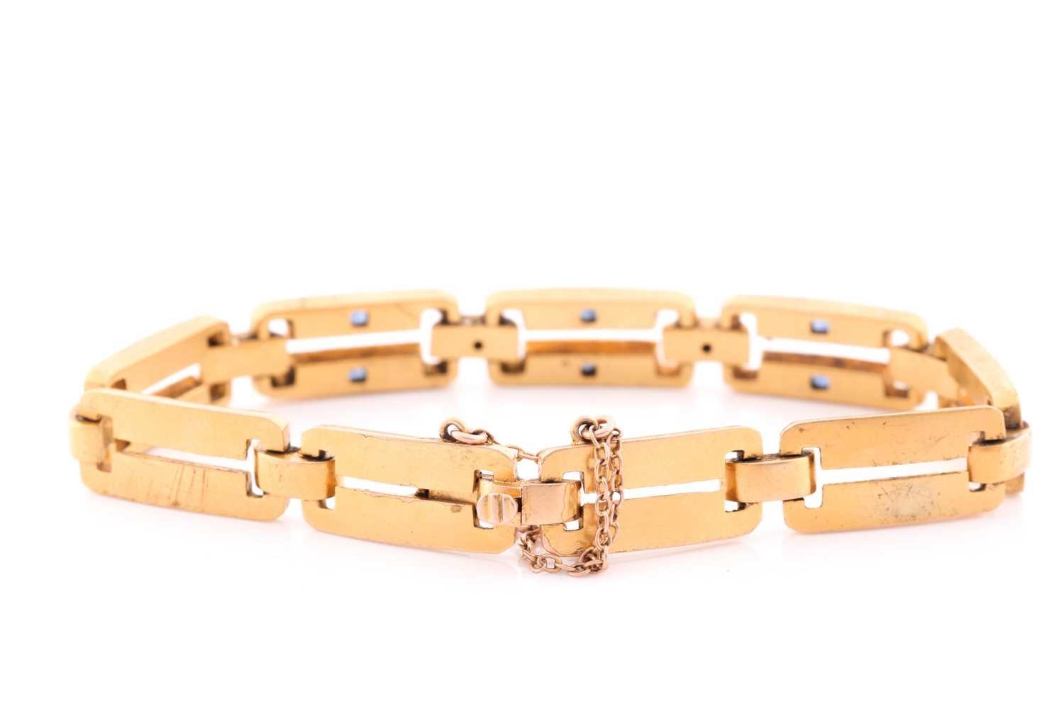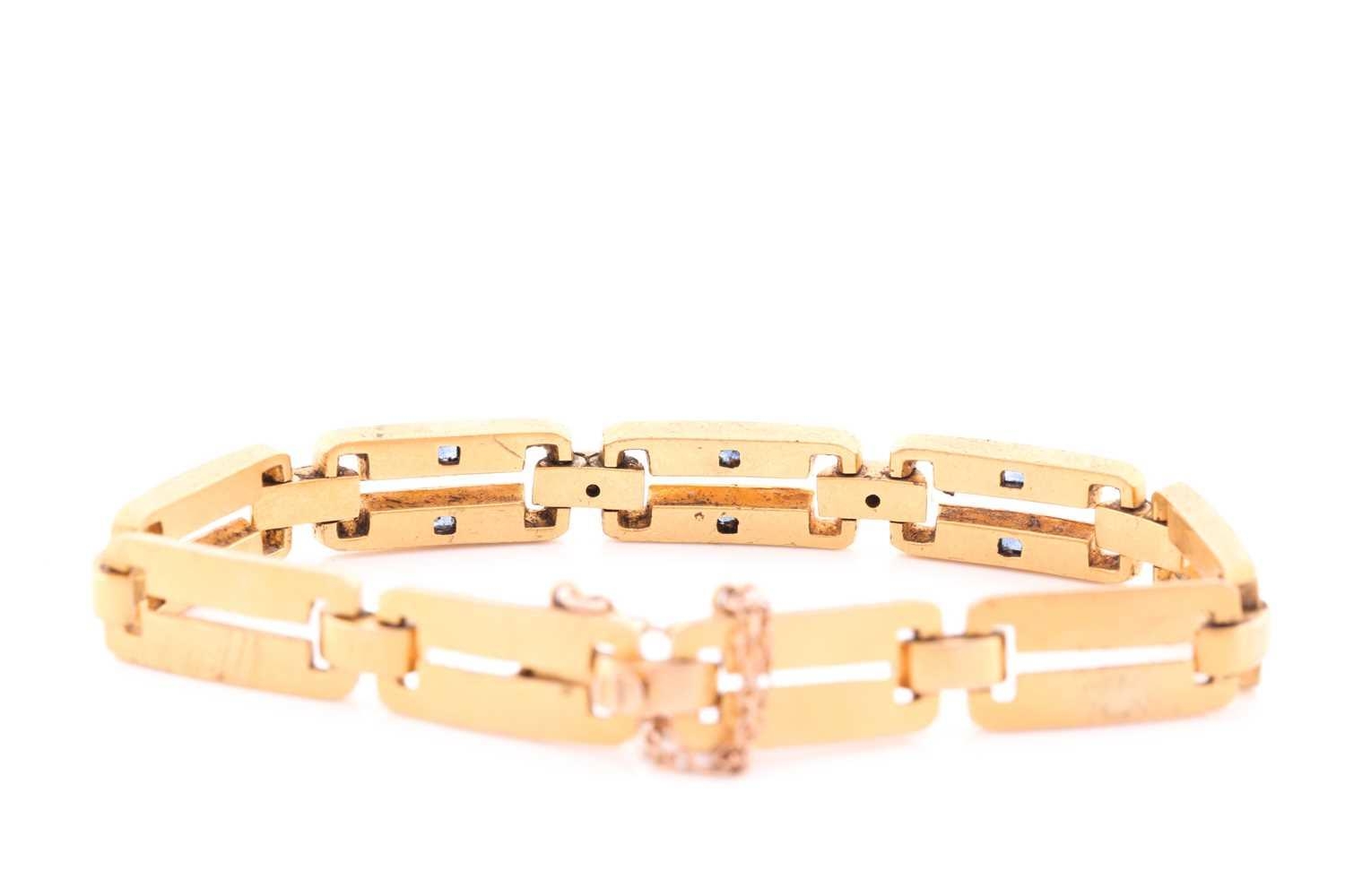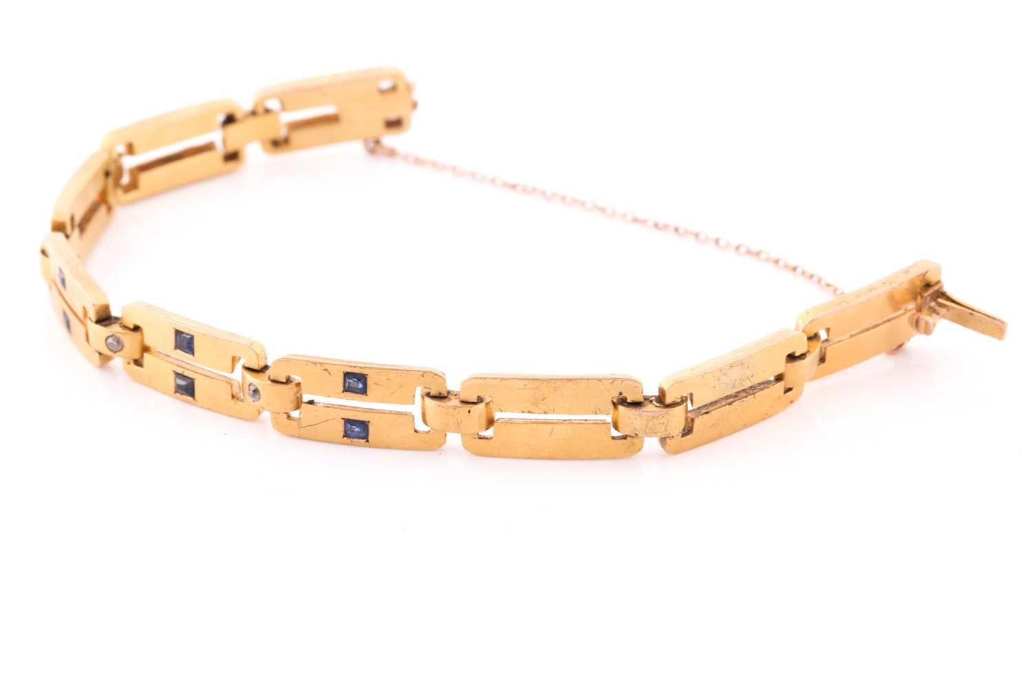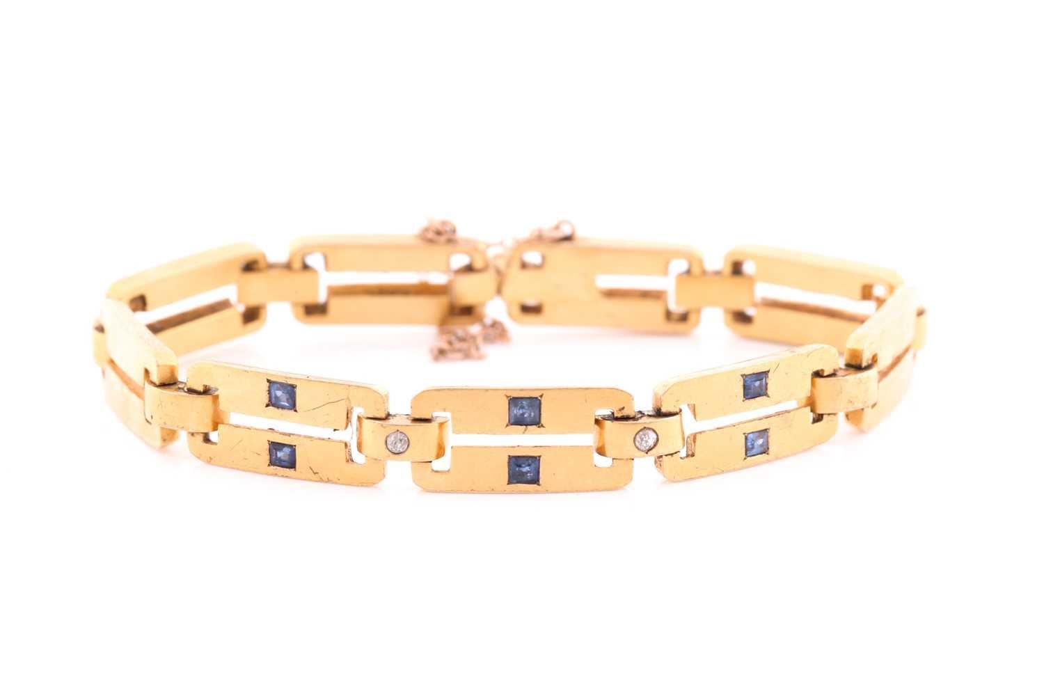 A yellow metal, diamond and sapphire bracelet, comprised of articulated bar links, the three cenral sections inset with square-cut sapphires, and two small diamonds, unmarked, clip fasten with fitted safety chain, approximate length 19 cm.