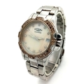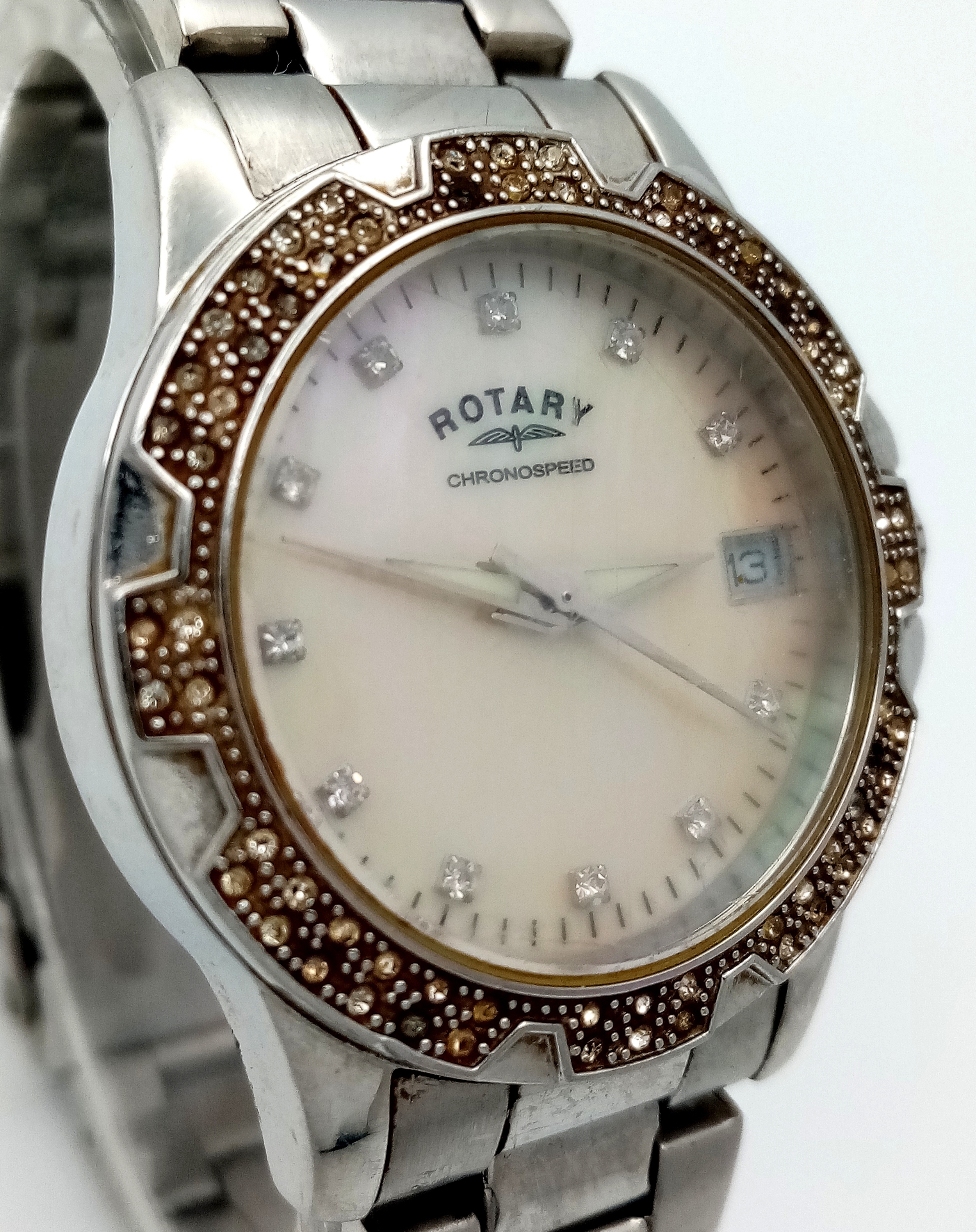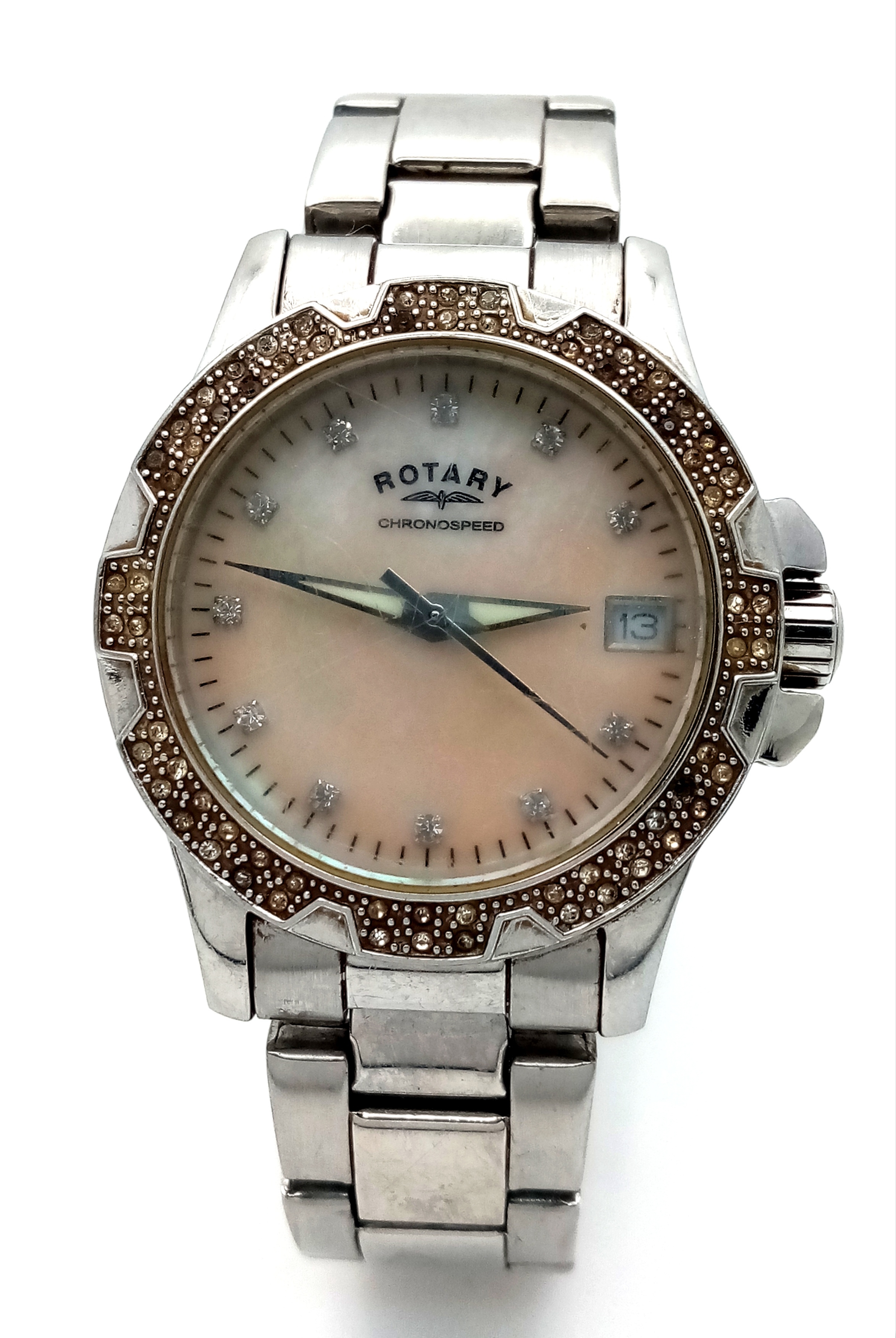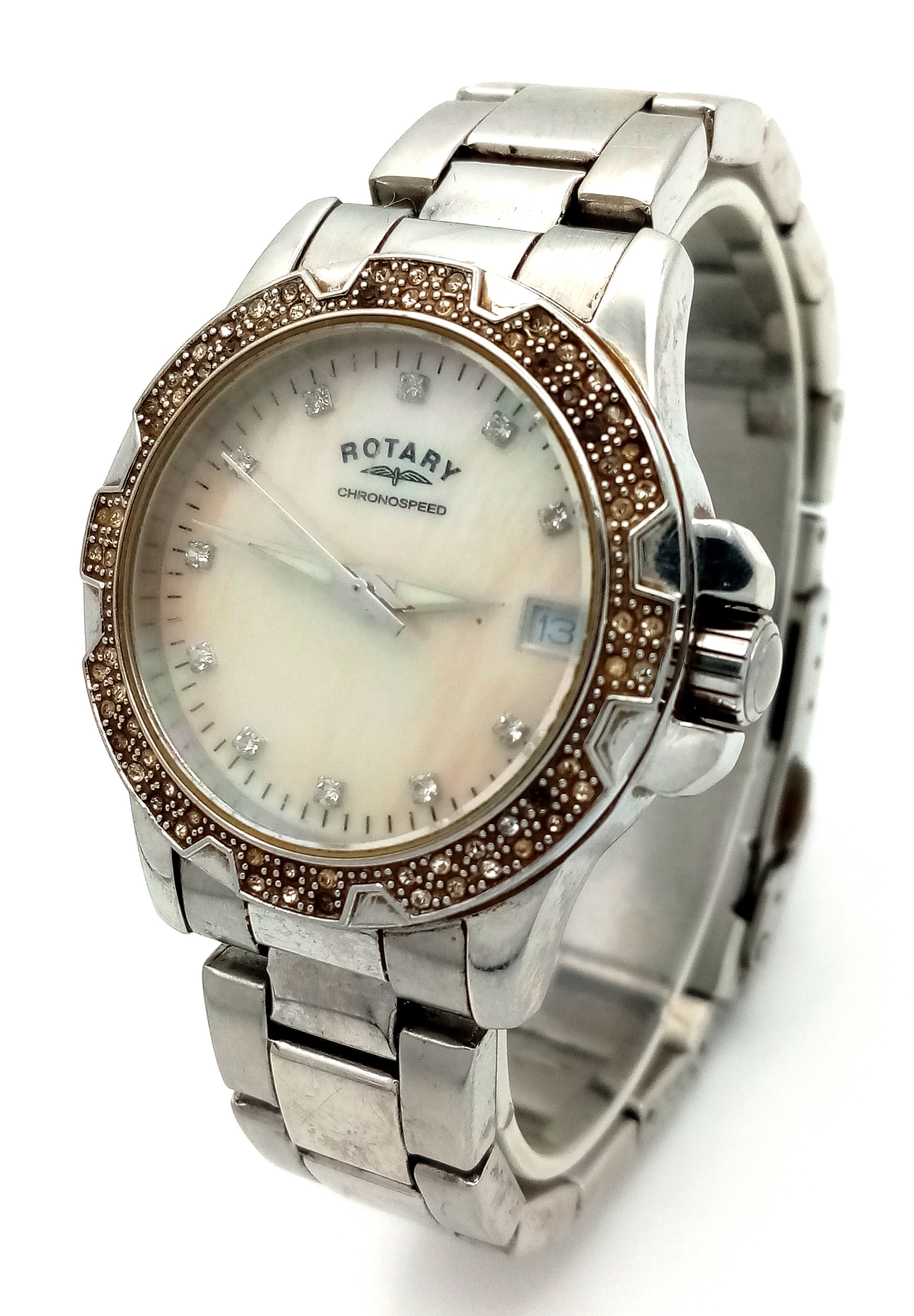 ROTARY STEEL STONE SET BRACELET WATCH WITH DATE FUNCTION AND MOTHER OF PEARL DIAL. IN FULL WORKING ORDER. S/A 1445-2.
