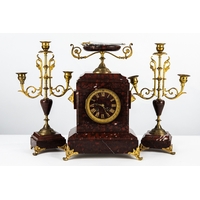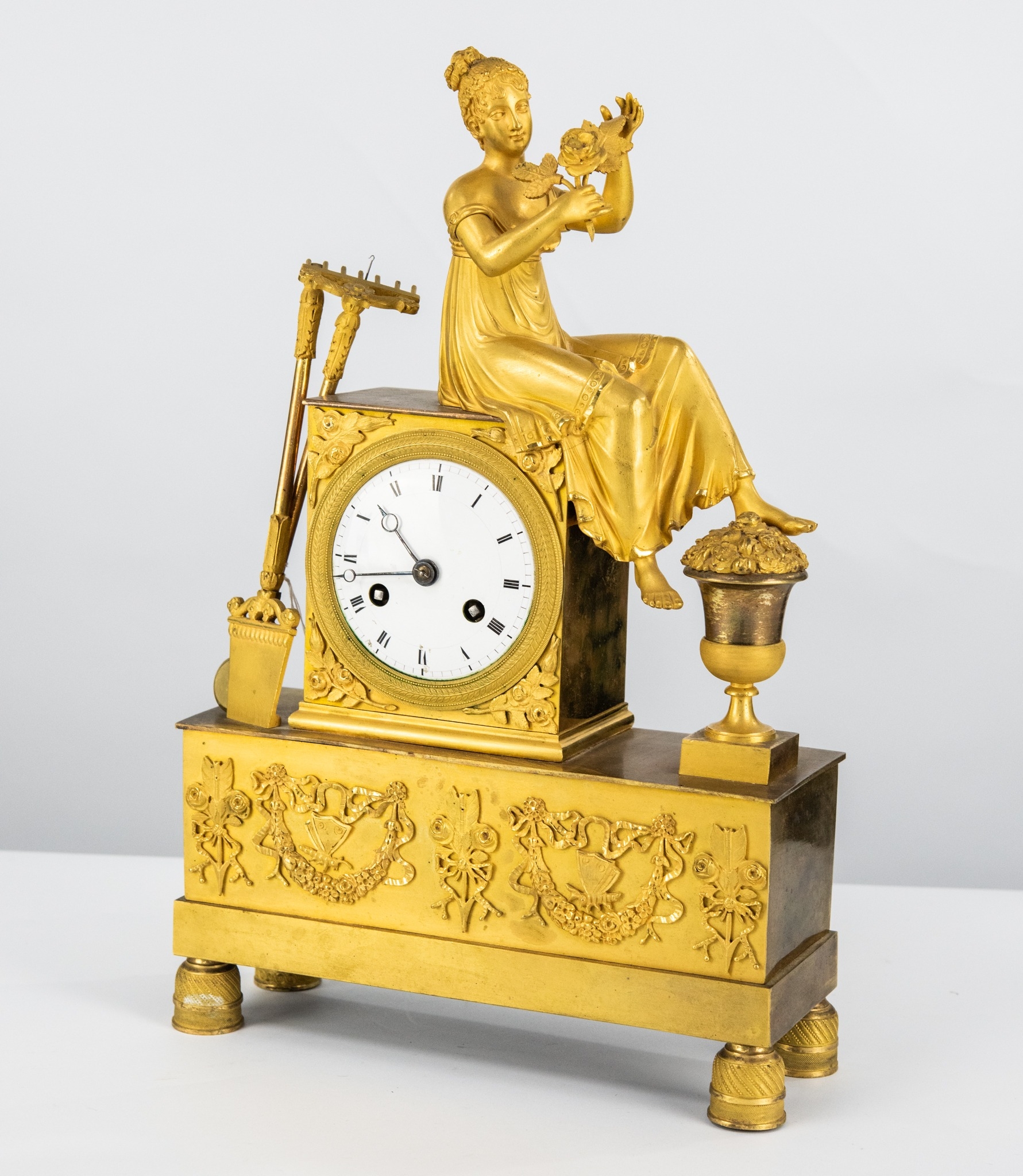 ATTRACTIVE FRENCH EMPIRE PERIOD GILT BRONZE MANTEL CLOCK, the movement striking on a BELL with silk suspended PENDULUM, the case surmounted with a LADY holding a cut flower, her left foot resting upon a FLOWER FILLED GARDEN URN, opposing a GARDEN RAKE and SPADE, the white enamel dial with ROMAN numerals, the rectangular base applied with cast BOWED RIBBON tied FLORAL FESTOONS, BUTTERFLIES and AMATORY symbols, standing on INVERTED FLOWER TUBS, 14 ¾" (37cm) high, with PENDULUM