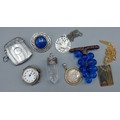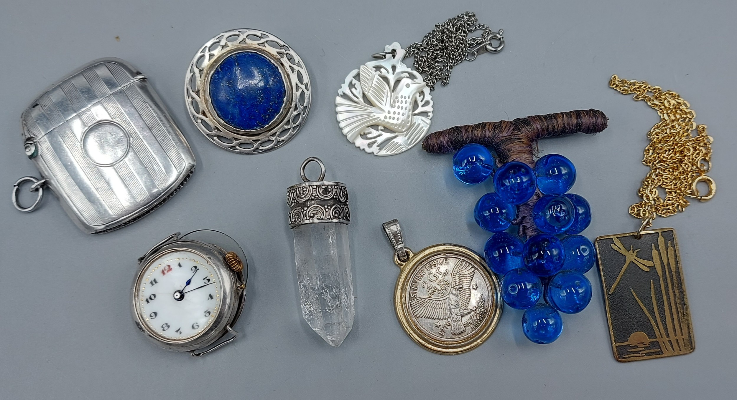 A Birmingham silver vesta case by William Hair Haseler, with engine turned decoration together with a silver cased watch four pendants and two brooches