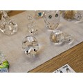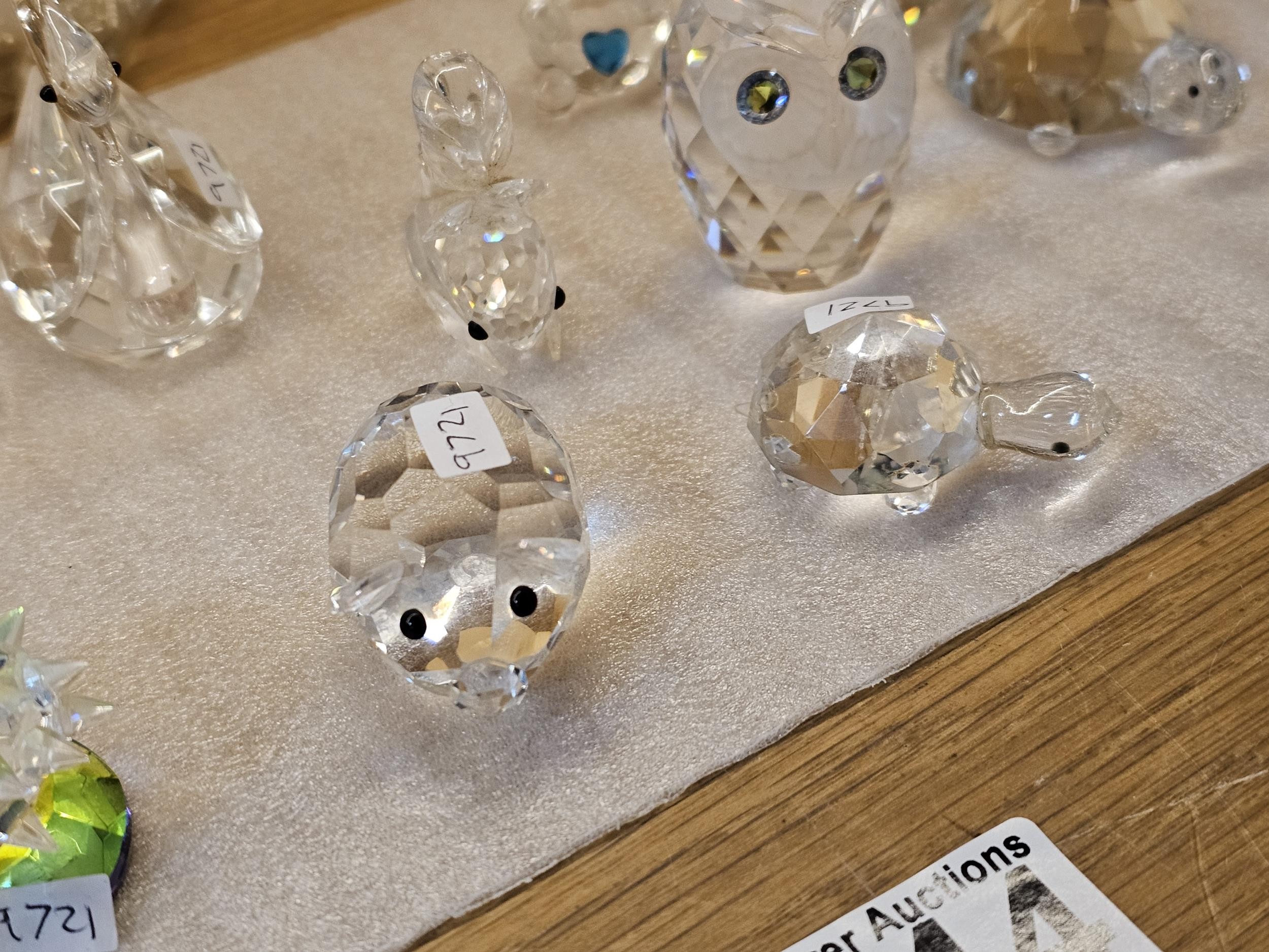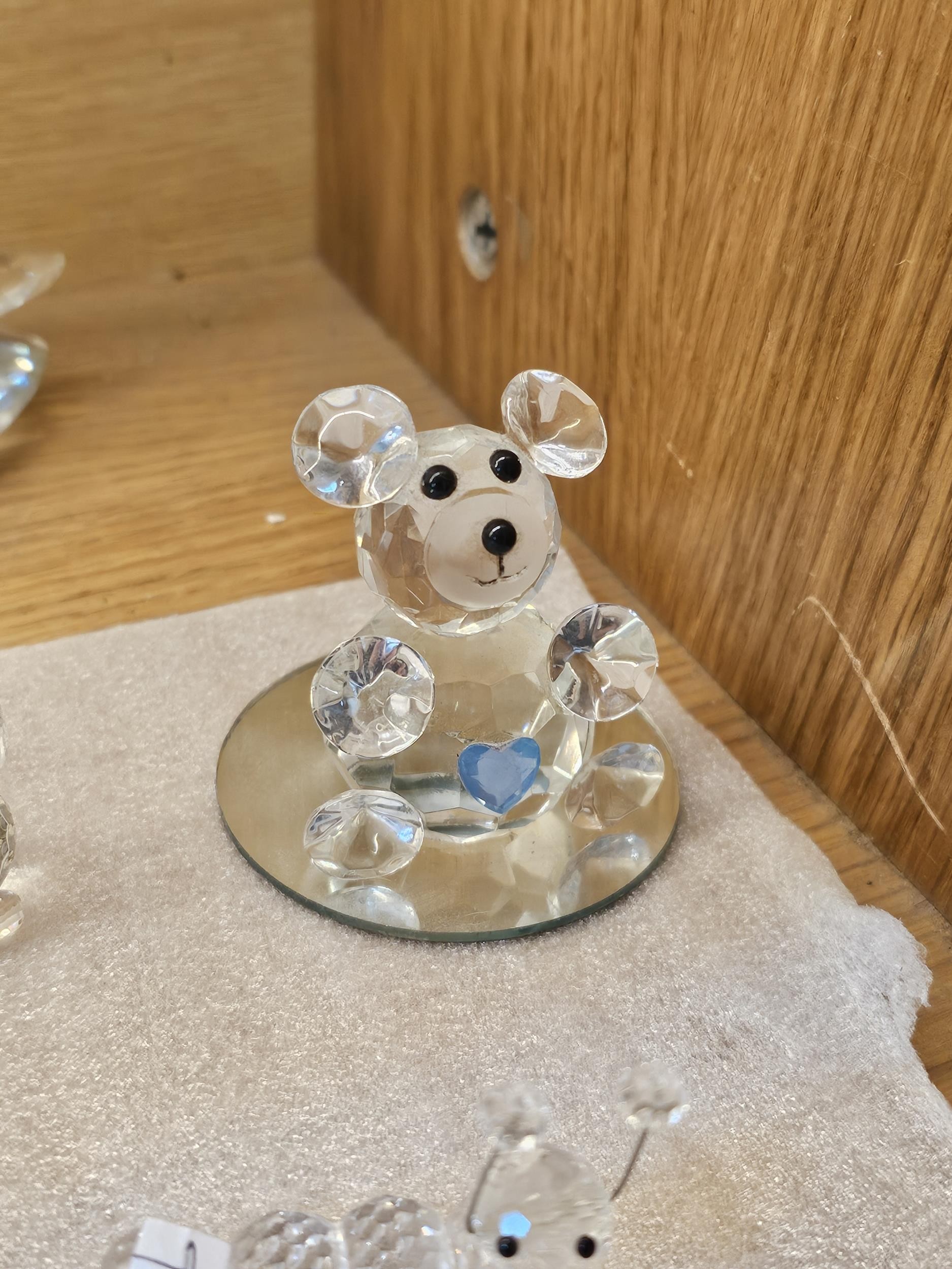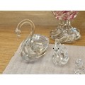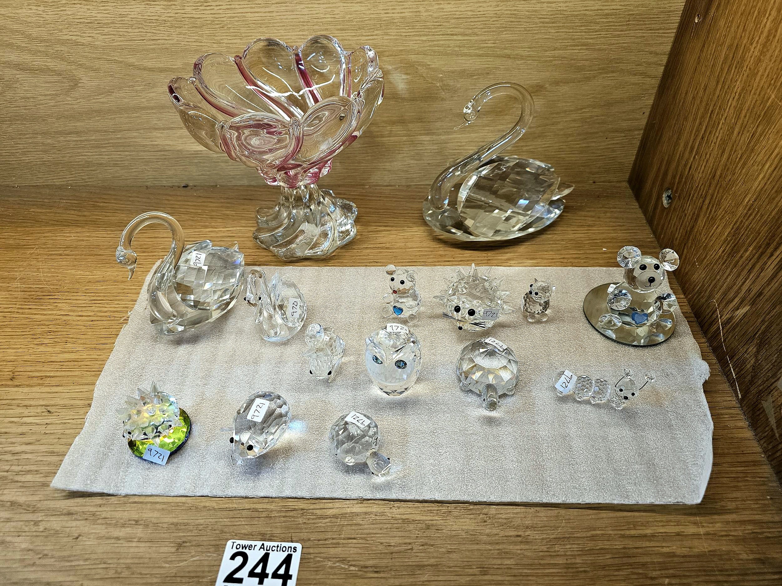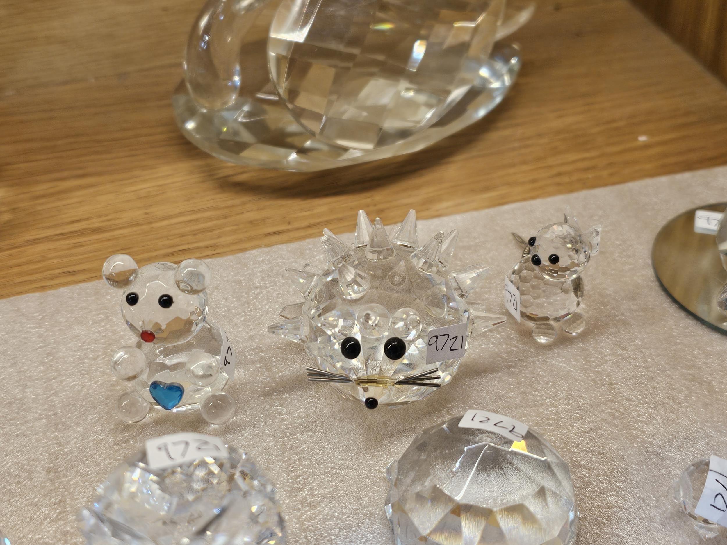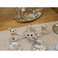 A large collection of glass figures all hand made covering various birds and animals to include an hedgehog, pig, owl, turtle, Caterpillar, squirrel along with a graduated set of three swans, 2x teddy bears with blue hearts and a good quality pink and clear glass pedestal bowl with fluted edges