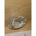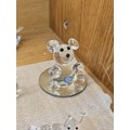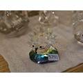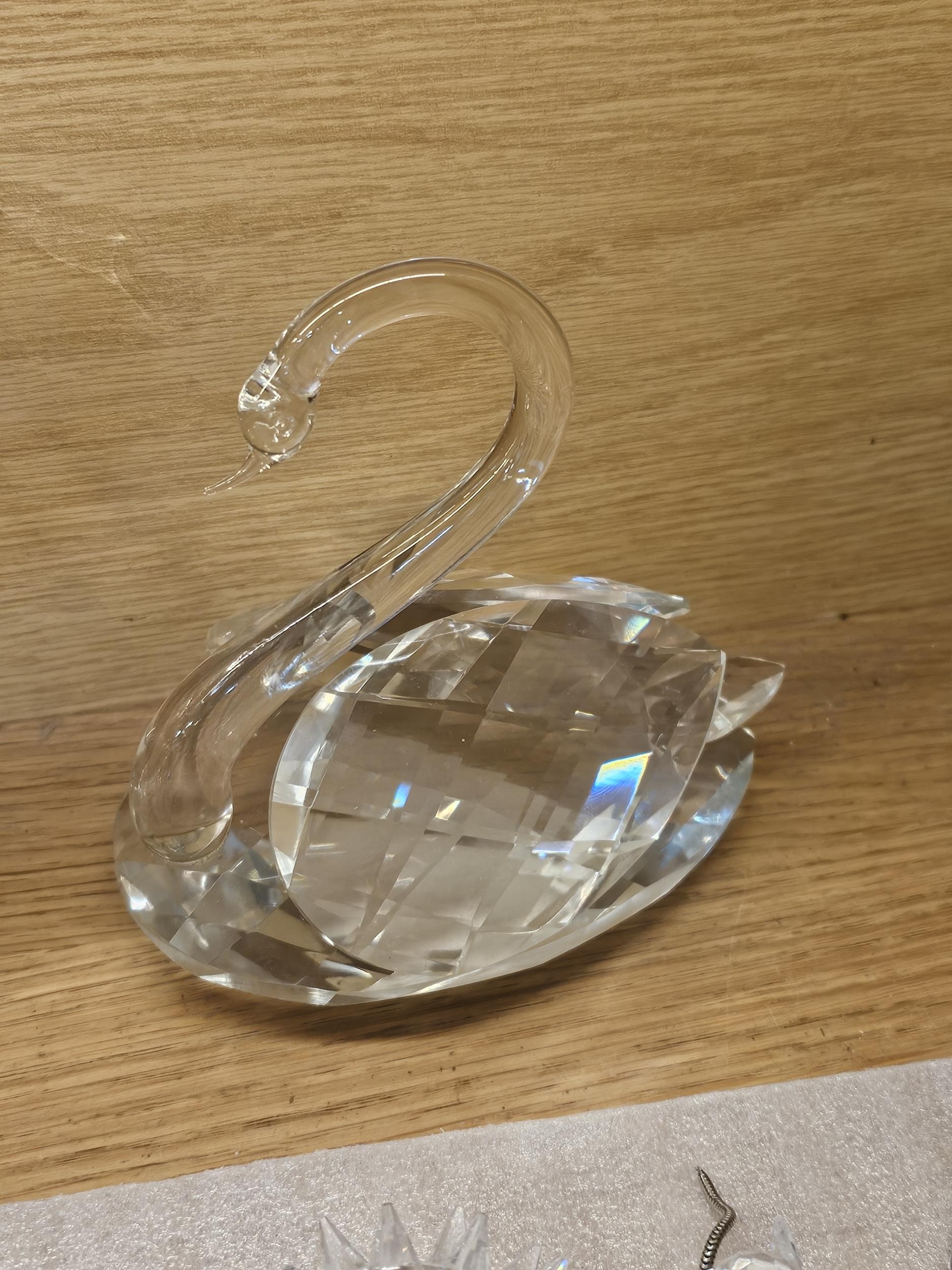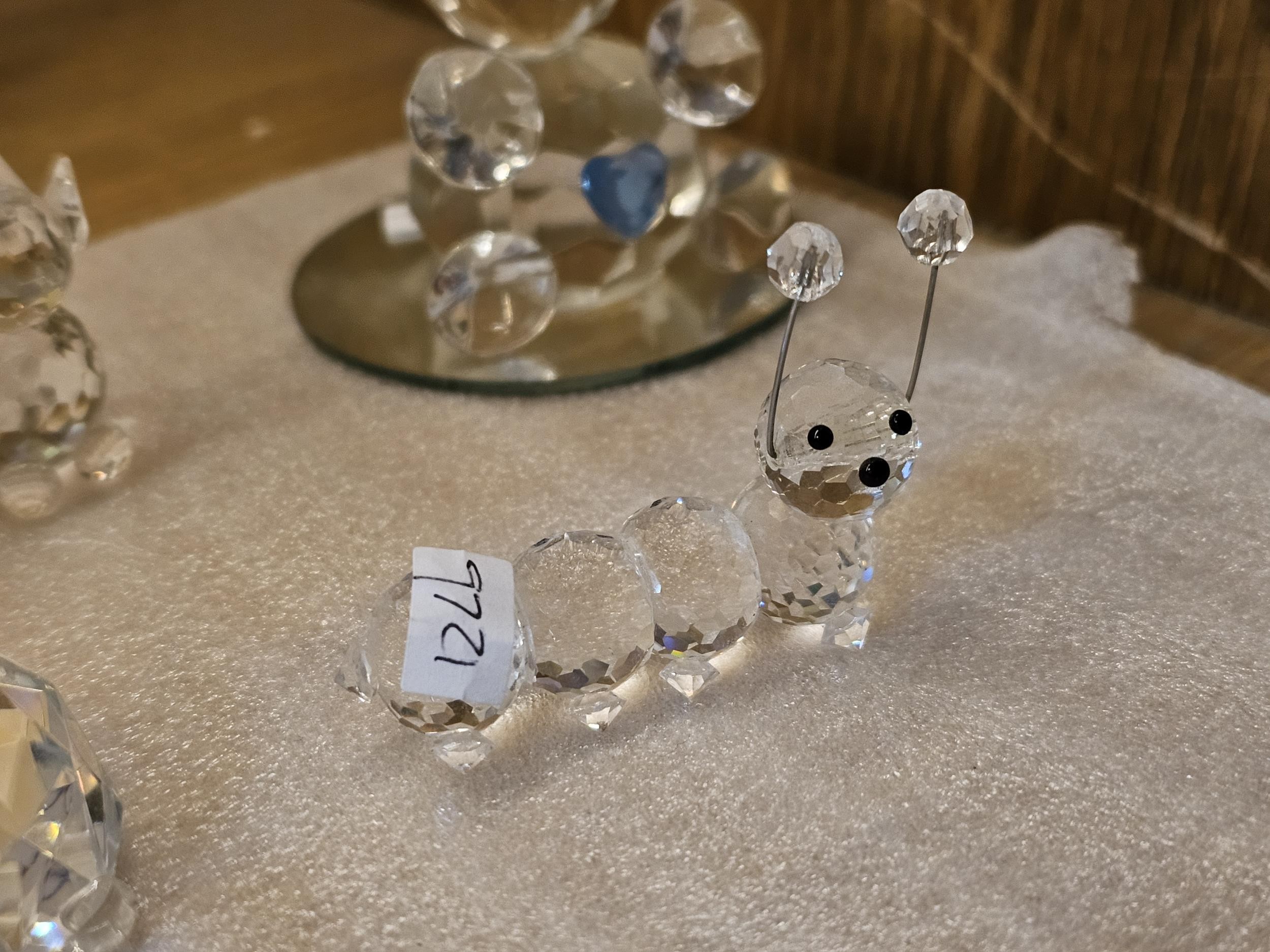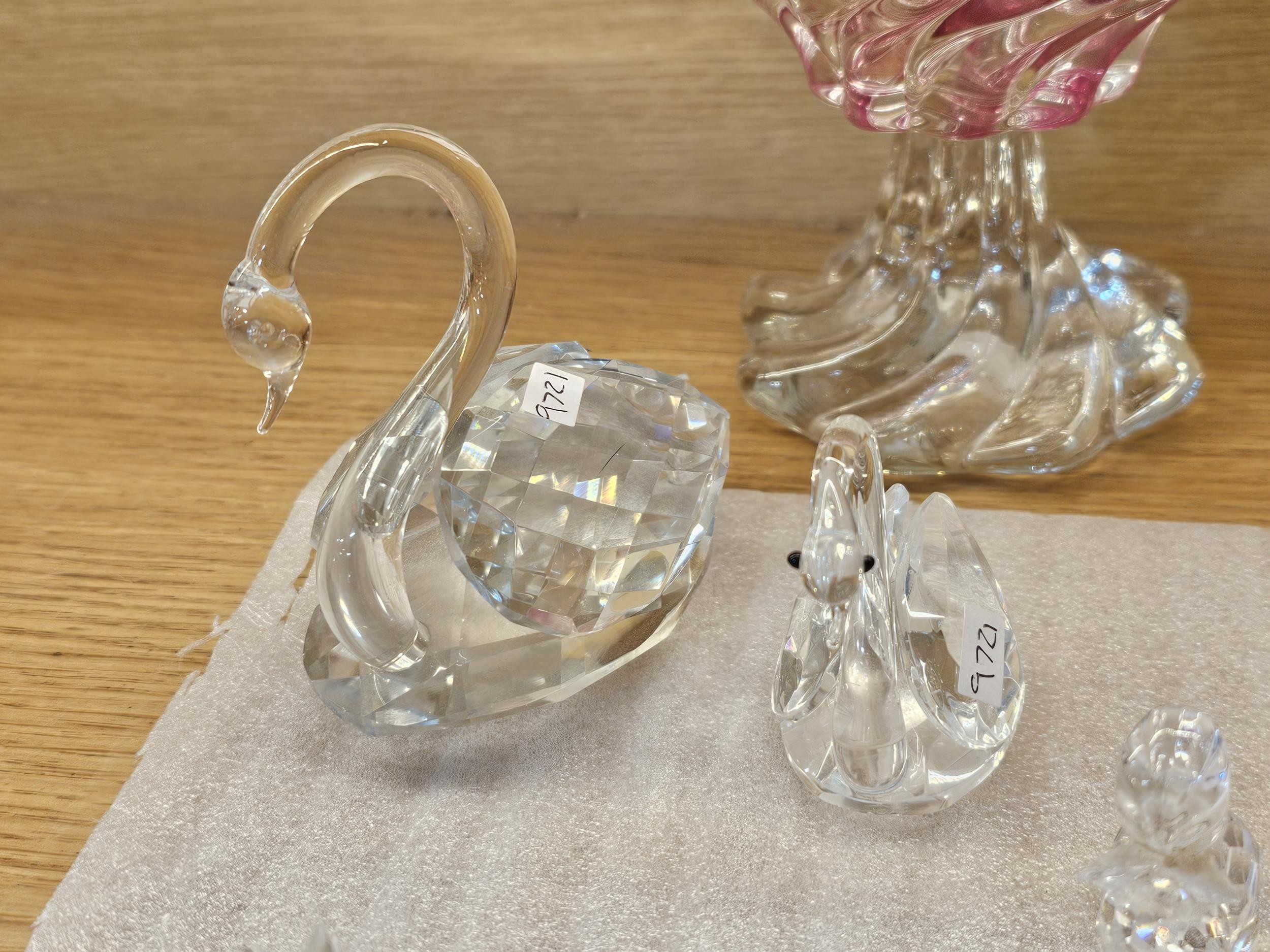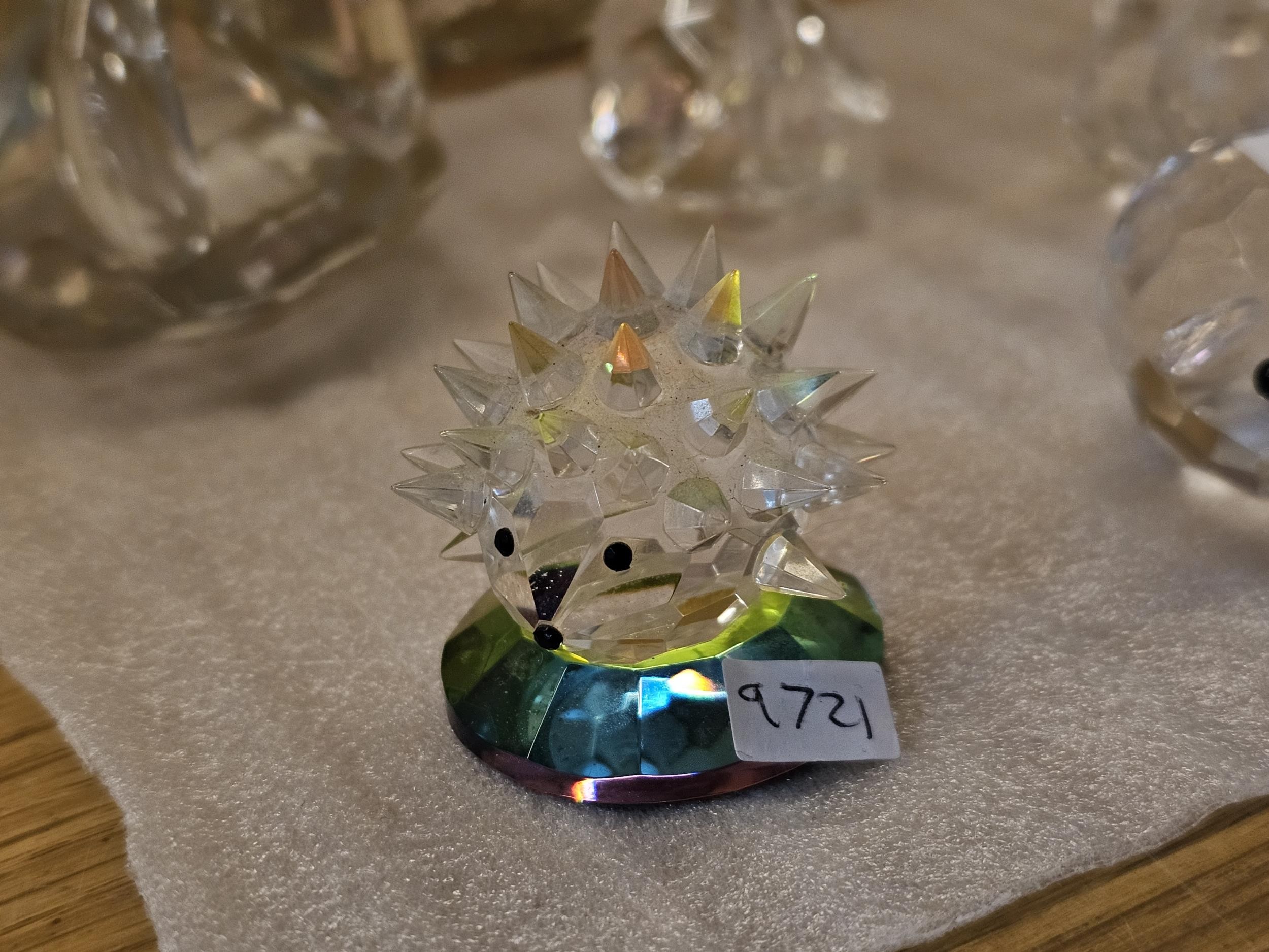 A large collection of glass figures all hand made covering various birds and animals to include an hedgehog, pig, owl, turtle, Caterpillar, squirrel along with a graduated set of three swans, 2x teddy bears with blue hearts and a good quality pink and clear glass pedestal bowl with fluted edges
