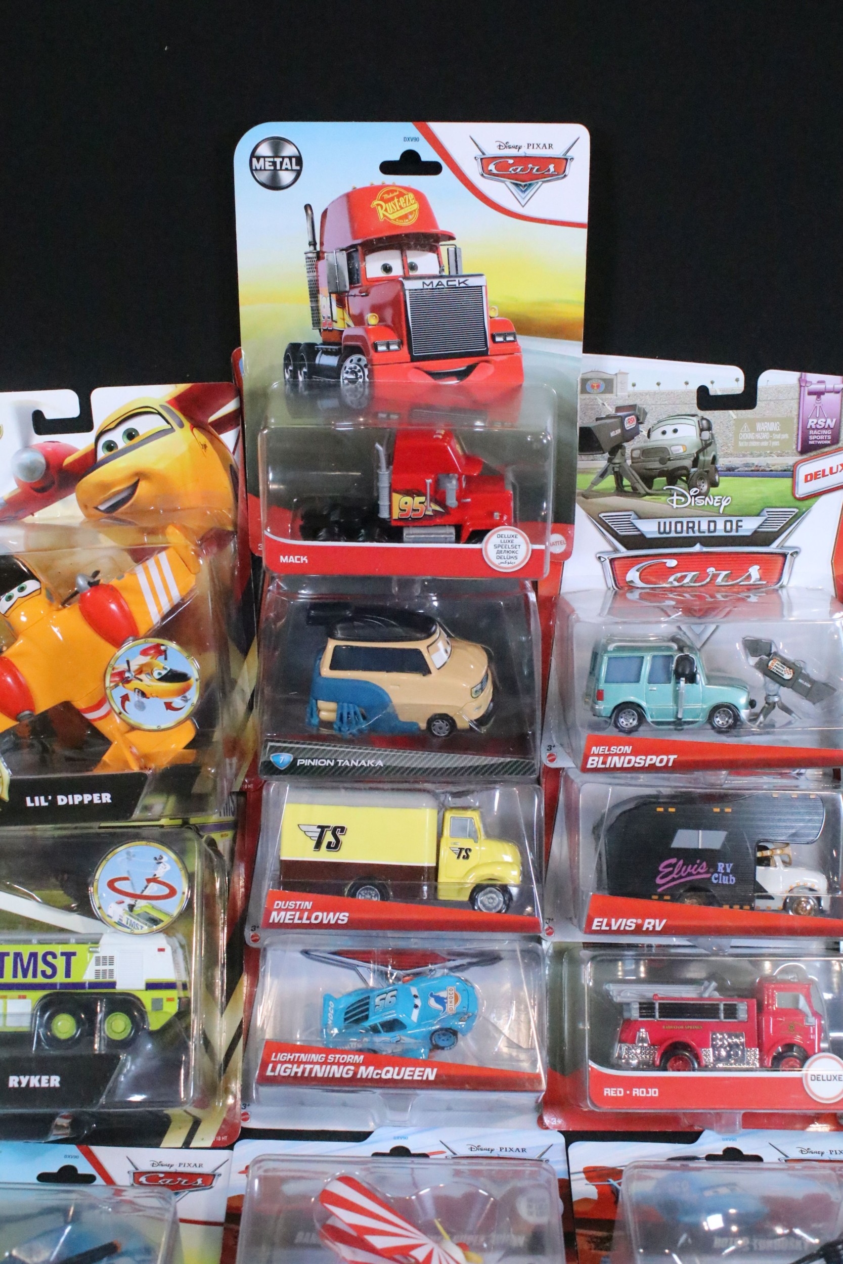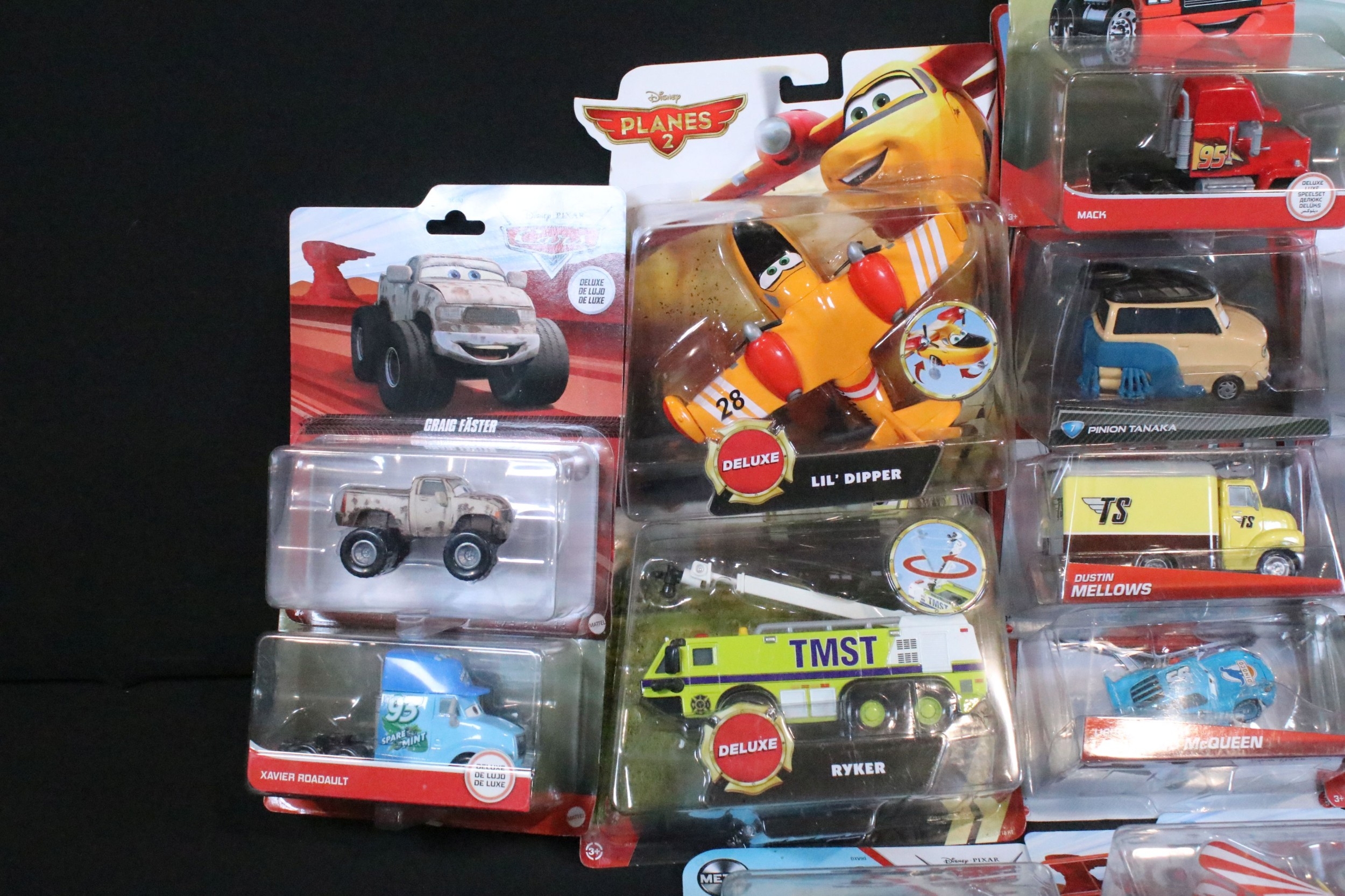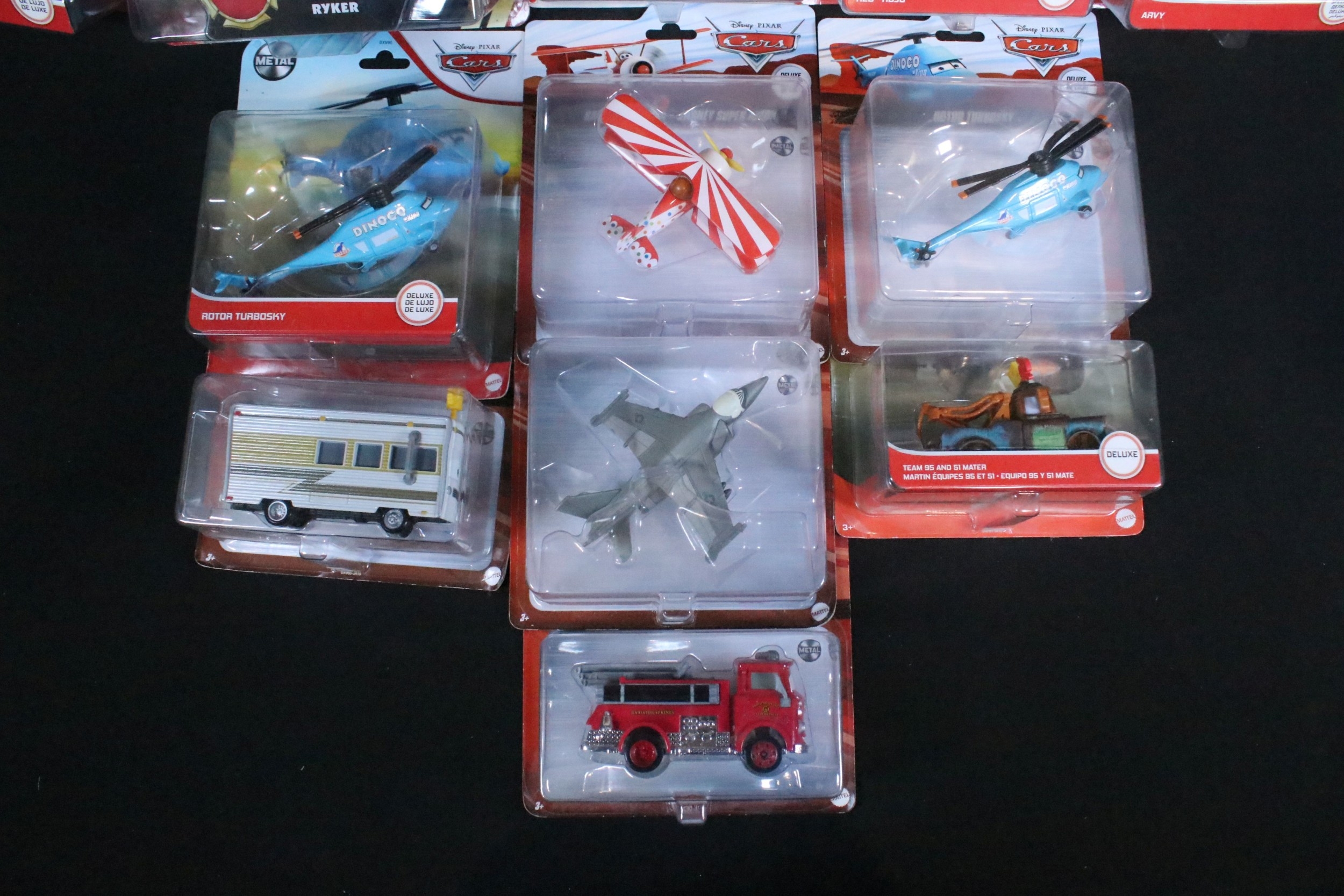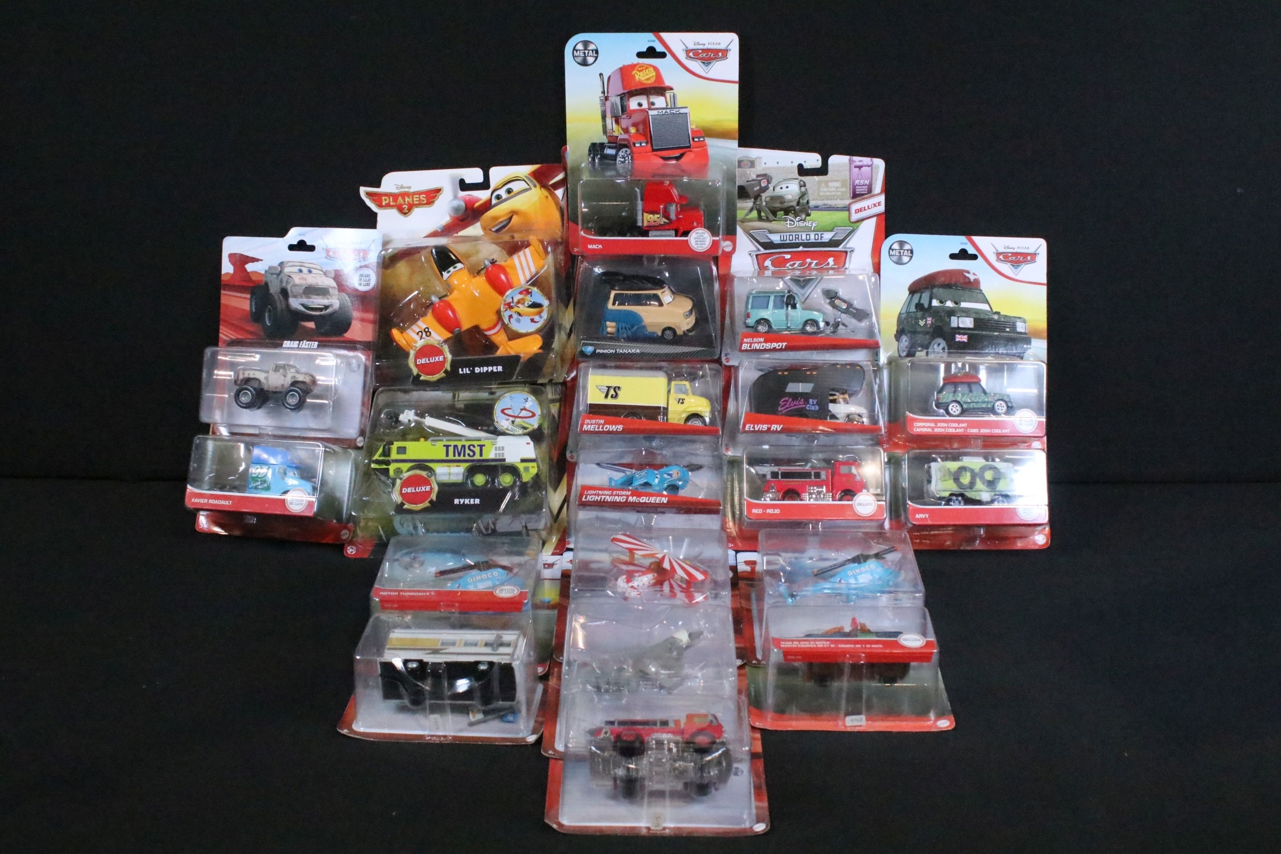 20 Boxed / carded Mattel Disney Pixar Cars Deluxe diecast models to include World Of Cars, Racing Sports Network, Piston Cup, 95 Lightning McQueens, Retro Radiator Springs, Planes 2, etc, all ex