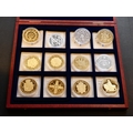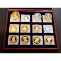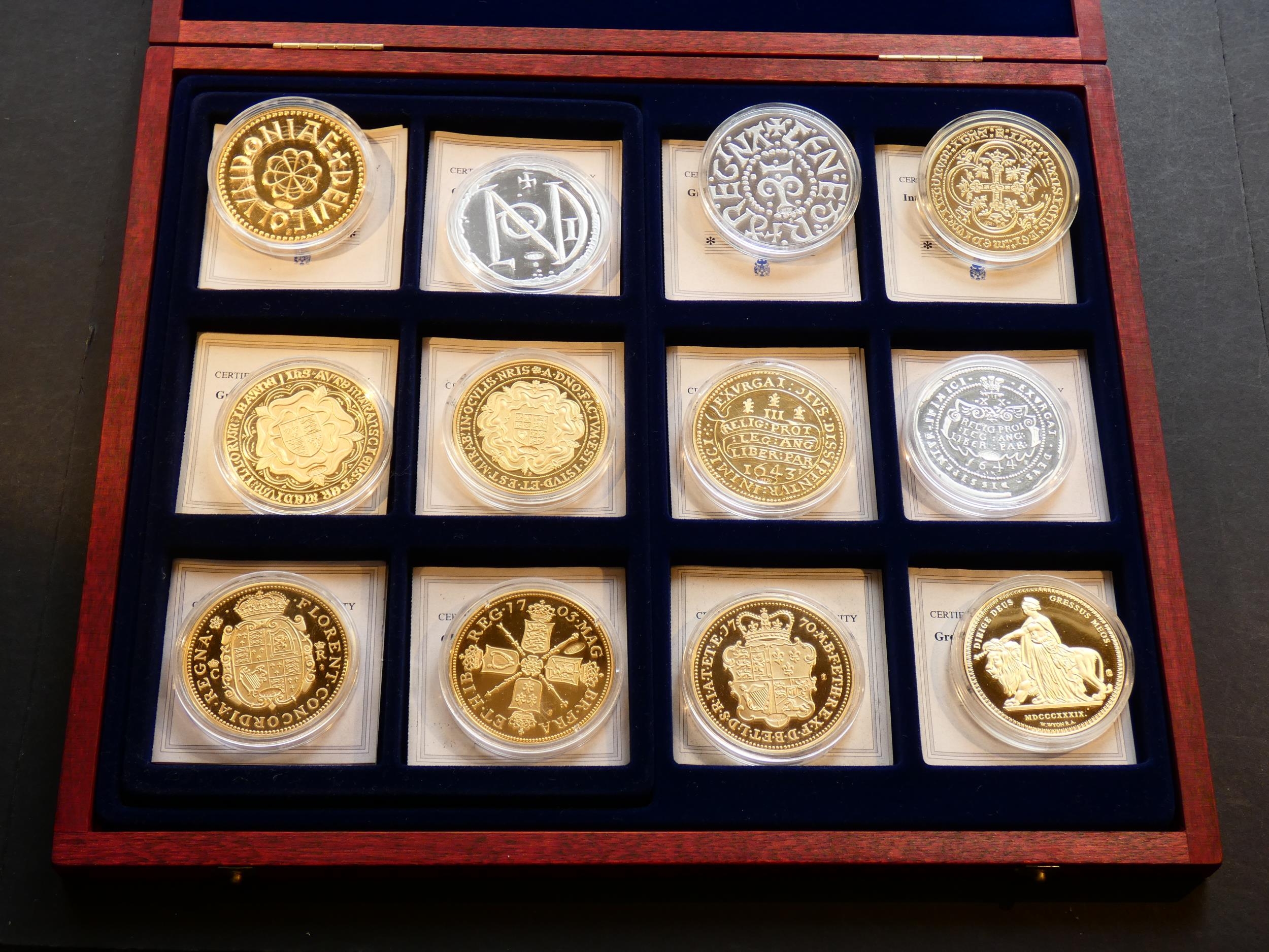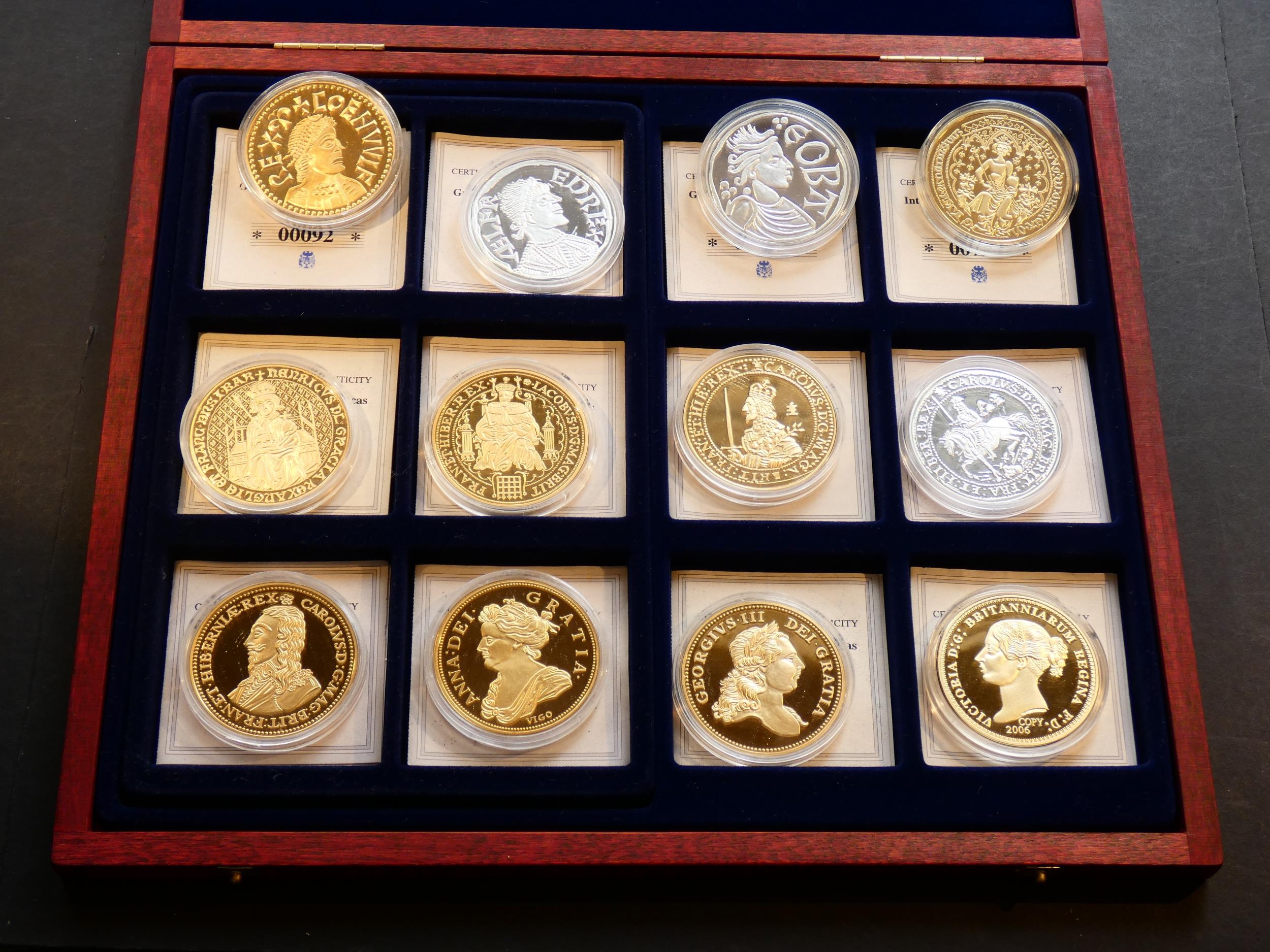 REPLICAS. "Great British Coin Replicas", collection of twelve silver-plated or gilt replicas of historic British coins, including Coenwulf gold Penny, Alfred the Great LONDON monogram Penny, Queen Cynethryth silver Penny, Edward III Double Leopard, Henry VI Sovereign, James I Rose Ryal, Charles I Triple Unite, Charles I Oxford Crown of 1644, Charles I pattern gold 5 Unite, 1703 VIGO 5 Guineas, pattern 5 Guineas of 1770, and £5 1839 "Una & the Lion", each 40mm, silver-plated or gilt Proofs, FDC, marked COPY, in wooden presentation box, with certificates.