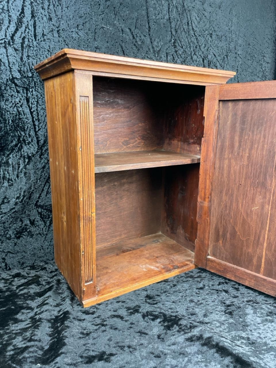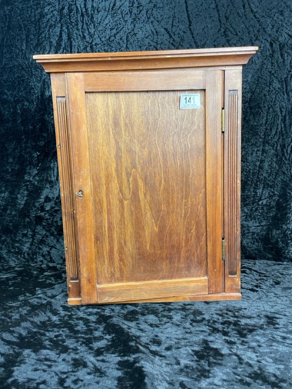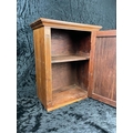 Handy little vintage wall-hanging cupboard with shelf and key. Approx H46cm x W34cm x D20cm.