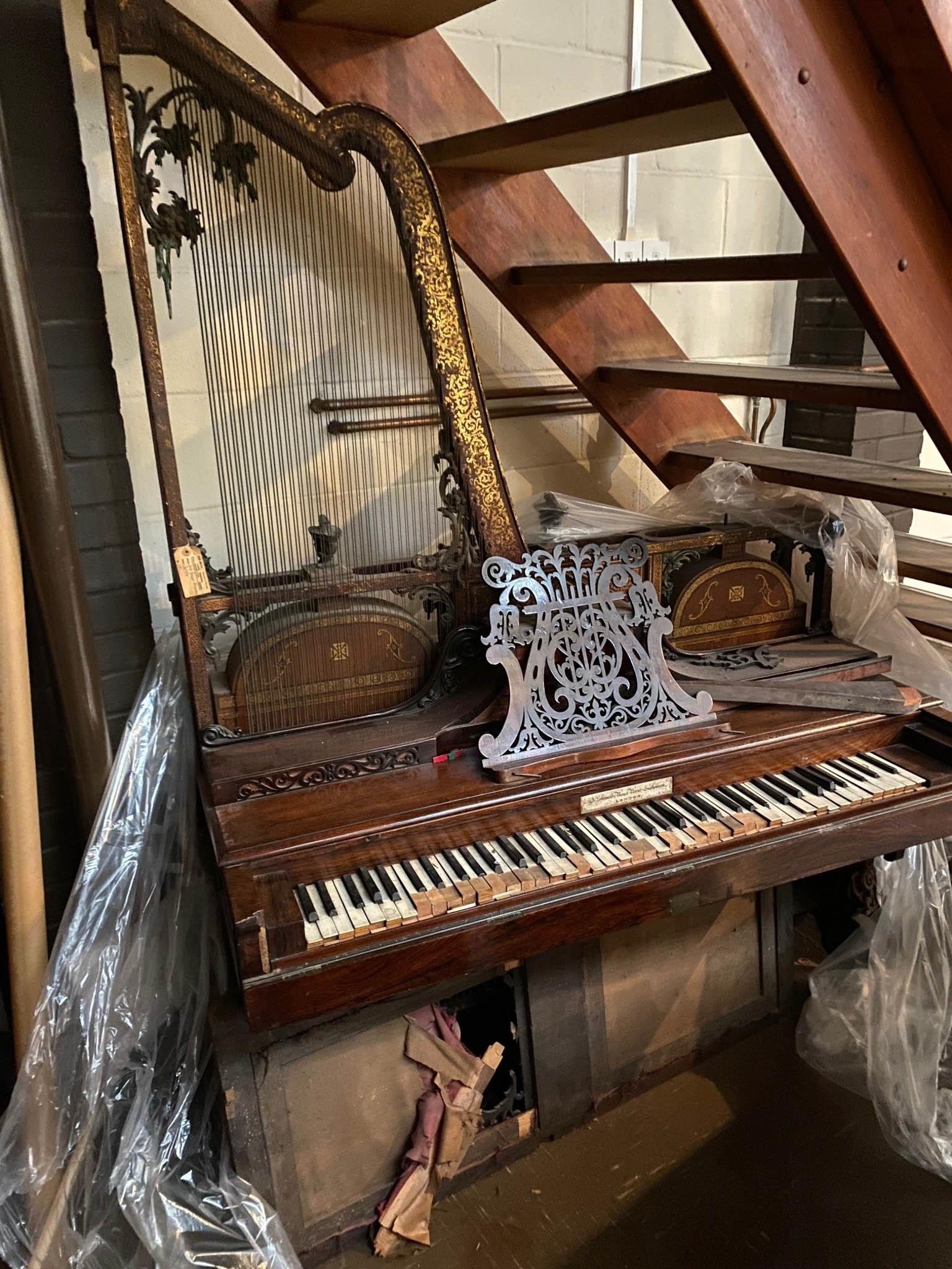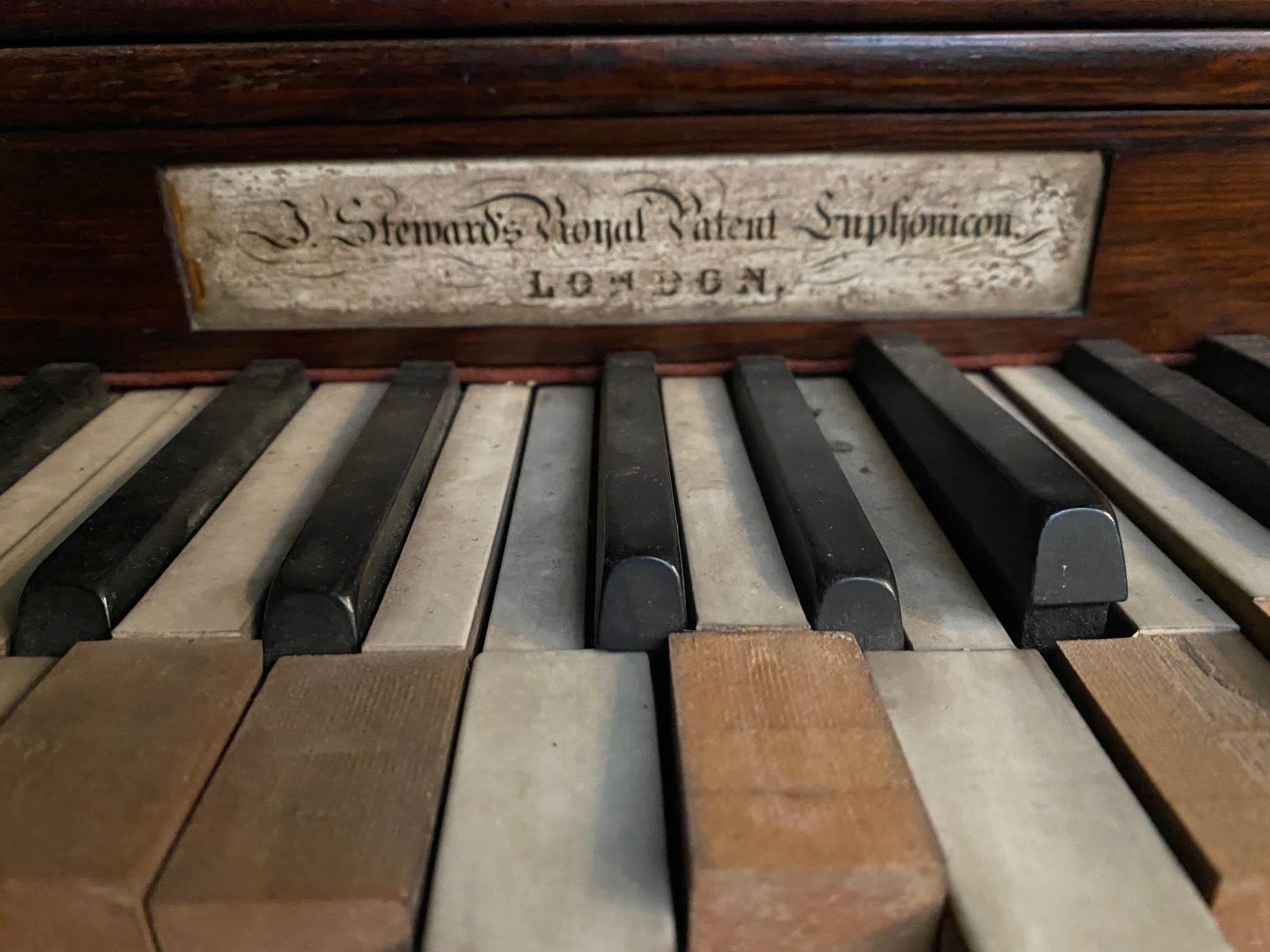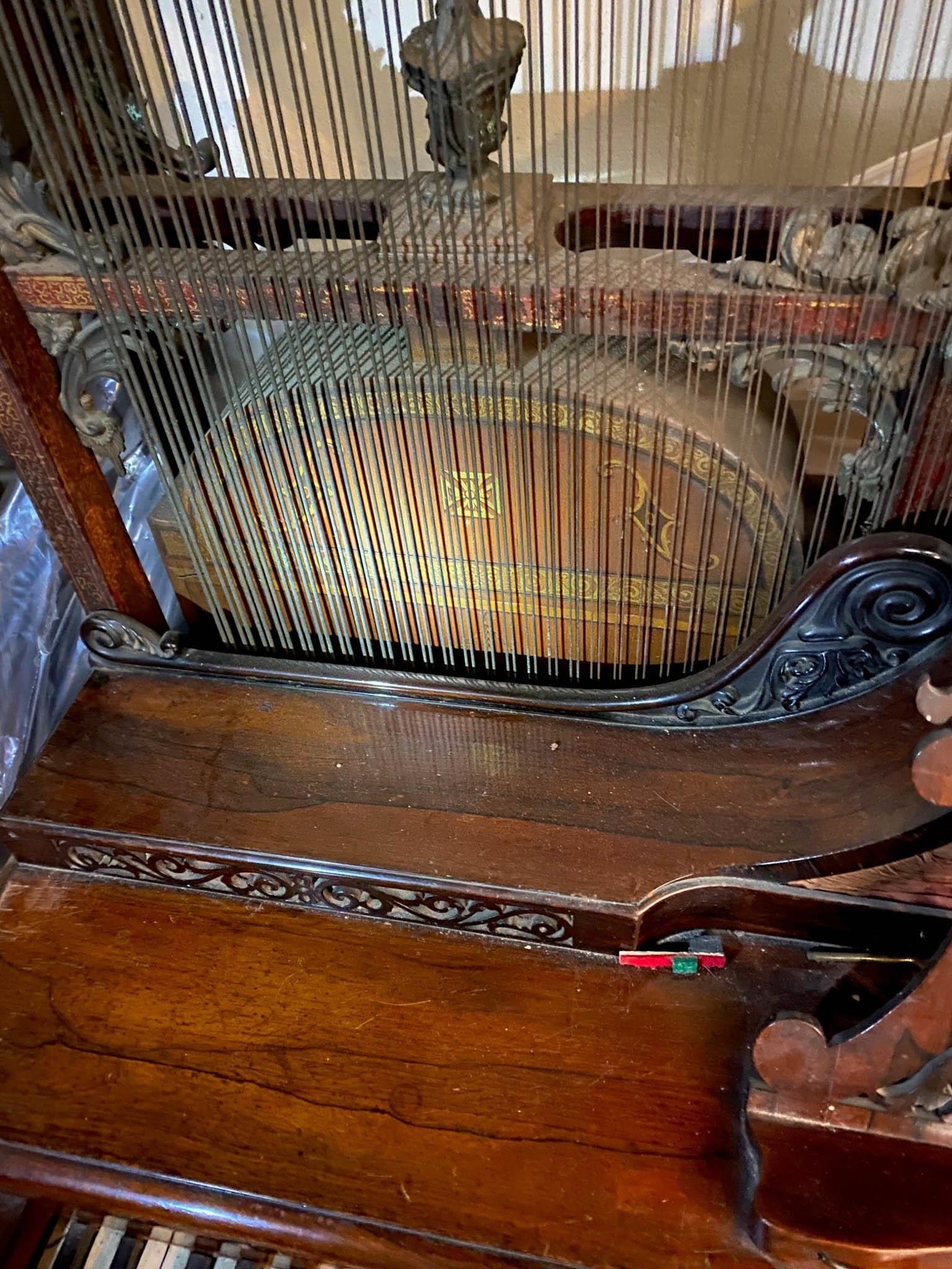 A rosewood and gilt painted upright harp Euphonicon. The fascia board inscribed 'J Steward’s Royal Patent Euphonicon London'. A very similar example can be seen at the Metropolitan Museum. IRN: MDFNW1UB