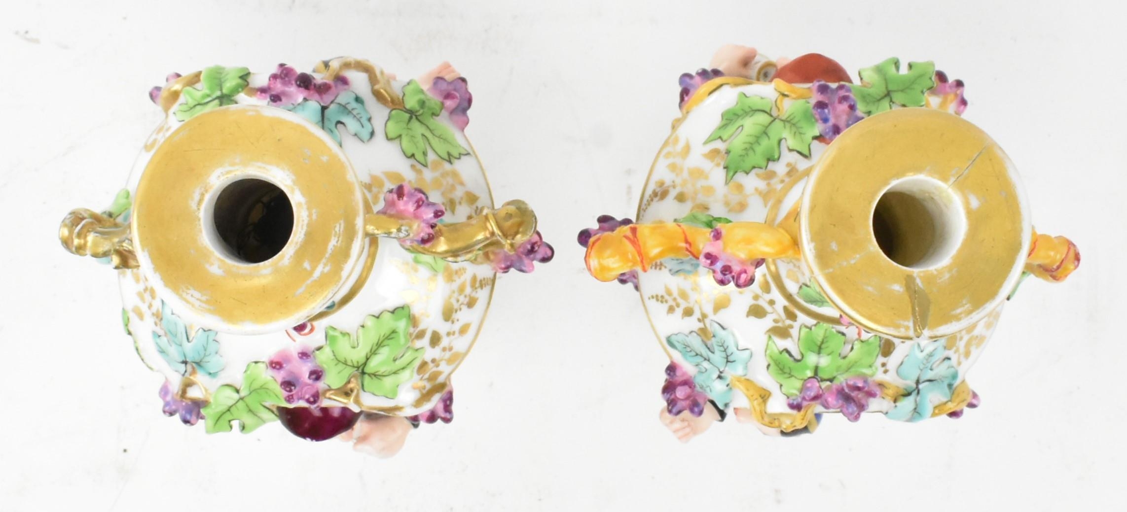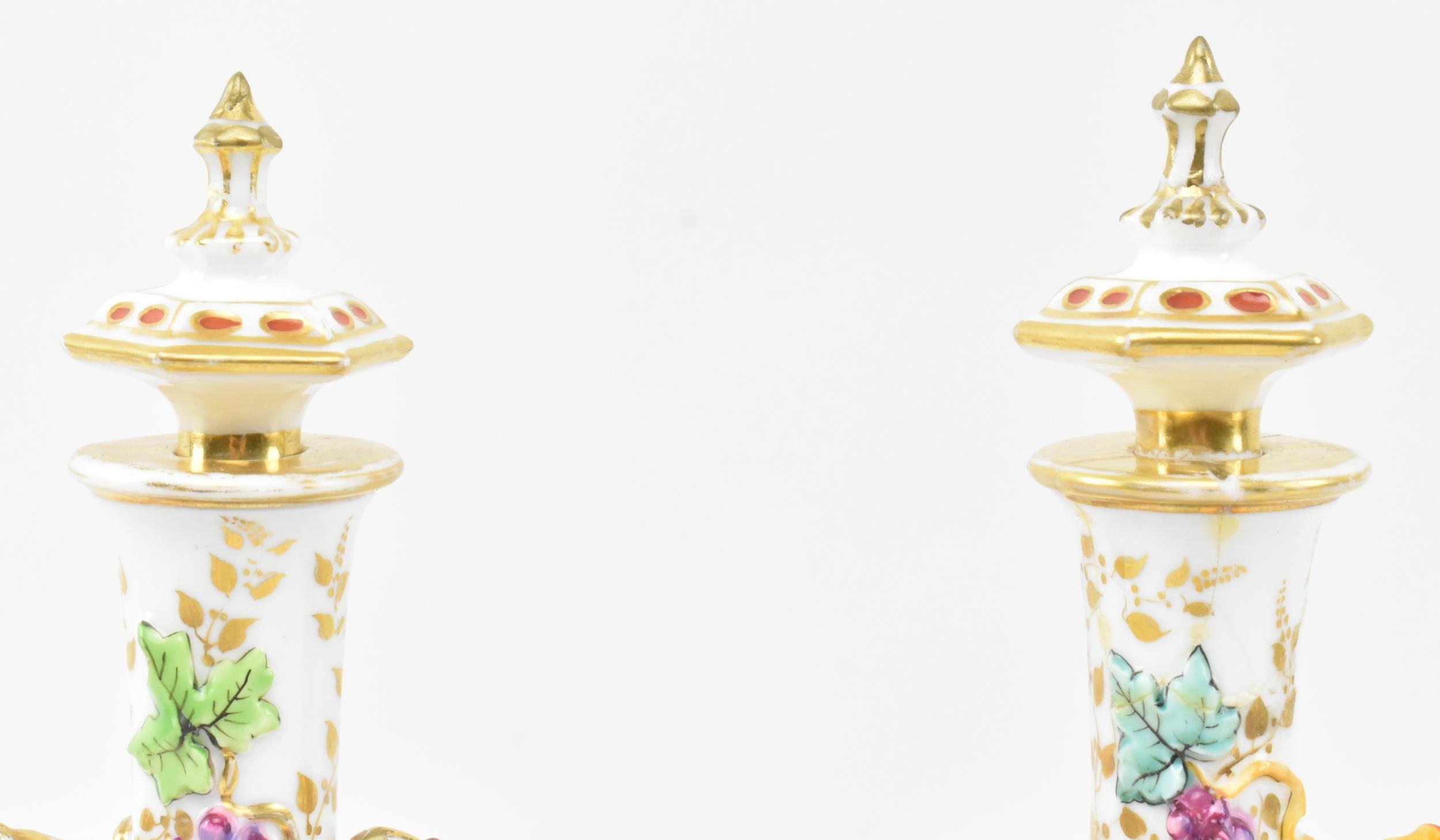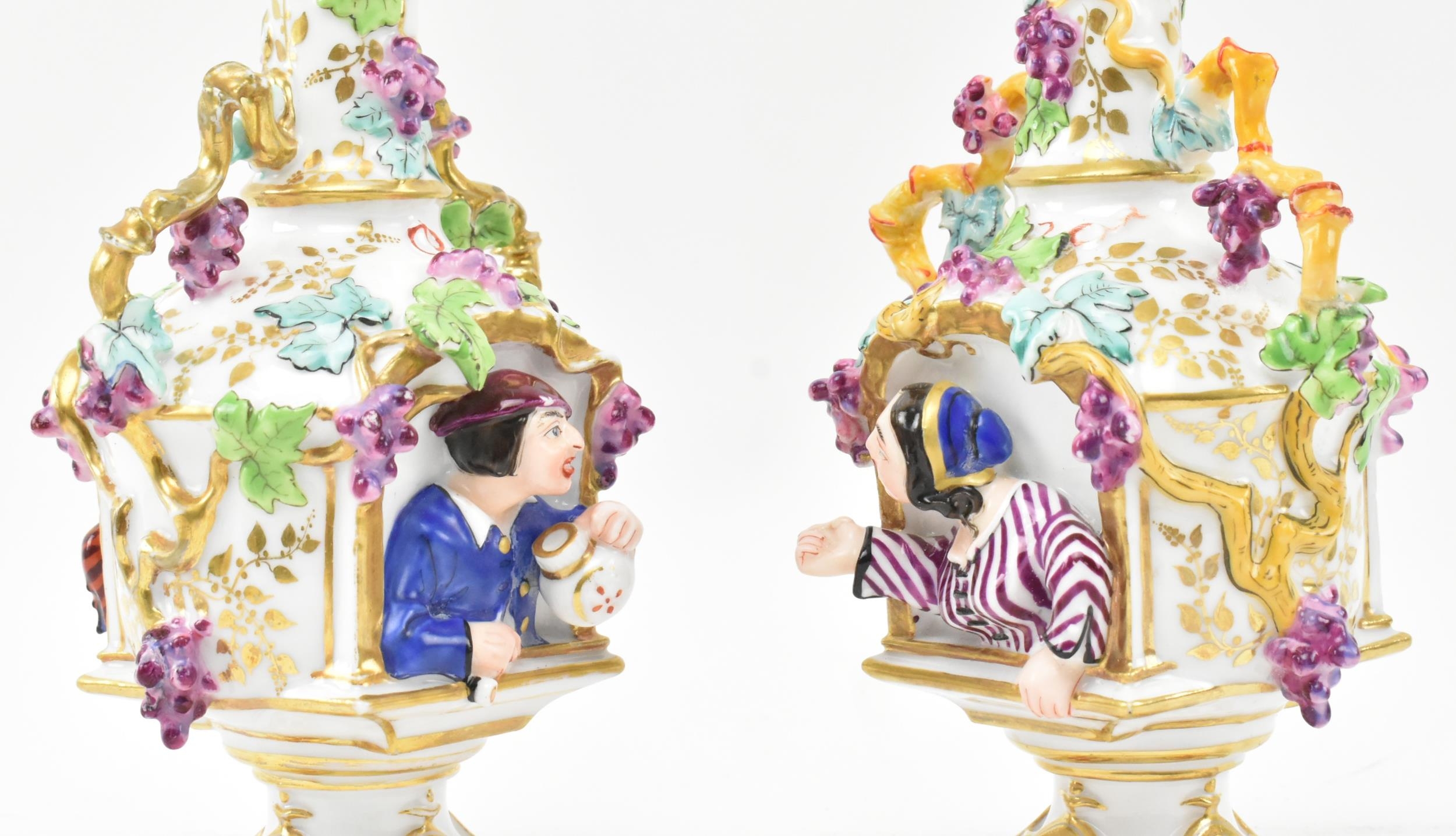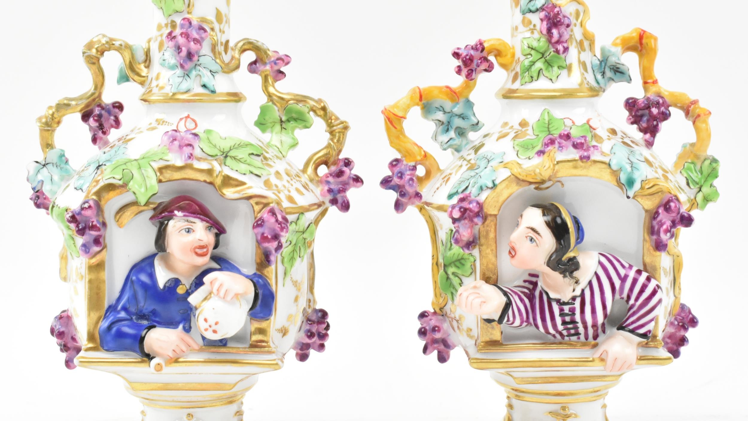 A pair of large believed French continental early 20th century hand painted fine bone china scent bottles in the manner of Jacob Petit. Each having a shaped stopper over a flared neck with bamboo & grape's vines shaped handles. Each bottle depicting a woman and man protruding from a window. Raised on circular moulded foot. Unmarked. Some repairs present. Each measures approx. 24cm x 11cm x 11cm.