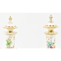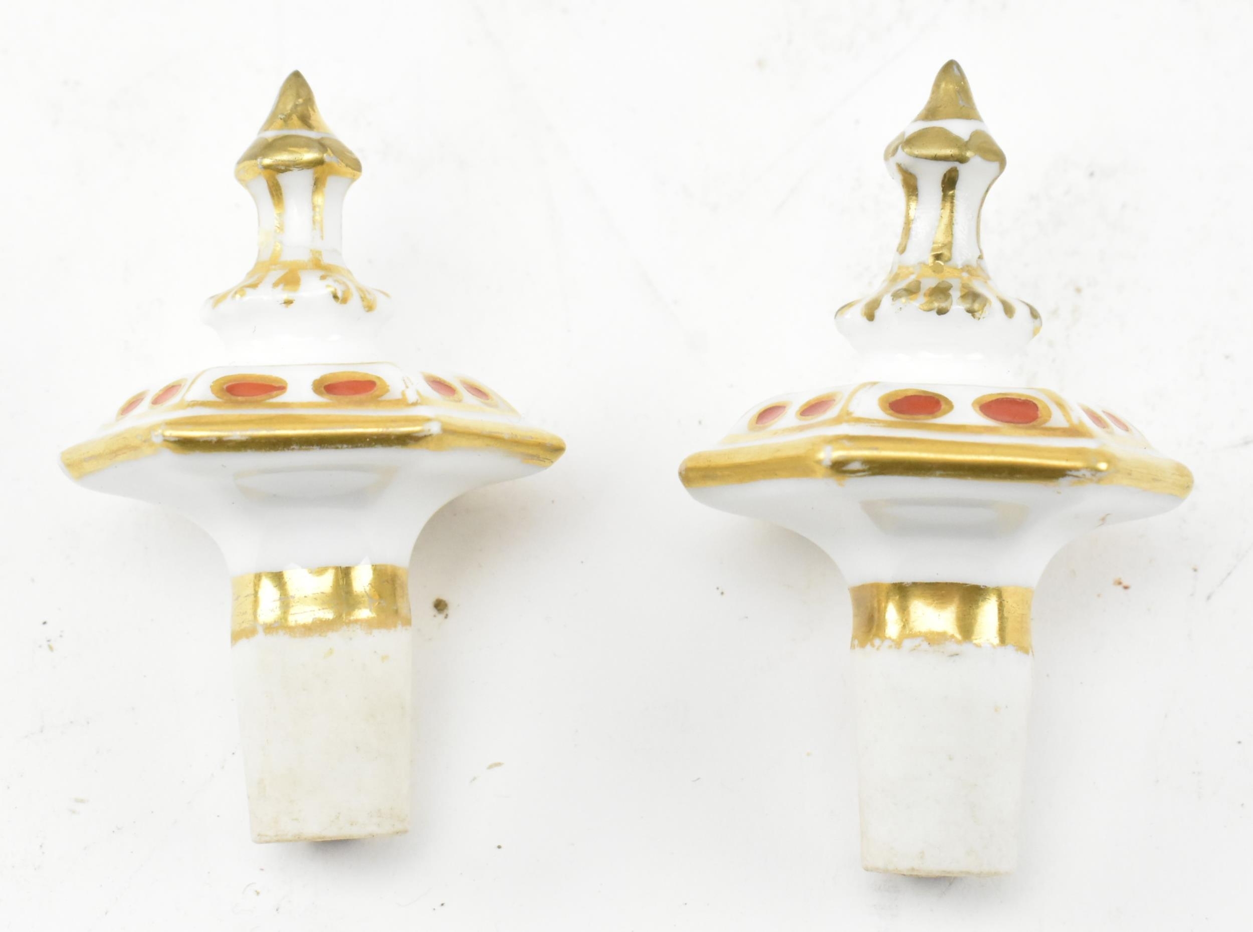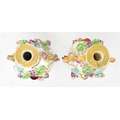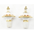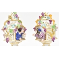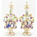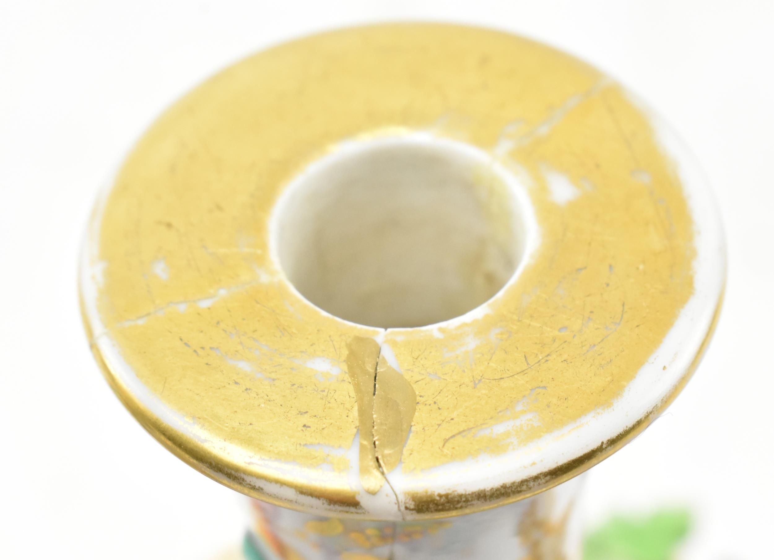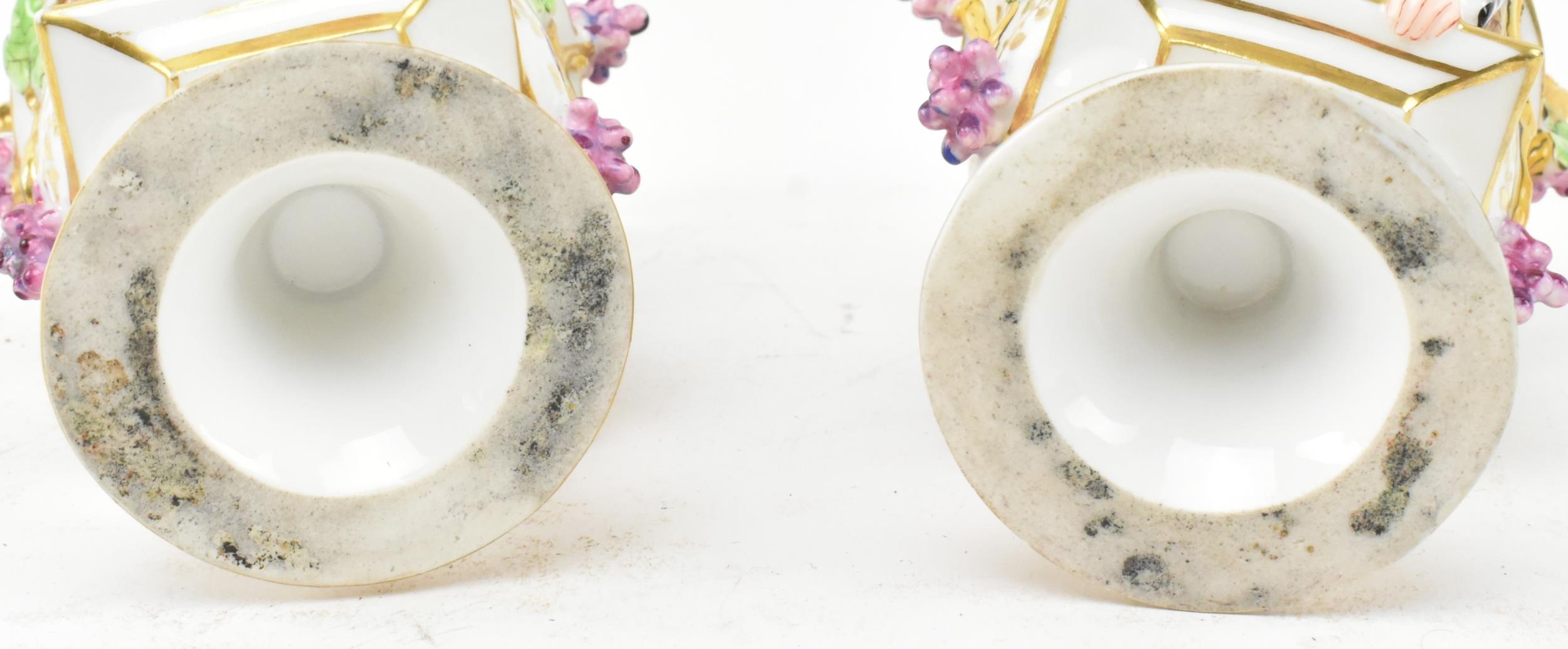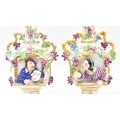A pair of large believed French continental early 20th century hand painted fine bone china scent bottles in the manner of Jacob Petit. Each having a shaped stopper over a flared neck with bamboo & grape's vines shaped handles. Each bottle depicting a woman and man protruding from a window. Raised on circular moulded foot. Unmarked. Some repairs present. Each measures approx. 24cm x 11cm x 11cm.