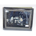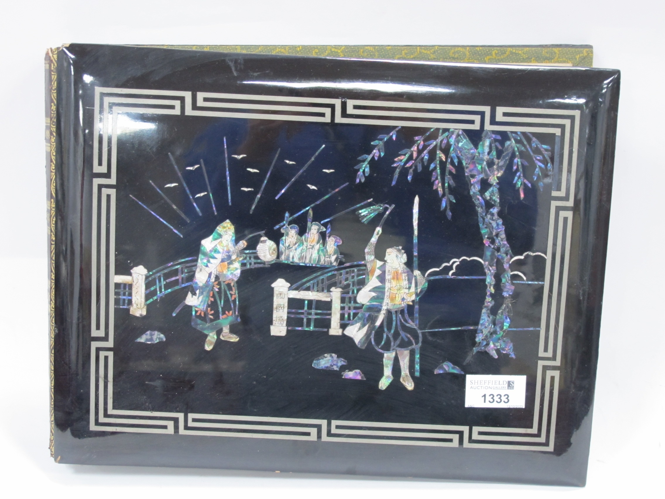 Oriental - Japanese Photo Album, the black lacquer cover inlaid with nacre and mother of pearl as warrior and figures, the interior painted with birds, blosson and Mount Fuji, 27 x 36cm.