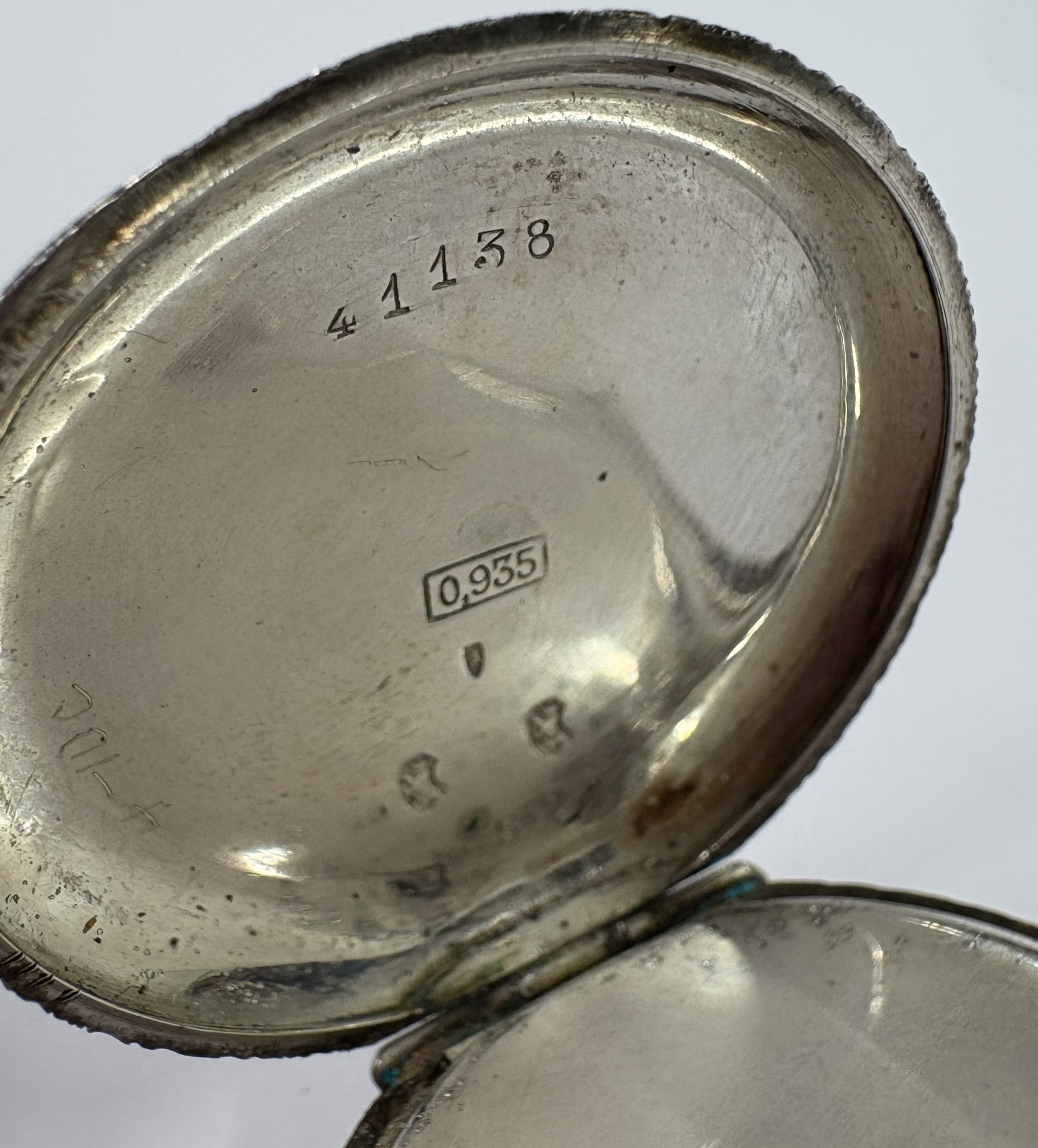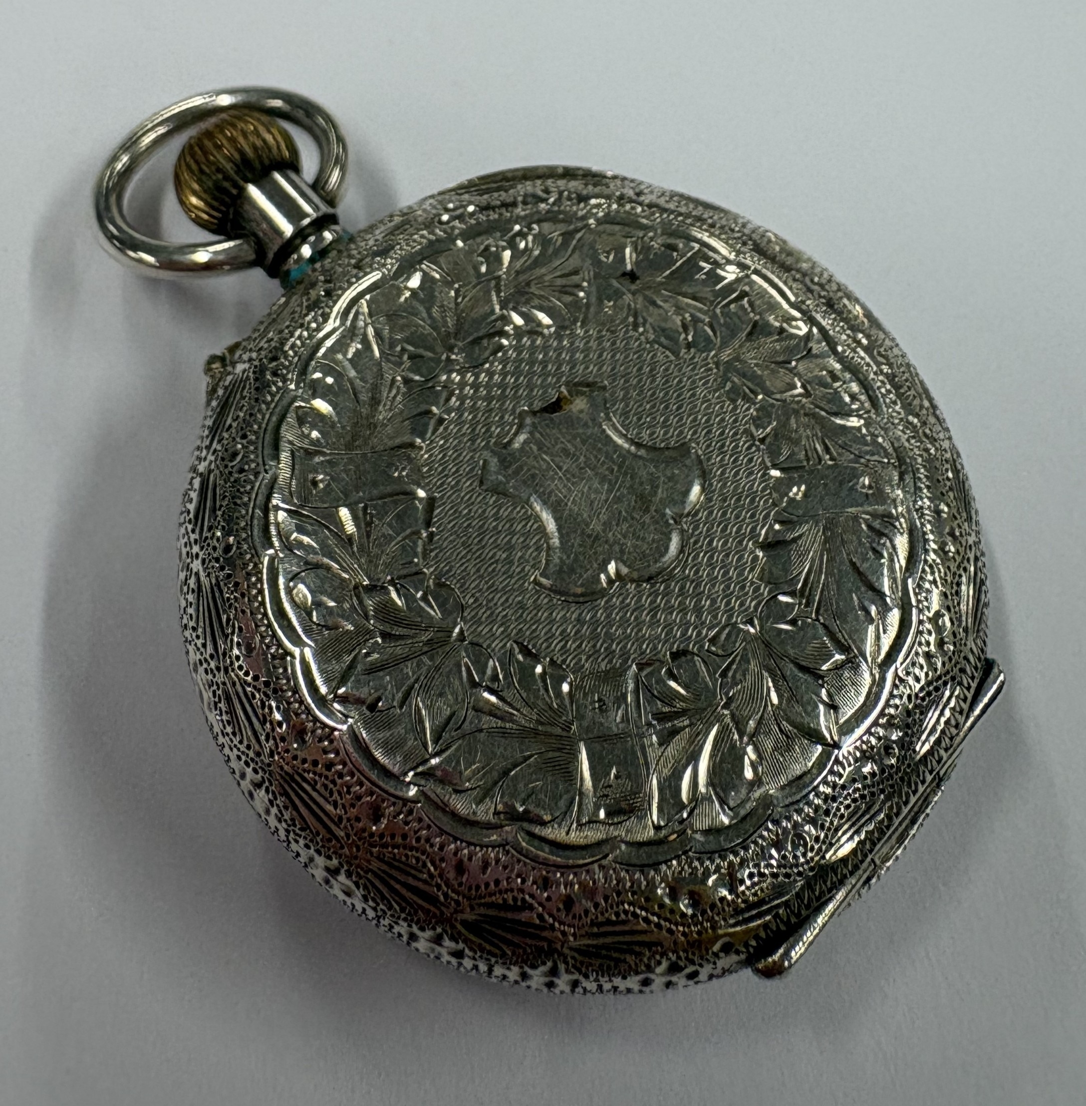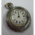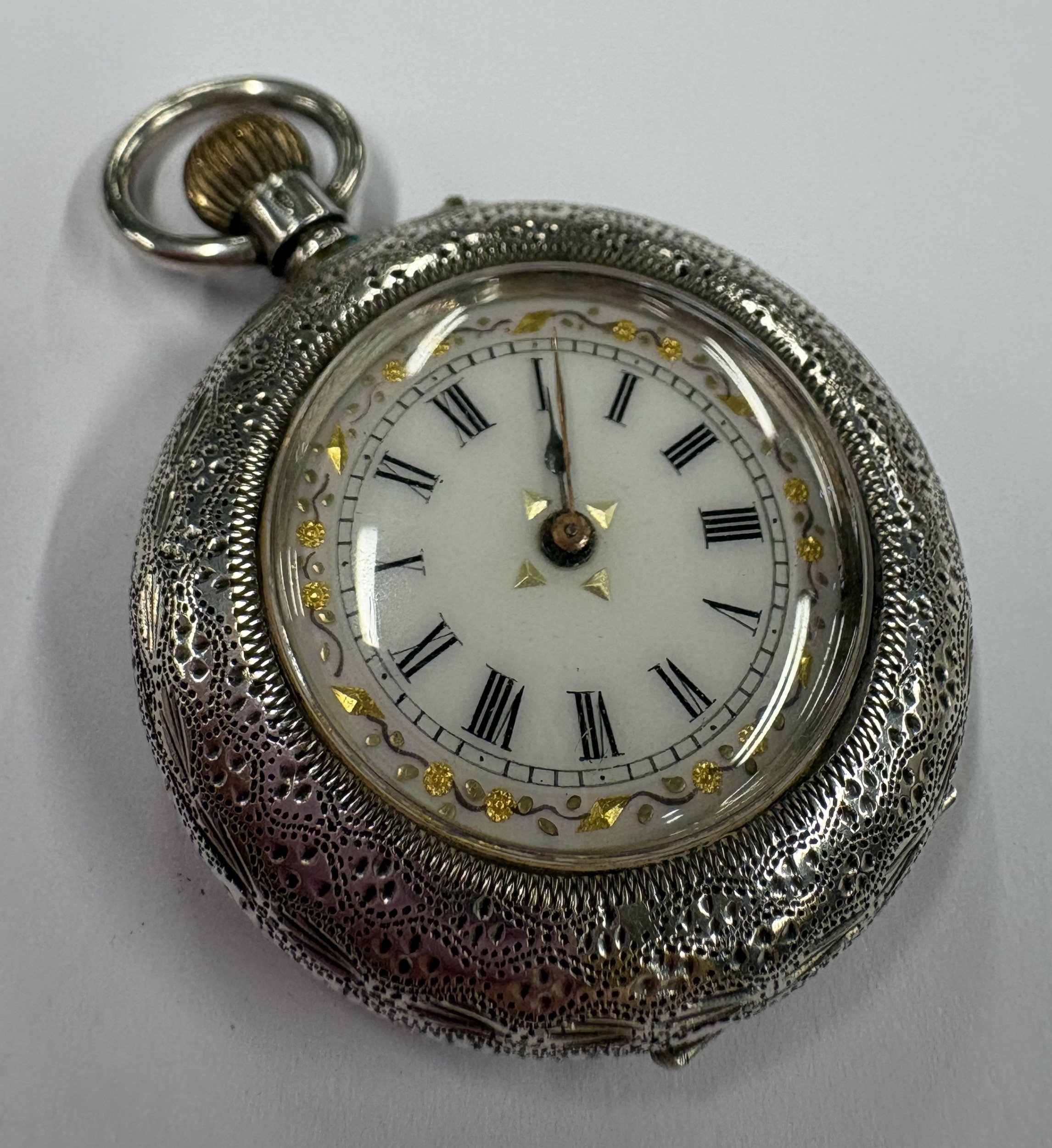 A silver-mounted fob watch with white enamelled dial. Approx. 35 grams. Est. £20 - £30.