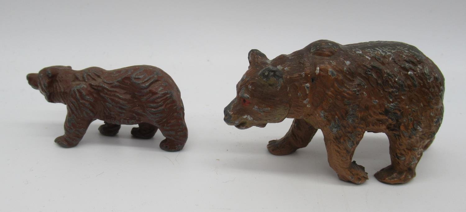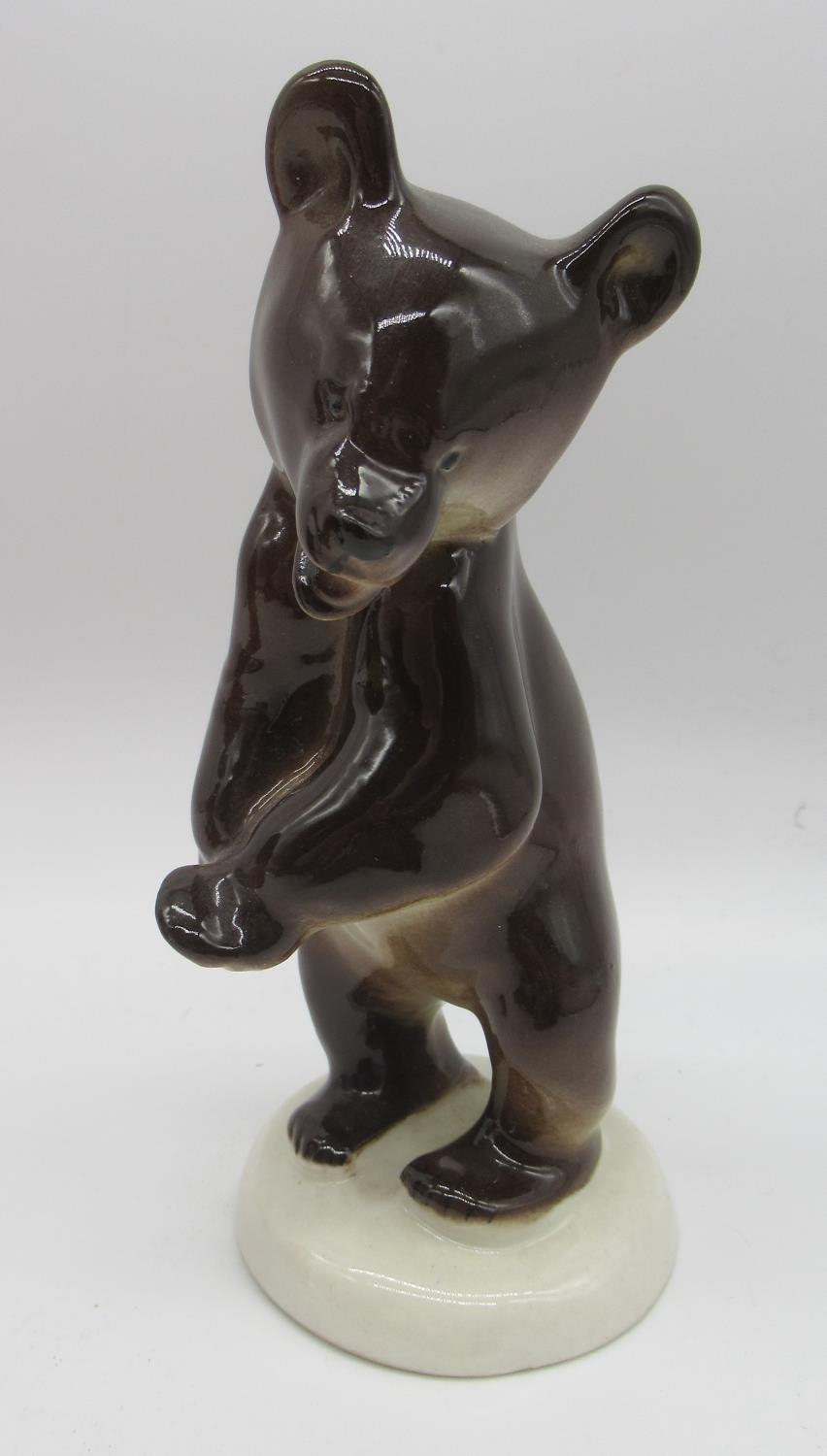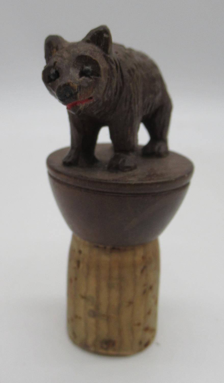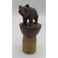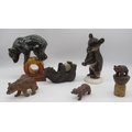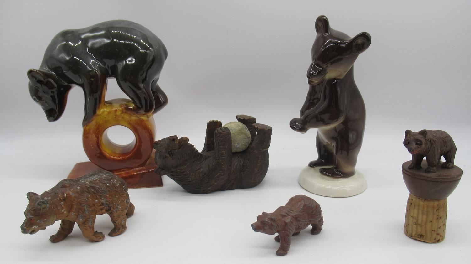 Performing brown bear standing on cylinder, stamped with makers mark and stamped Made In USSR, brown bear stamped USSR, two cast bears, carved wooden bear holding ball, and cork with carved brown bear top/stopper (6)