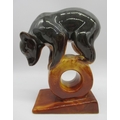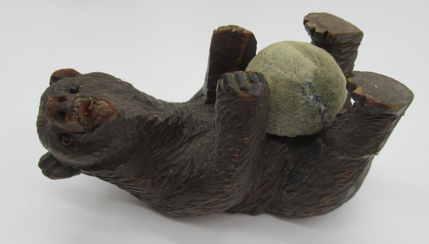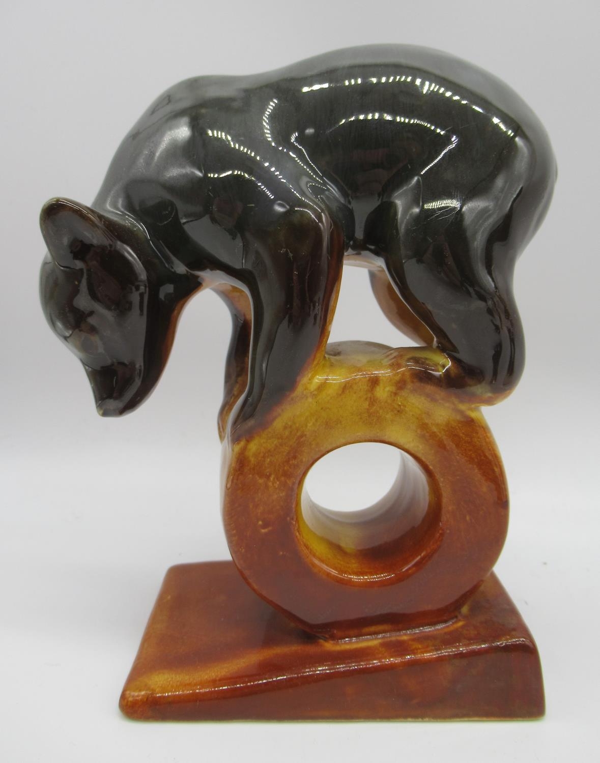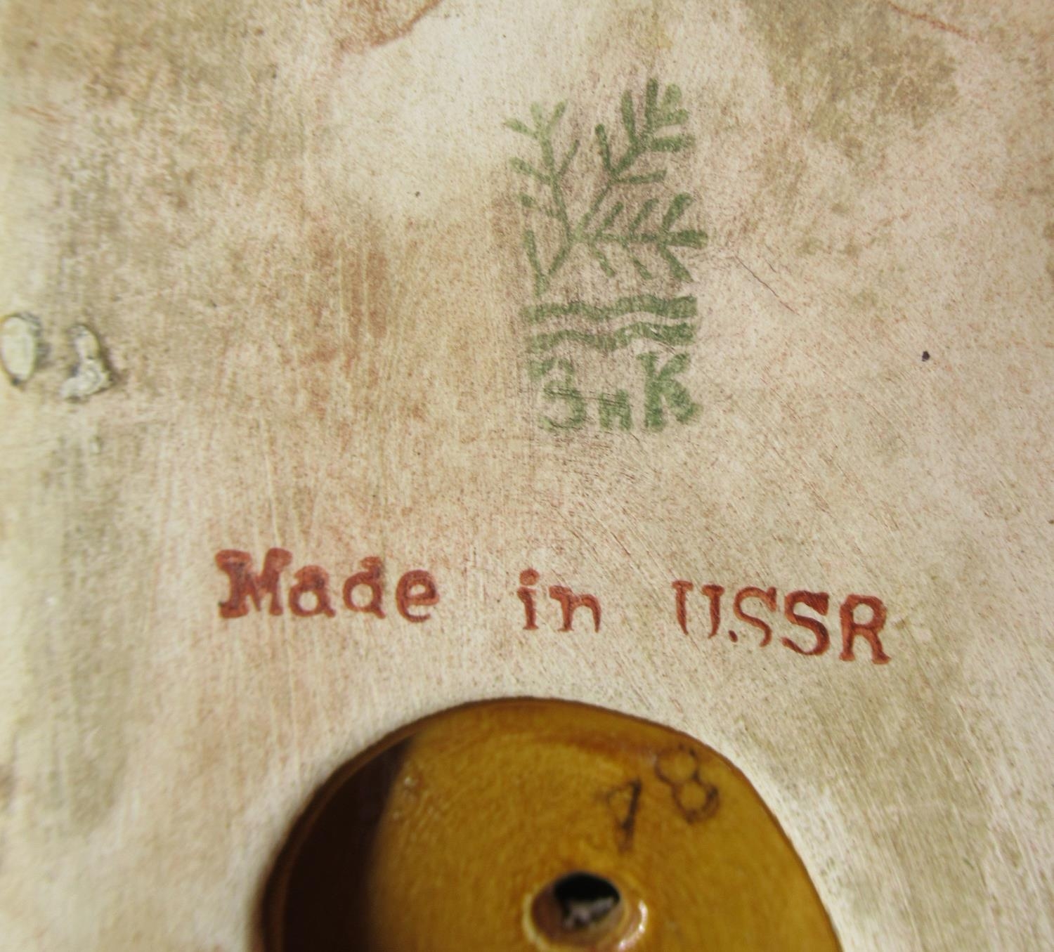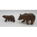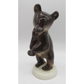 Performing brown bear standing on cylinder, stamped with makers mark and stamped Made In USSR, brown bear stamped USSR, two cast bears, carved wooden bear holding ball, and cork with carved brown bear top/stopper (6)