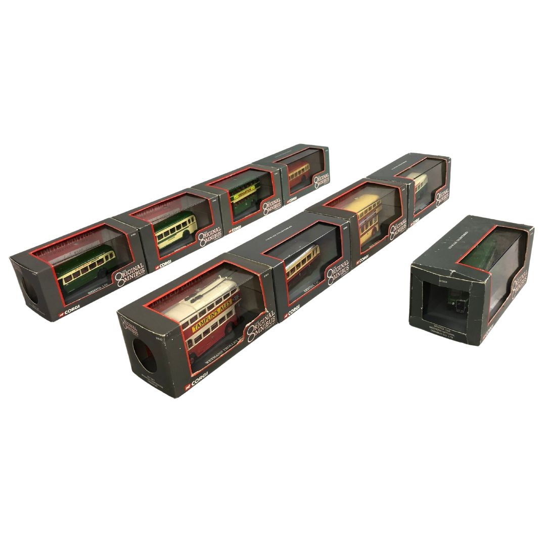 A large collection of boxed Corgi metal buses Original Omnibus Company. MIB and various others, 2 x Corgi Original Omnibus Company, Matchbox Limited Edition 1894 Aveling-Porler Steam Roller, 1 other Corgi Original Omnibus Company 1:76 scale.