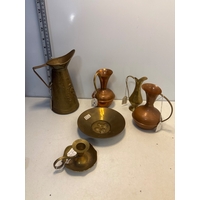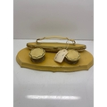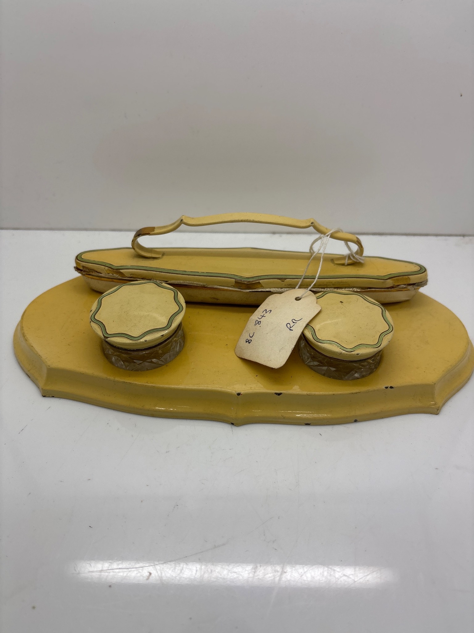 Yellow 1930s vanity set with jars and base, used condition.