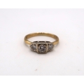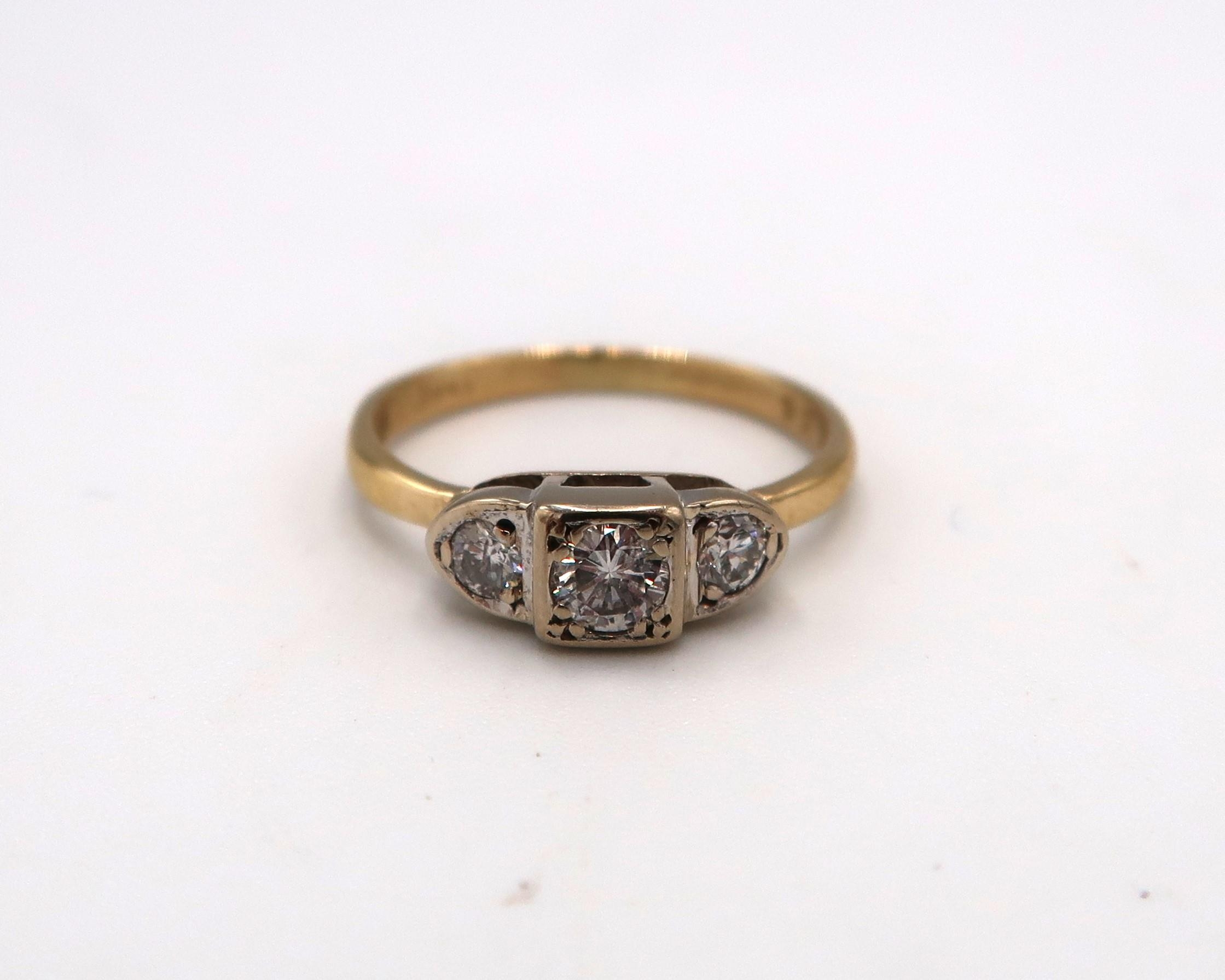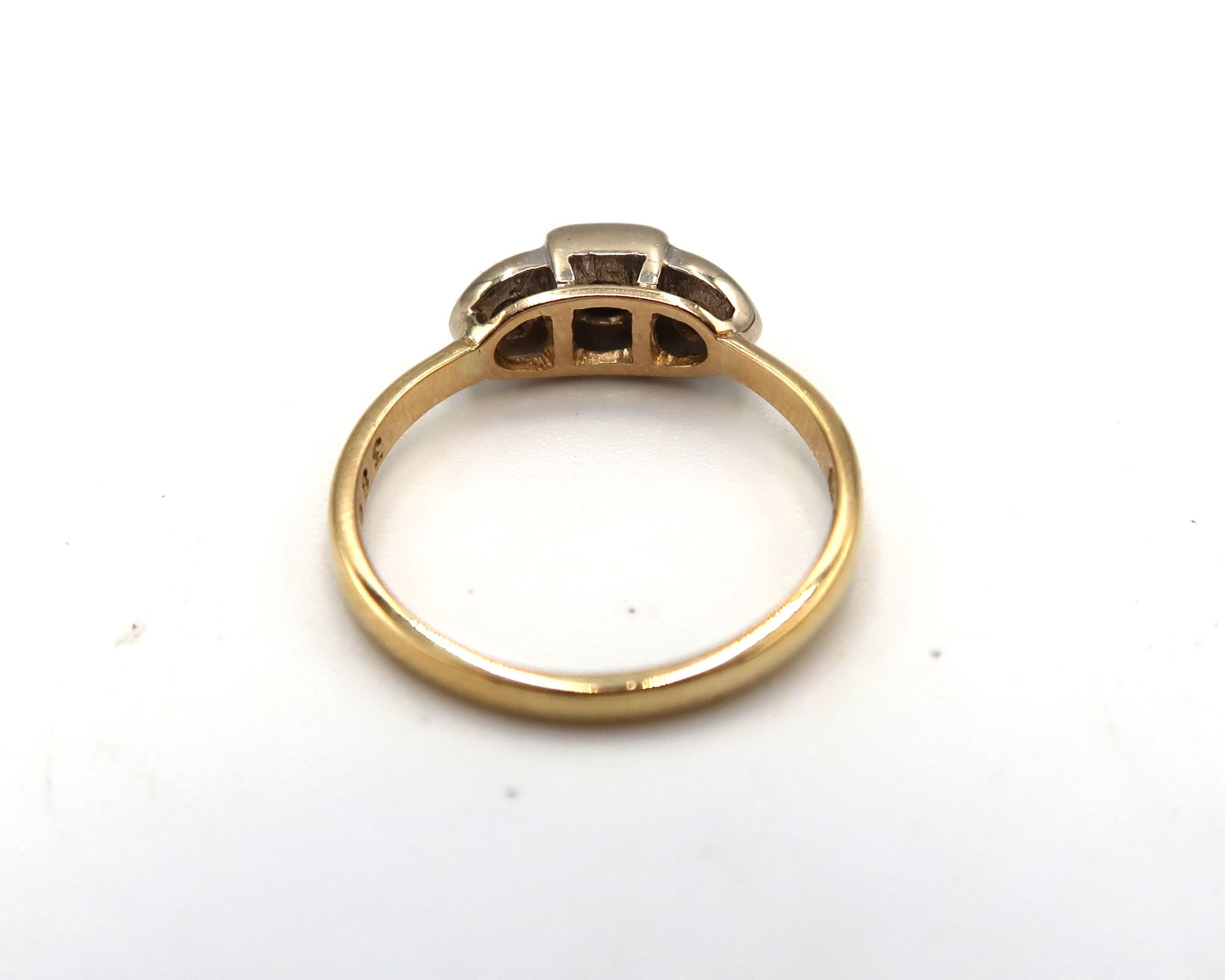 An 18ct Yellow Gold Art Deco 3 Stone Diamond Ring, Diamonds are a Good Colour and Well Matched, Head Size approx. 12mm x 5 mm - Ring size approx. L