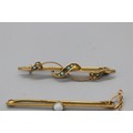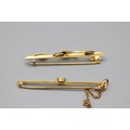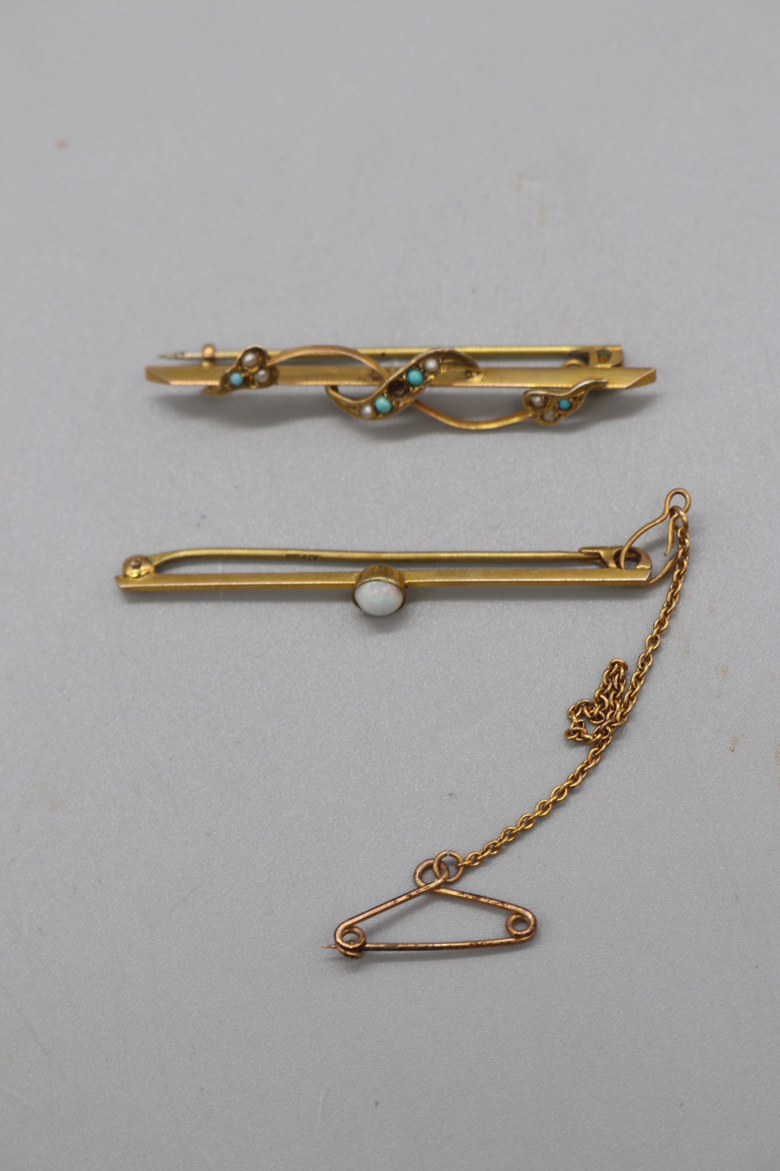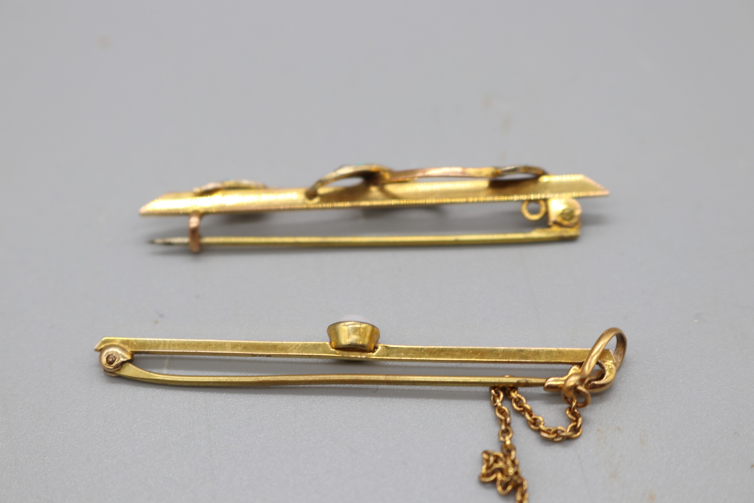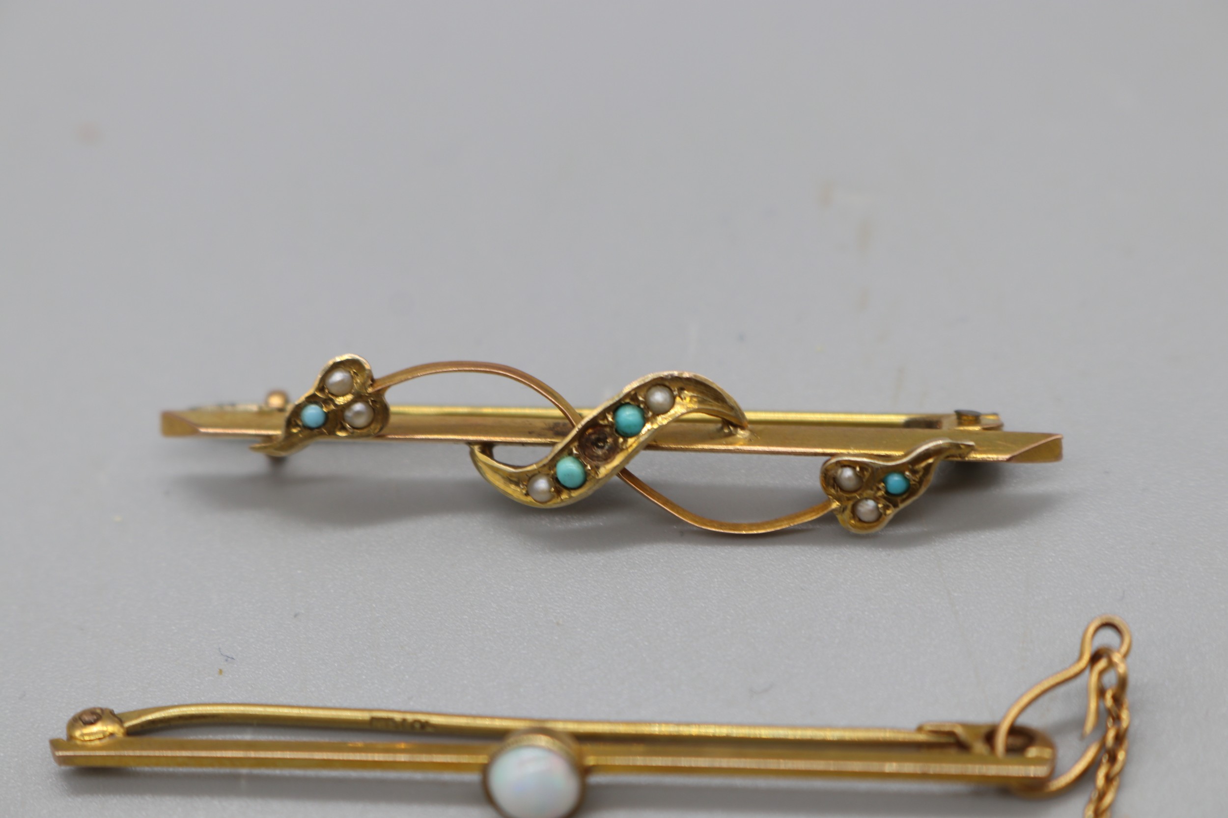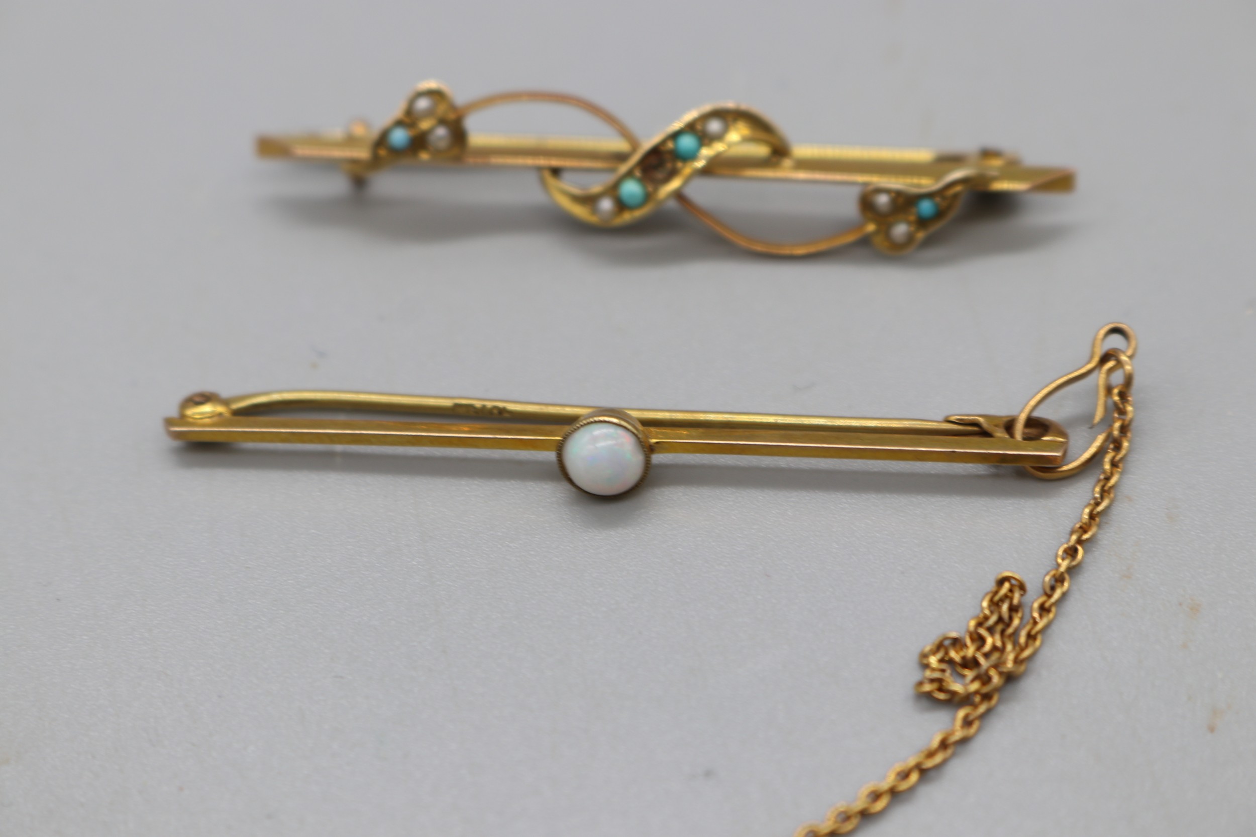 Two gold bar brooches, comprising a stamped 9ct yellow gold bar brooch with a millgrain bezel-set opal and safety chain, weight 2.21g; and a yellow metal turquoise and seed pearl bar brooch with leaf detail (fineness stamp not legible), weight 2.85g