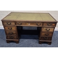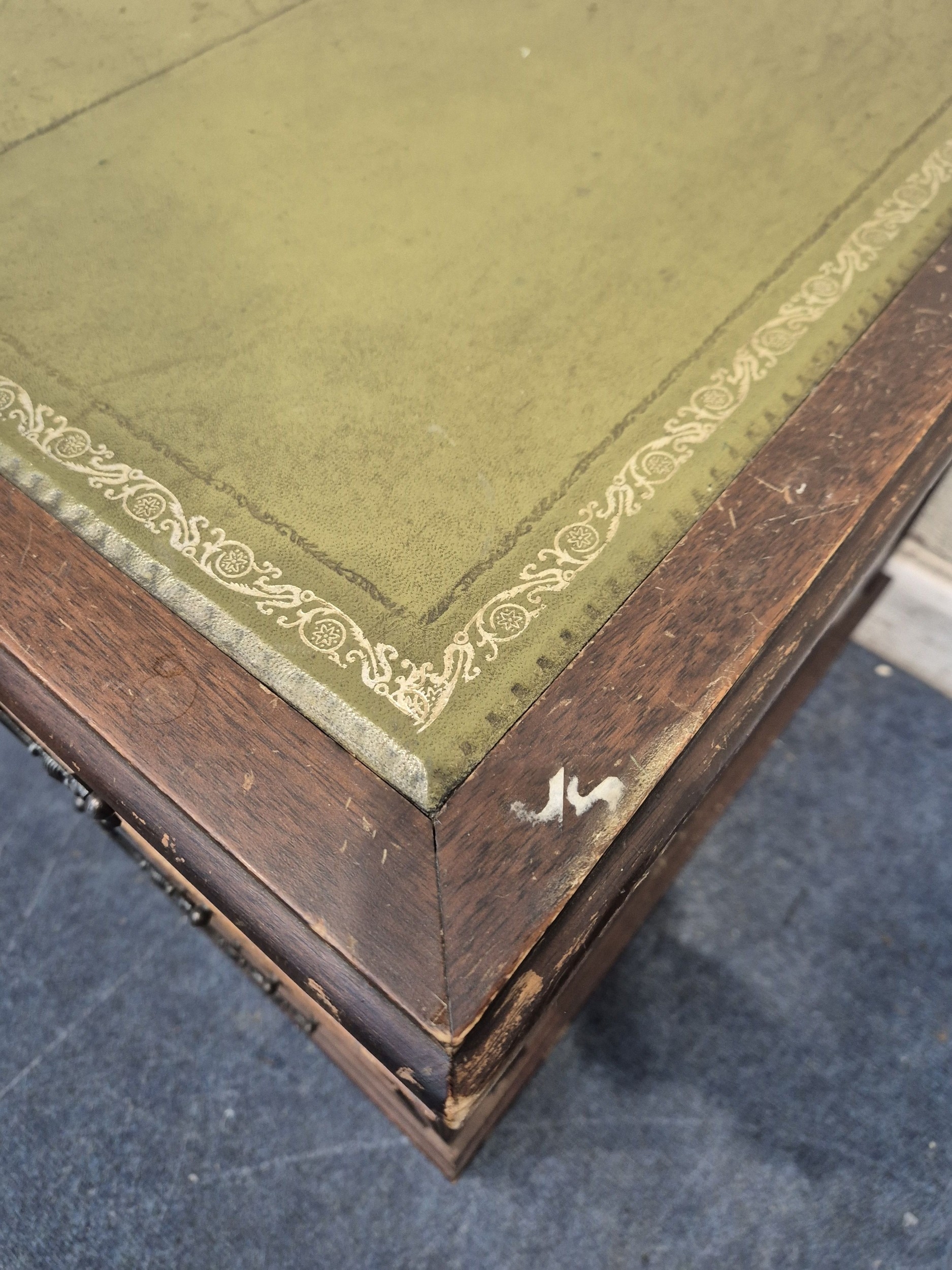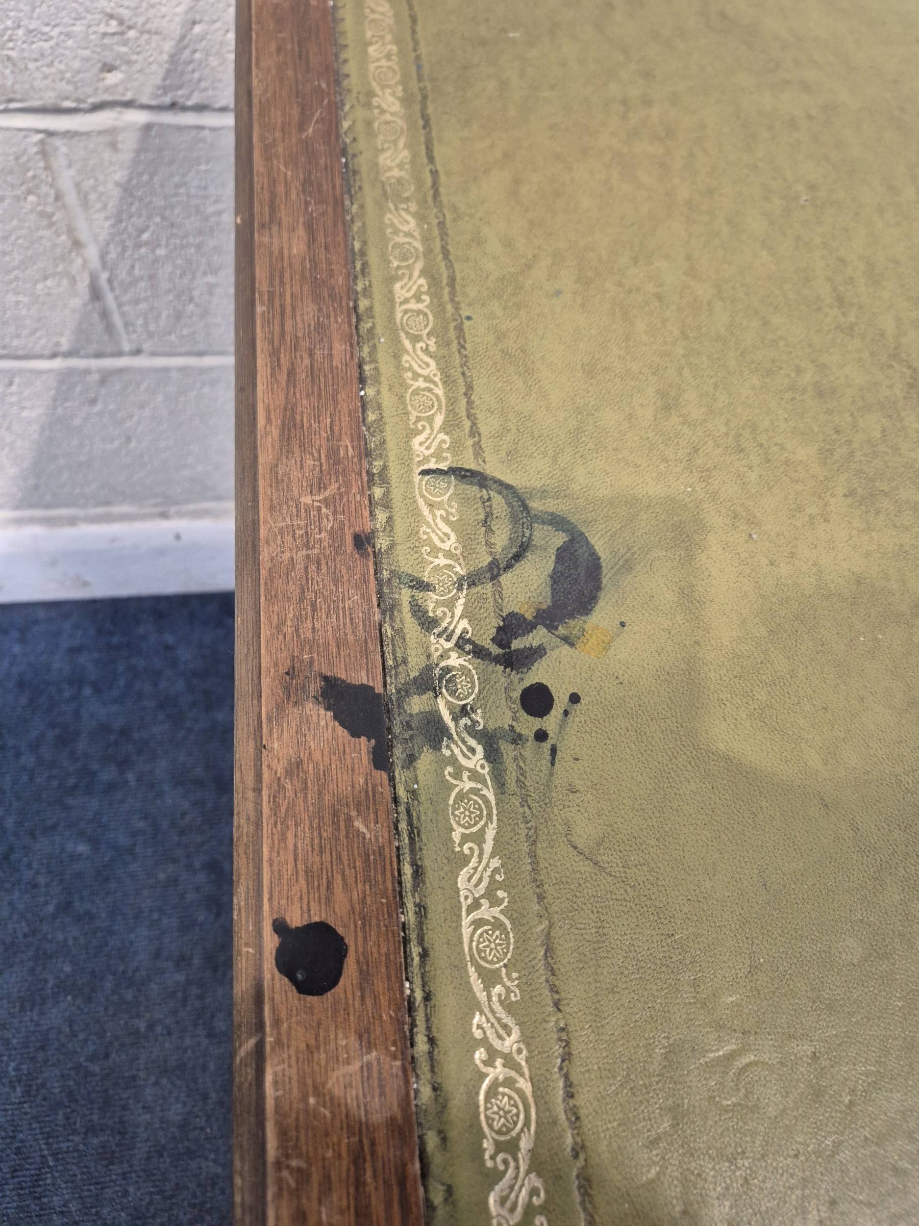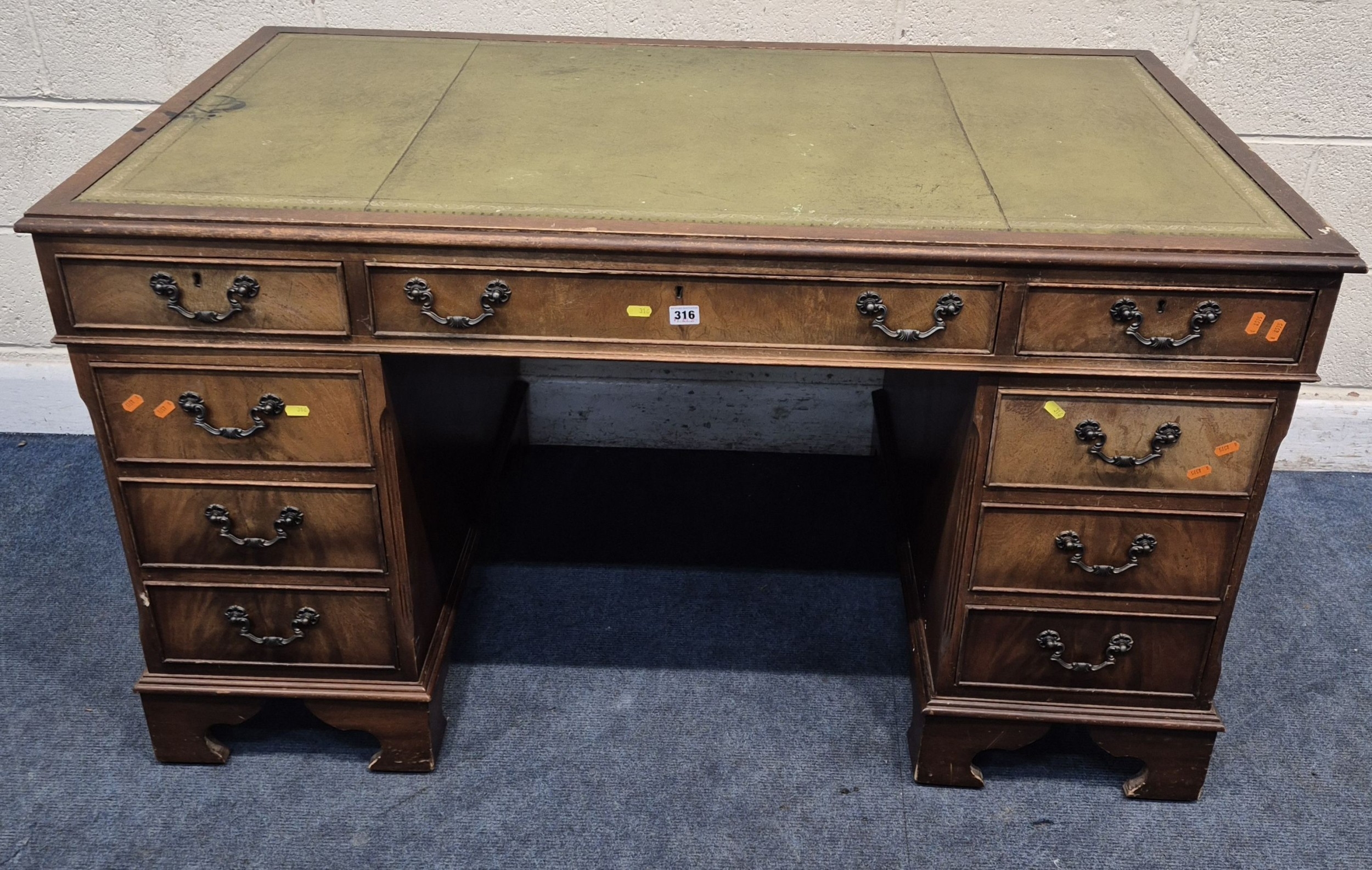 A 20TH CENTURY MAHOGANY TWIN PEDESTAL DESK, with a green leather writing surface, fitted with nine assorted drawers, raised on bracket feet, width 137cm x depth 77cm x height 77cm, condition report: marks, scuffs, stains, discolouration, other wear and usage (3 sections)