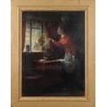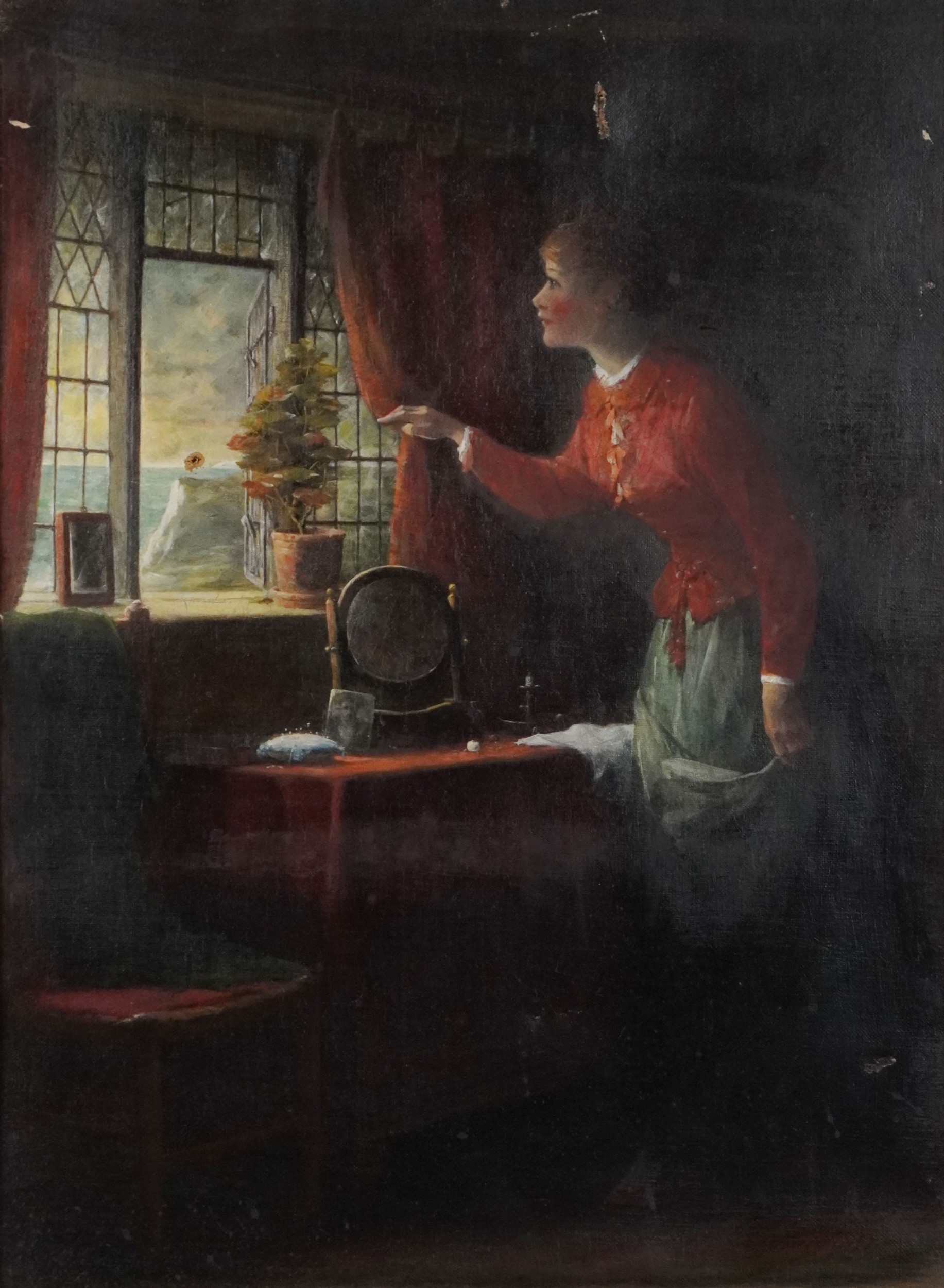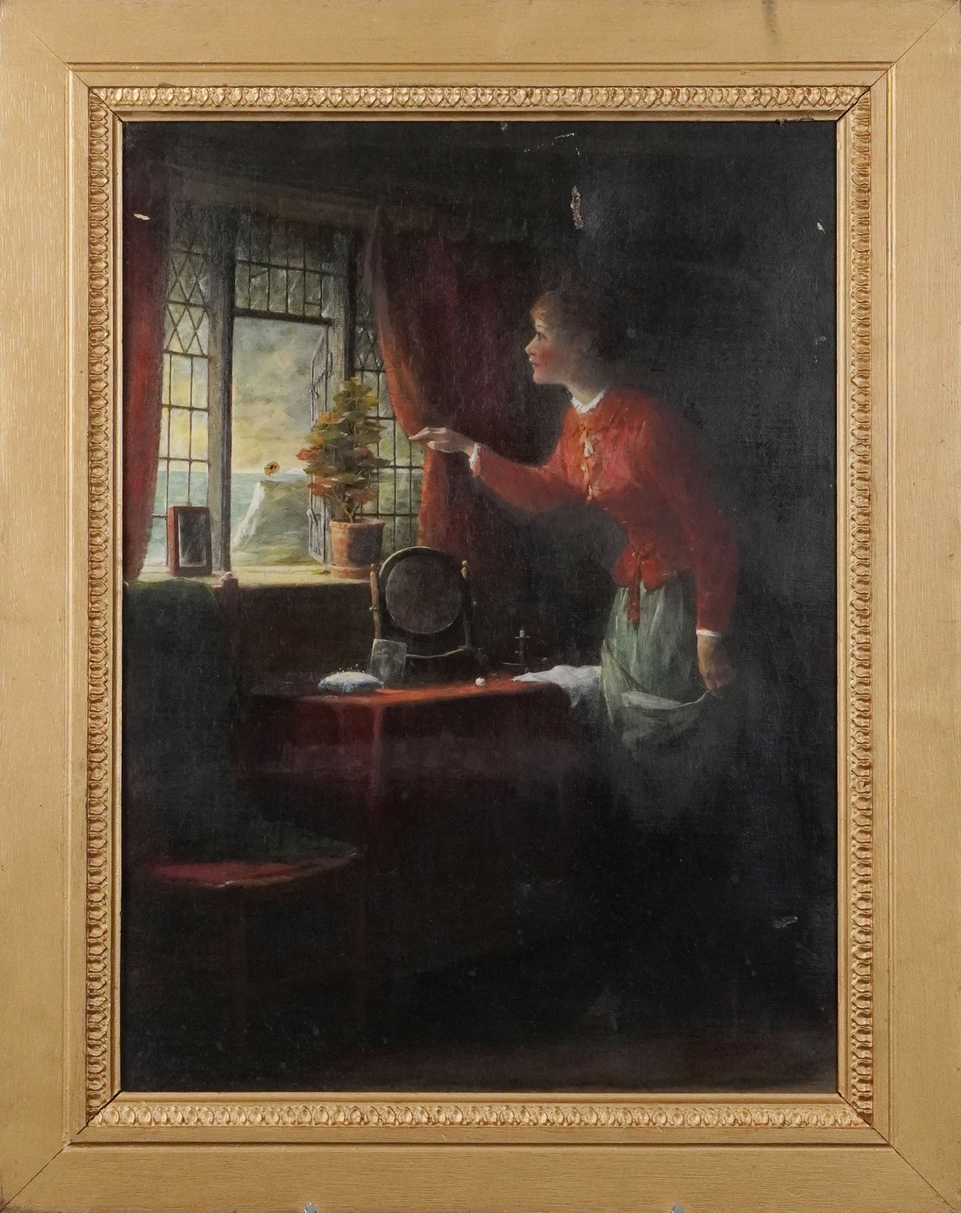 Attributed to David Hardy (Active 1855-1870) - Lady looking out of her window, late 19th century British school oil on canvas, signed and dated '95, within a giltwood frame, 44cm x 32cm.