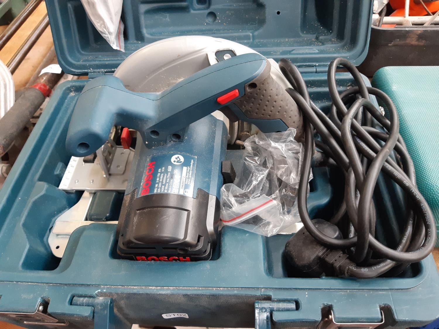 A CASED BLUE BOSCH GKS 190 MAINS ELECTRIC HANDHELD CIRCULAR SAW WITH MANUAL