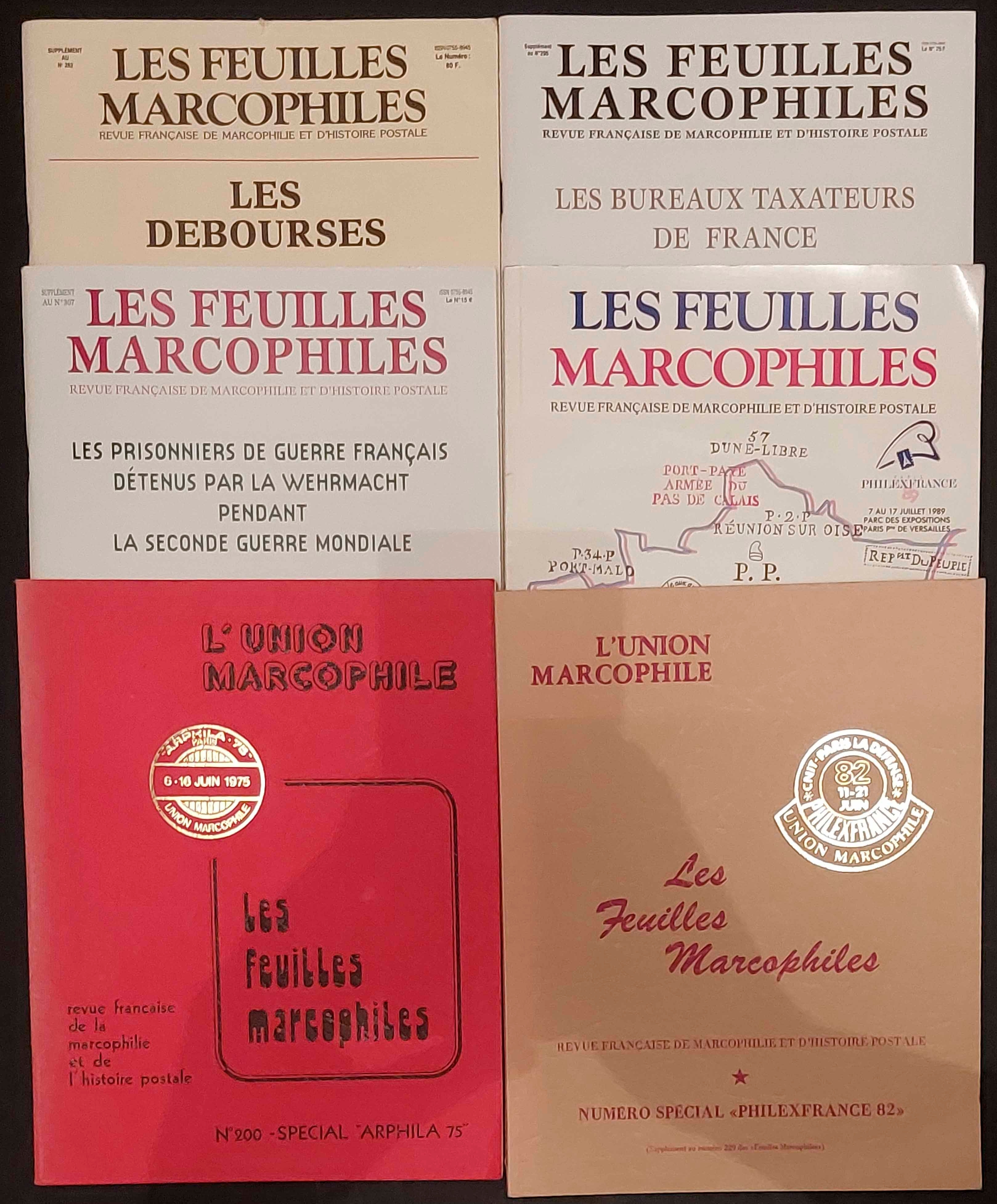 LES FEUILLES MARCOPHILES: Six different editions offering a wide variety of postal history subjects inc. Les Bureaux Taxateurs de France by Chauvet; Les Desbourses by Wallart; POWs WWII by Albard; and Compendia especially produced for exhibitions. All in good condition (6) Cross Reference: FRANCE, MILITARY - P.O.W. MAIL, MILITARY - WWII