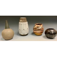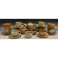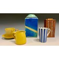 A Sue Ford Bristol mustard teacup and saucer, seal mark; a similar jug; a mug, in vertical bands of blue, 10cm high; an Art Pottery tea canister, 17cm high; etc (5)
