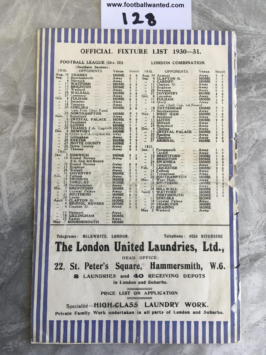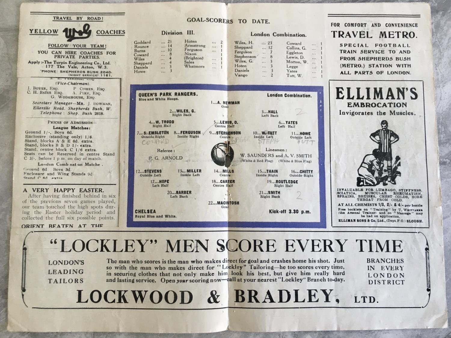 30/31 QPR Reserves v Chelsea Reserves Football Programme: With competition coupon cut out on page 3 and spine damage with holes where staple was. Pencilled writing.