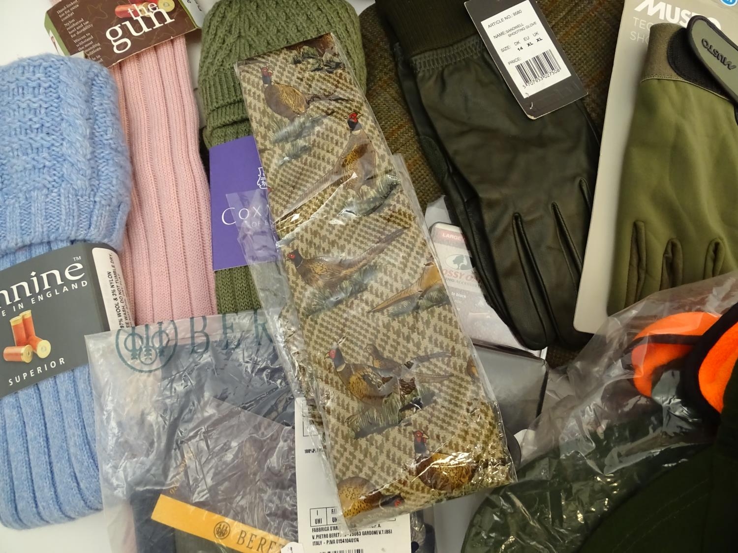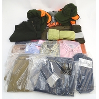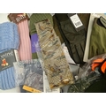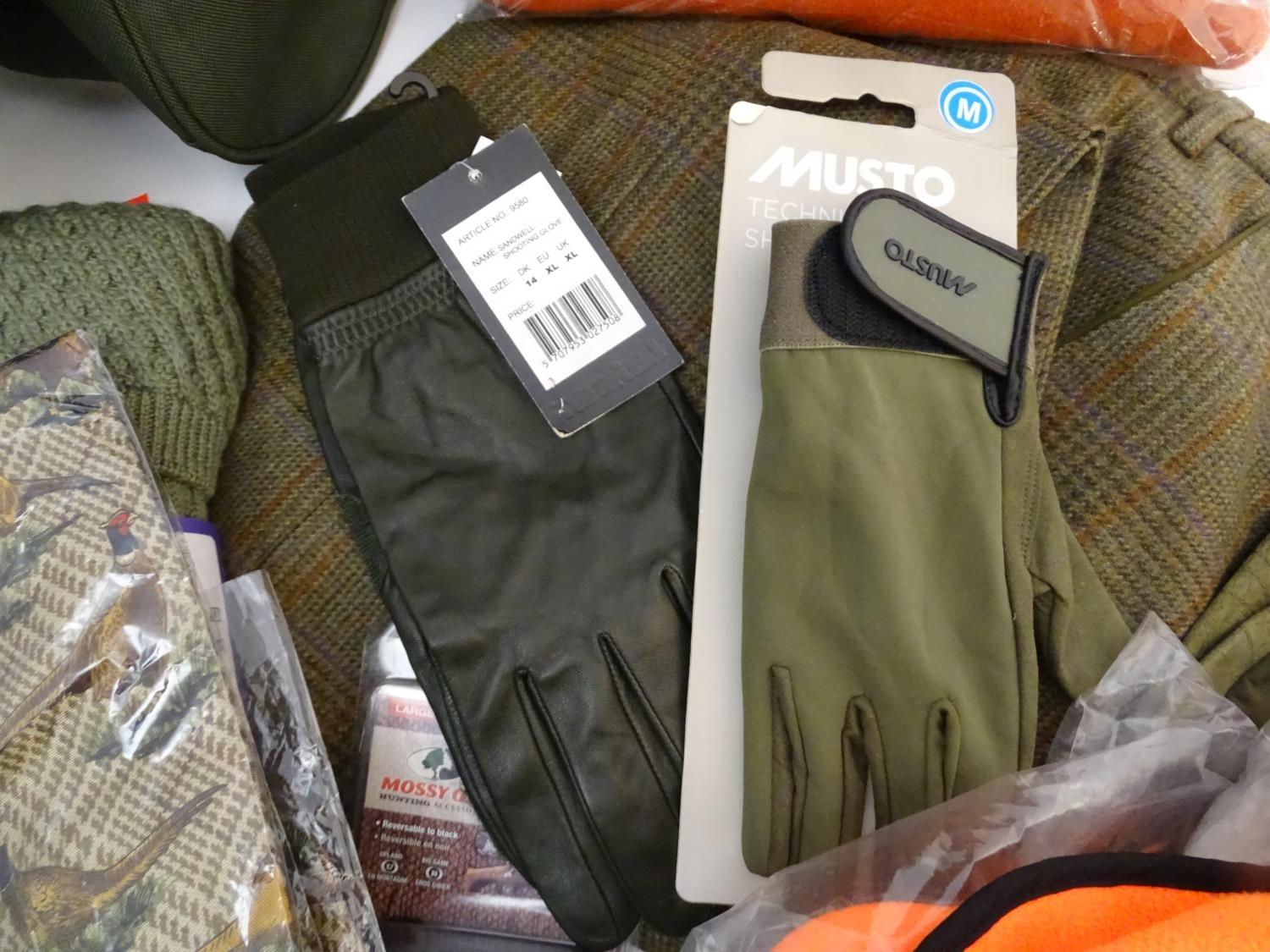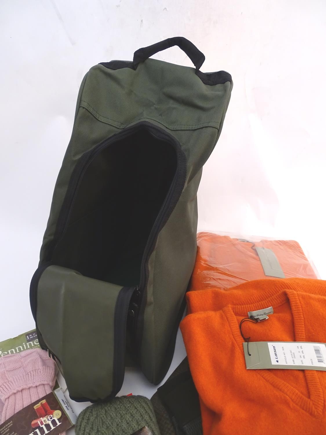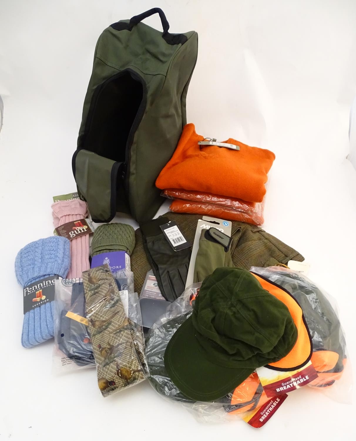 Box of assorted items to include, 3 Laksen orange jumpers size 2XL, 1 pair of Laksen tweed trousers size 36"; 9 Laksen stalker caps, 3 pairs of socks, 3 pairs of gloves, 1 pheasant tie, a Beretta pouch for 1 box, A mossy oak neoprene scope cover and a wellington boot bag