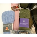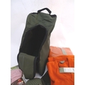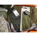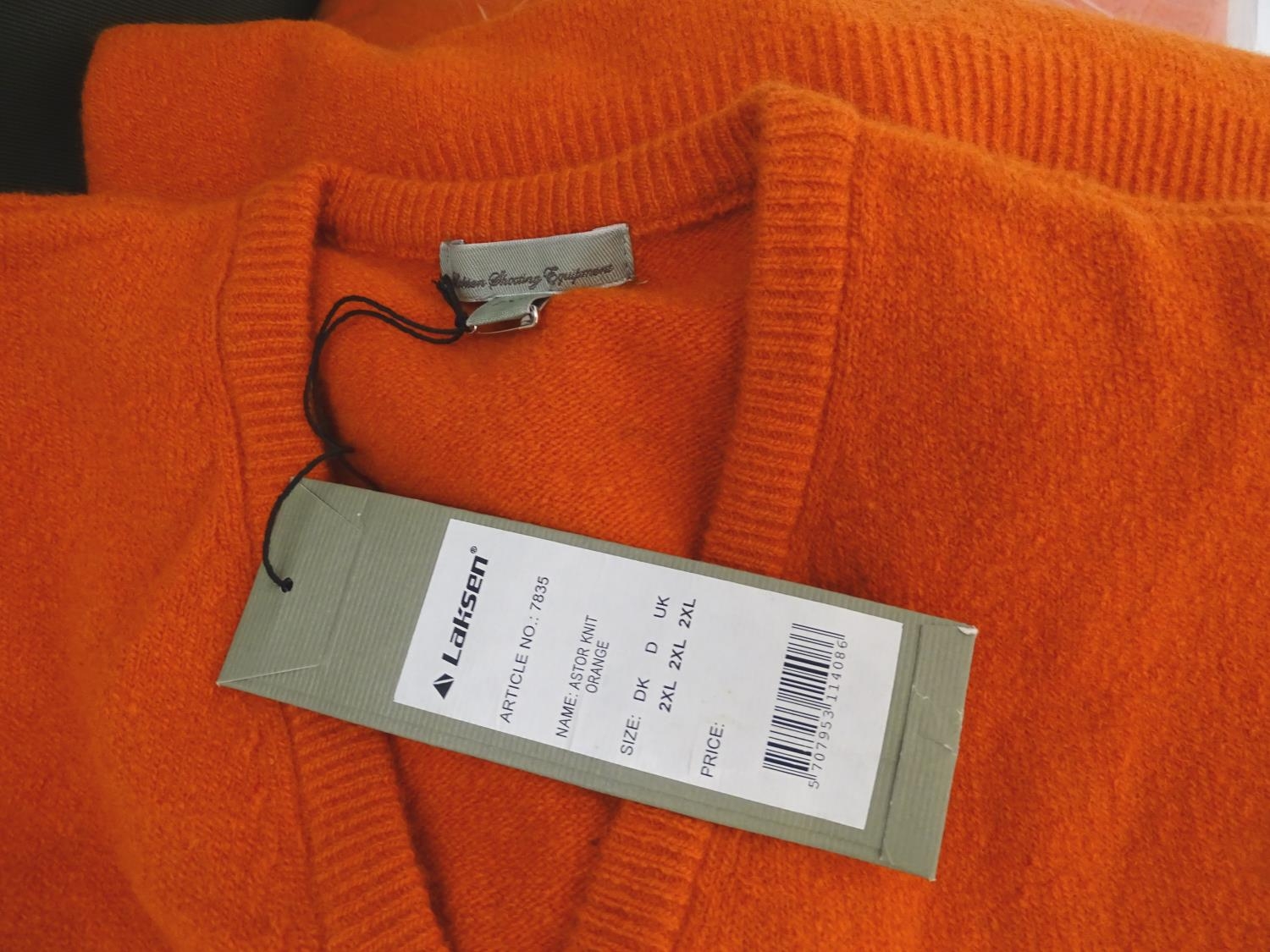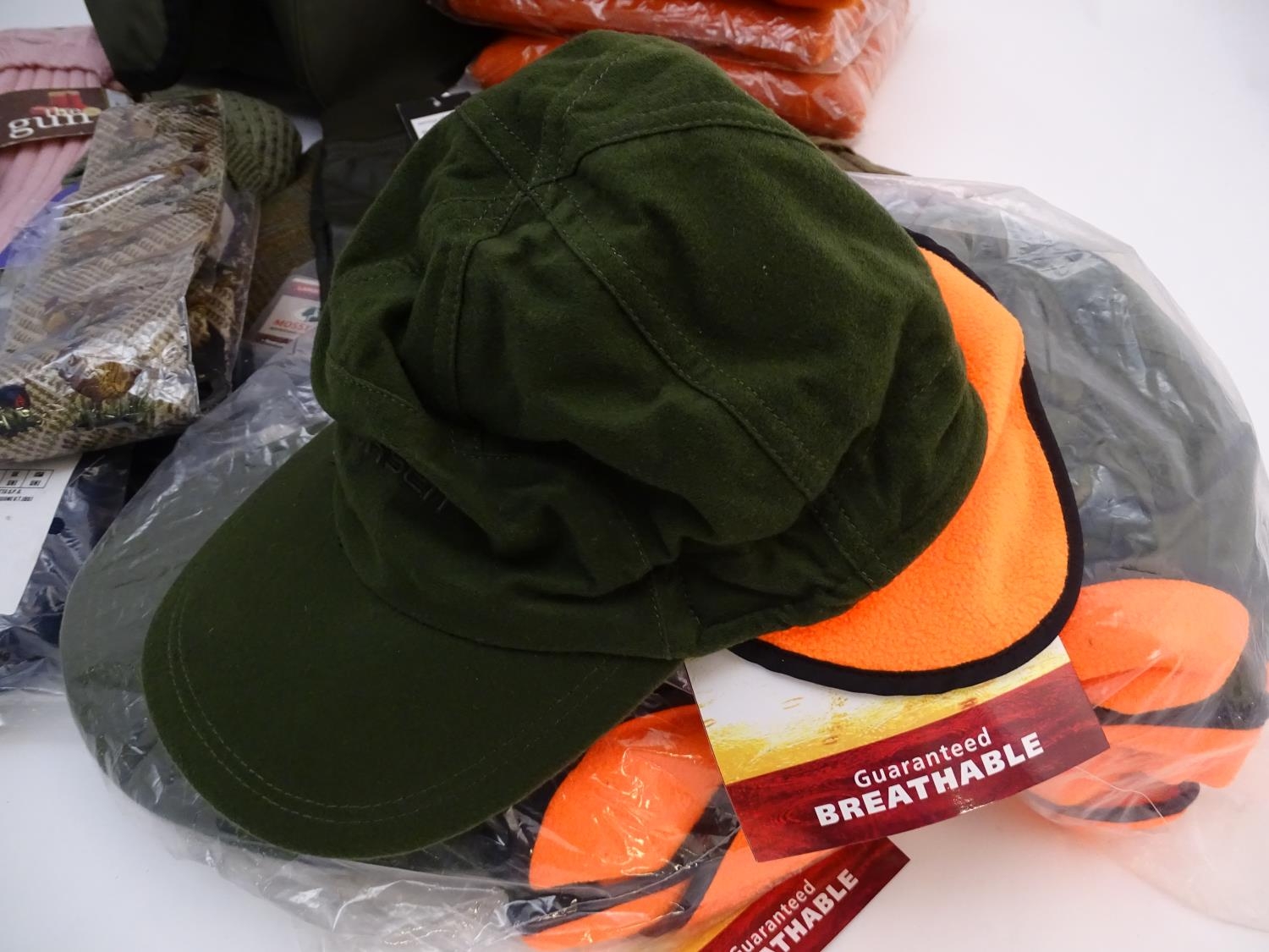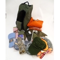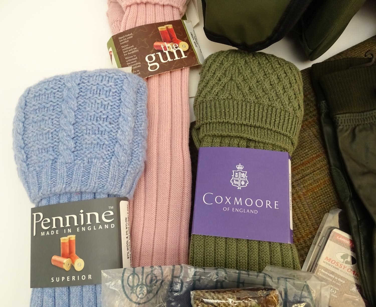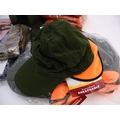 Box of assorted items to include, 3 Laksen orange jumpers size 2XL, 1 pair of Laksen tweed trousers size 36"; 9 Laksen stalker caps, 3 pairs of socks, 3 pairs of gloves, 1 pheasant tie, a Beretta pouch for 1 box, A mossy oak neoprene scope cover and a wellington boot bag