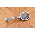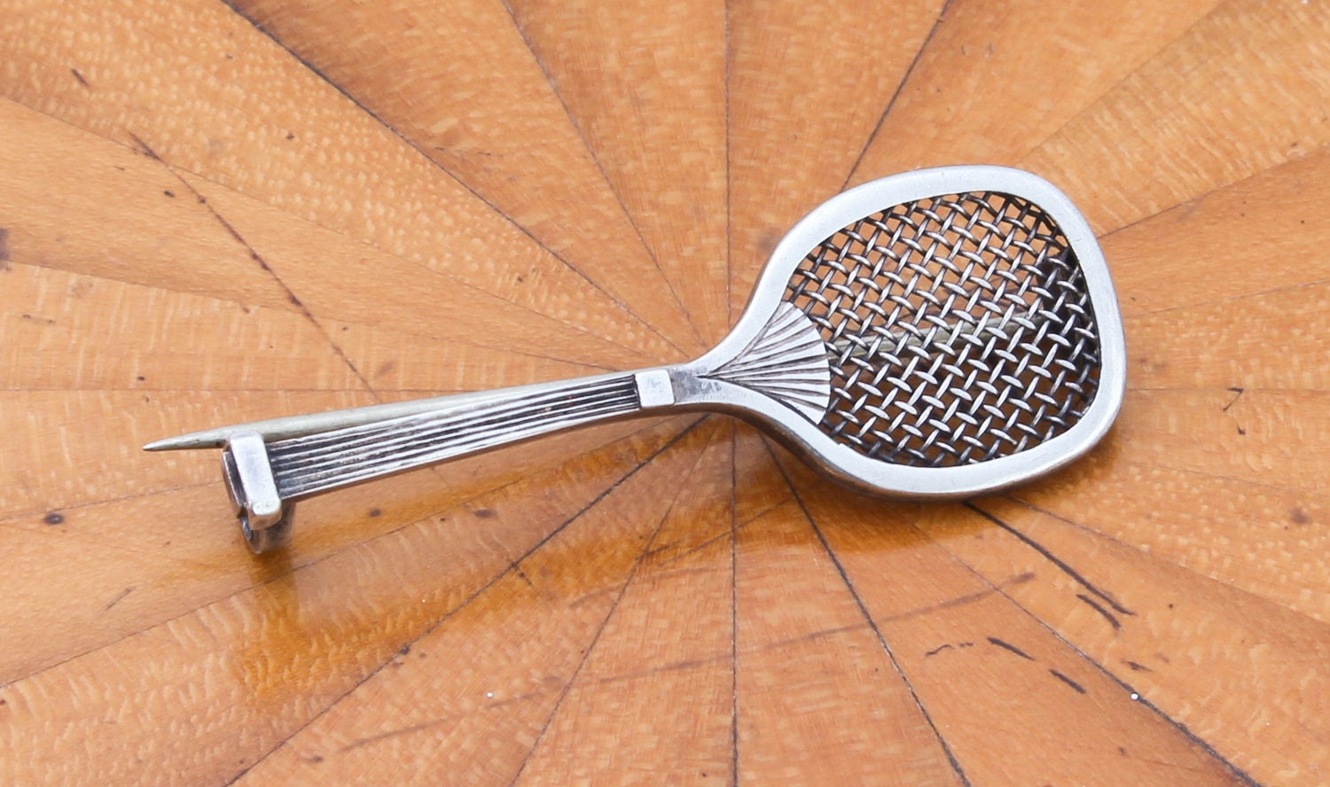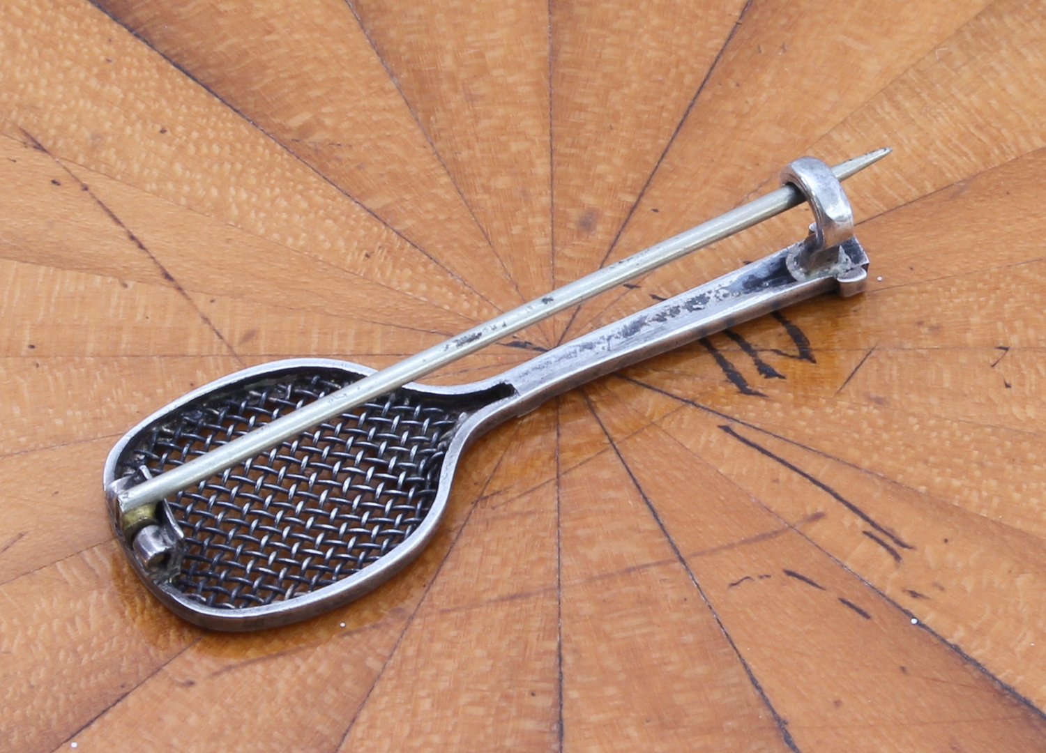 A 1920s or 1930s silver (unmarked) brooch modelled as a fully-strung tennis racket with early-style 'flattened' top (3.75 cm)