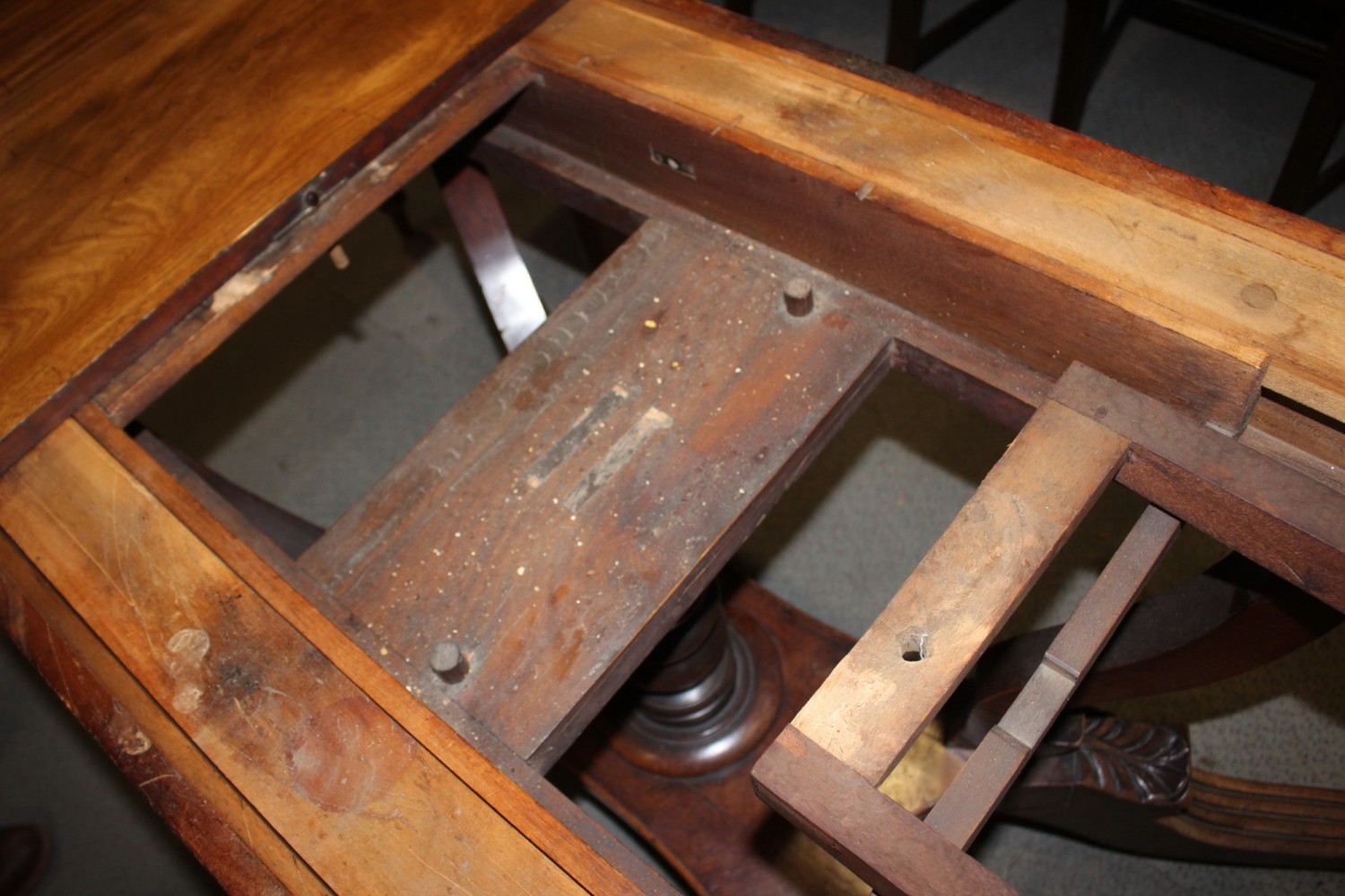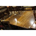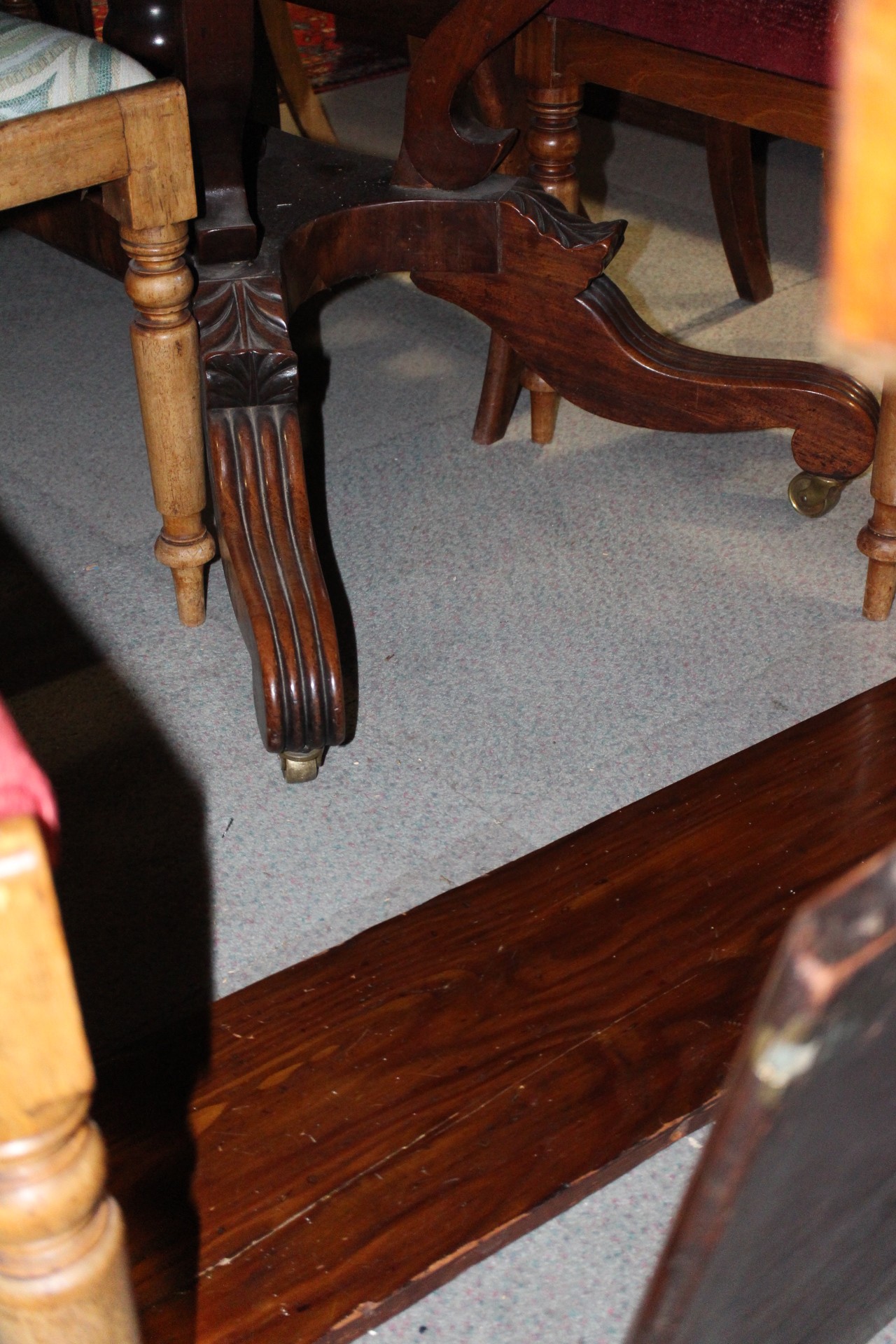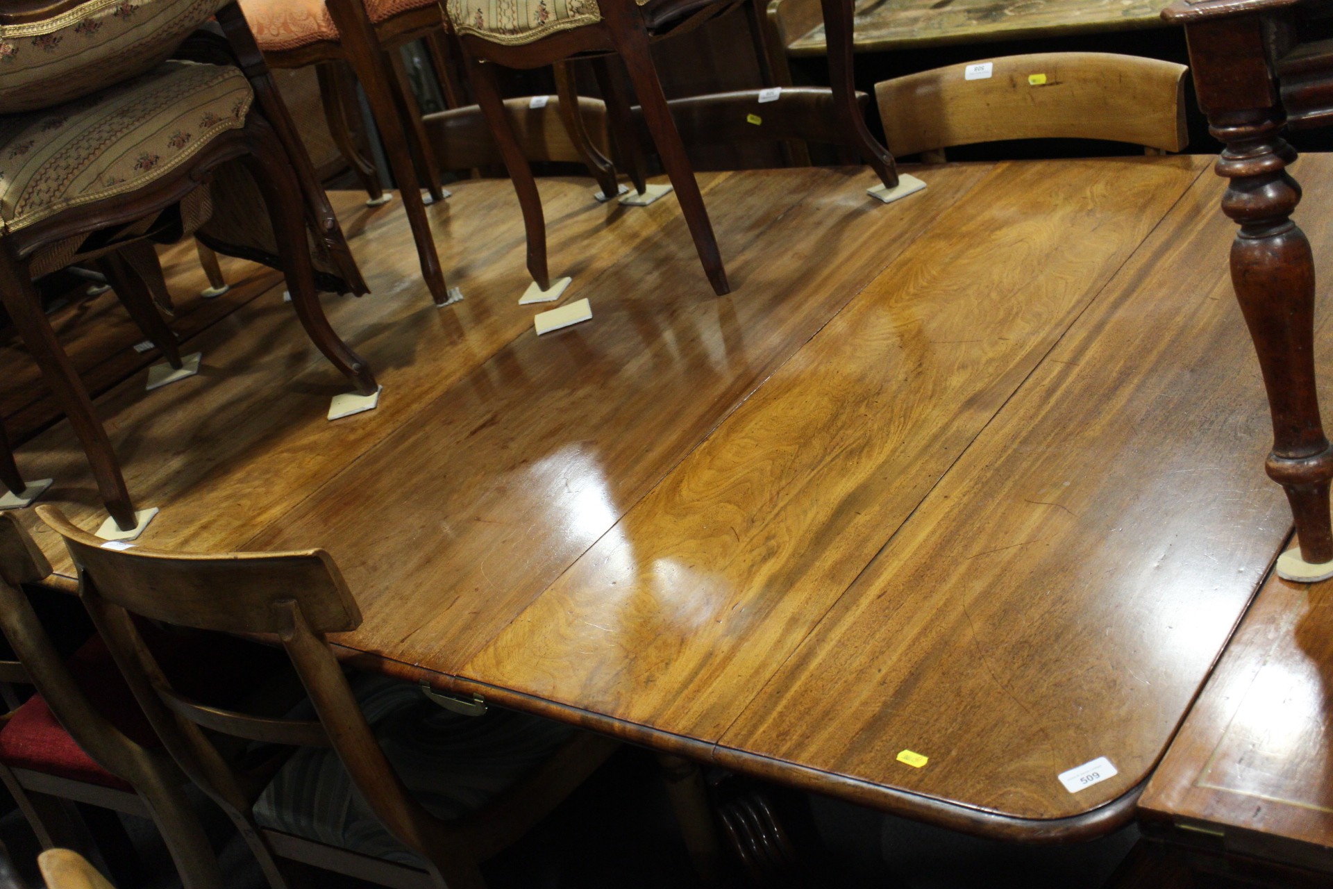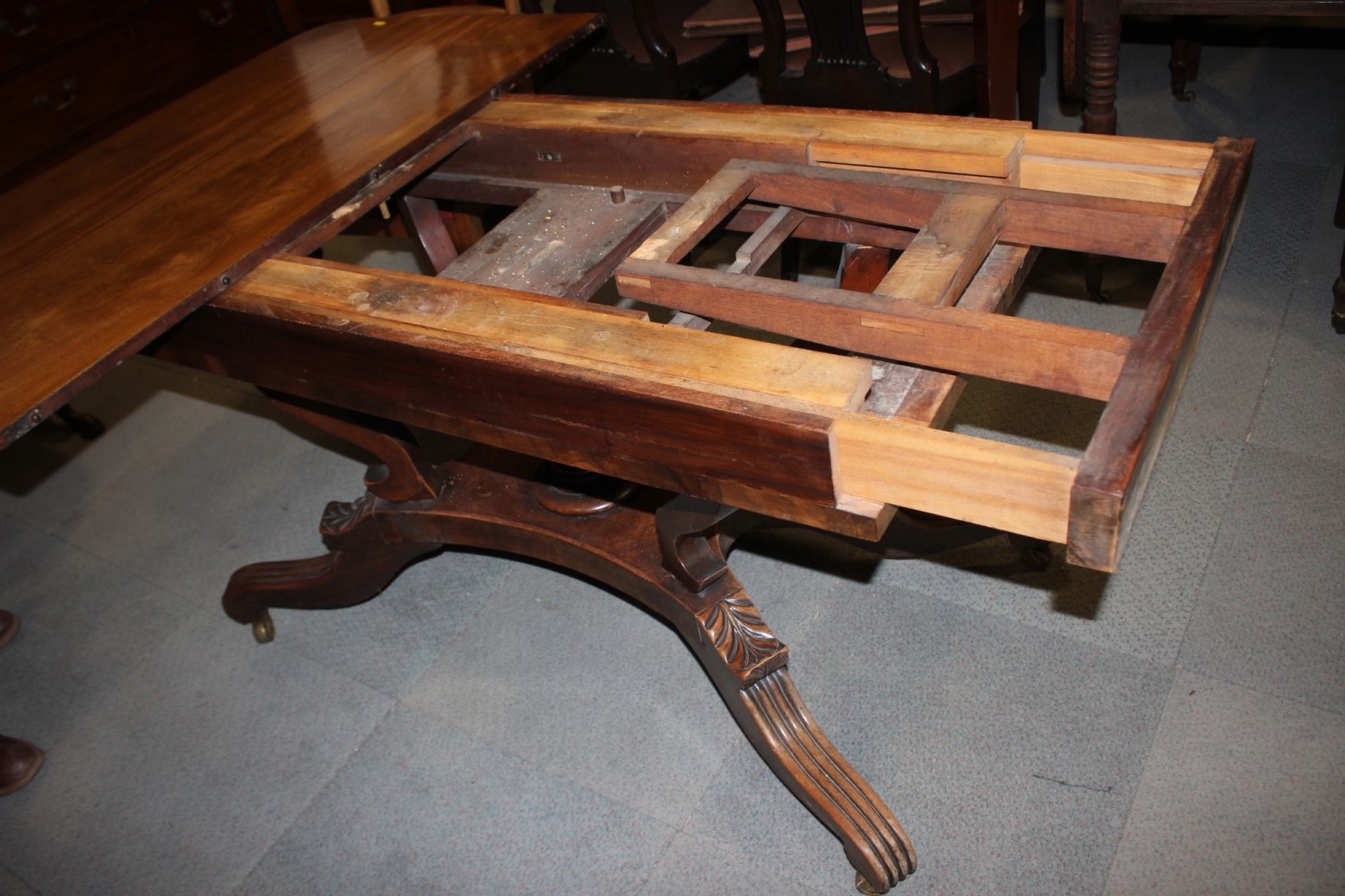 A William IV mahogany drop leaf extending with two extra leaves, on central pedestal and quadruple splay scroll supports, 69" wide x 45 1/2" deep x 27" high