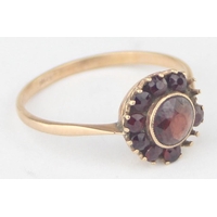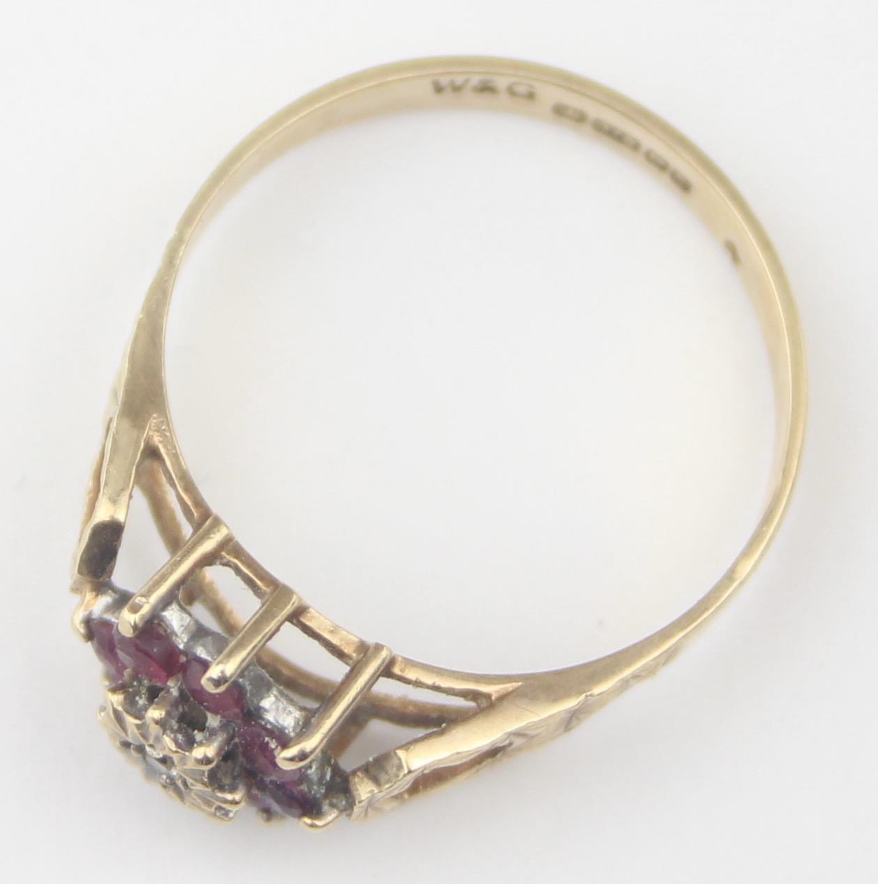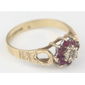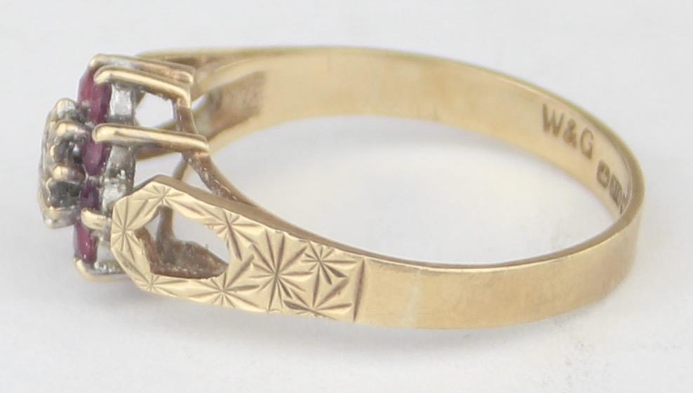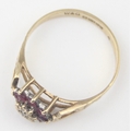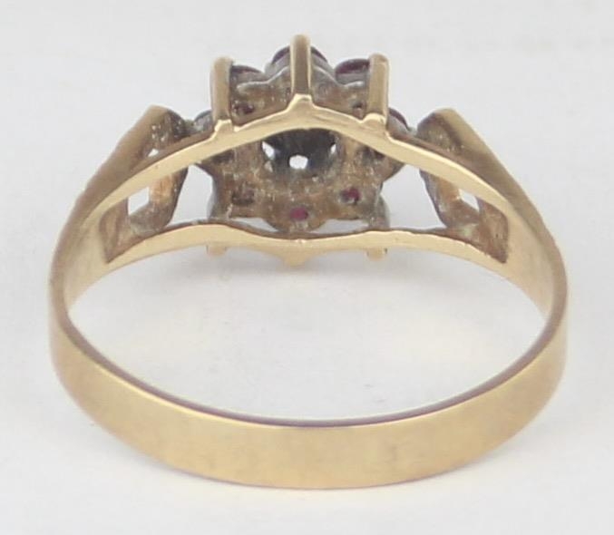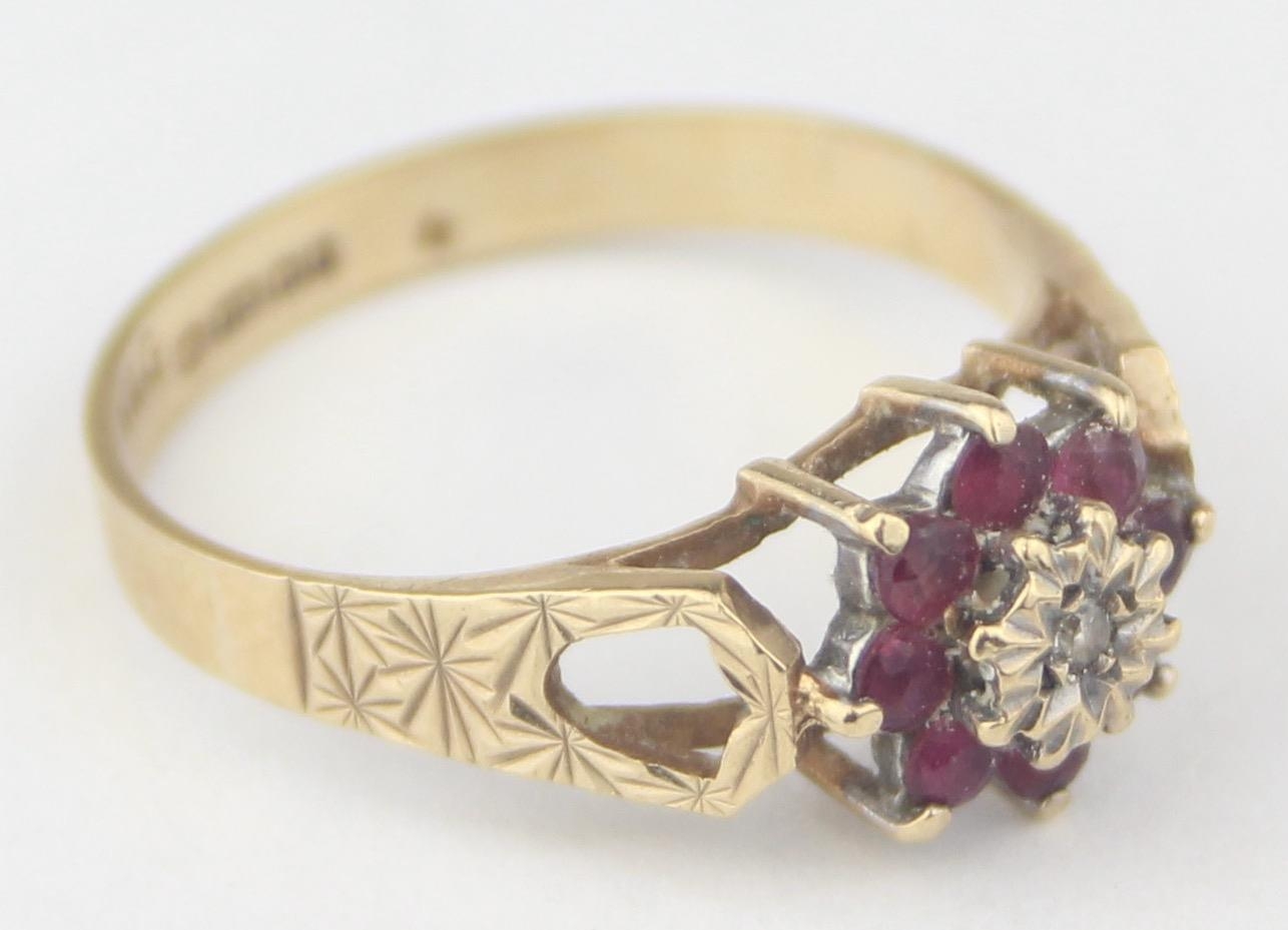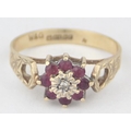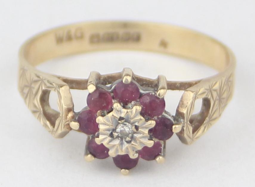 [2.13g, P] - a vintage 9ct gold floral set ring with pink stones and a central illusion set diamond, marked for Birmingham 1979