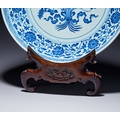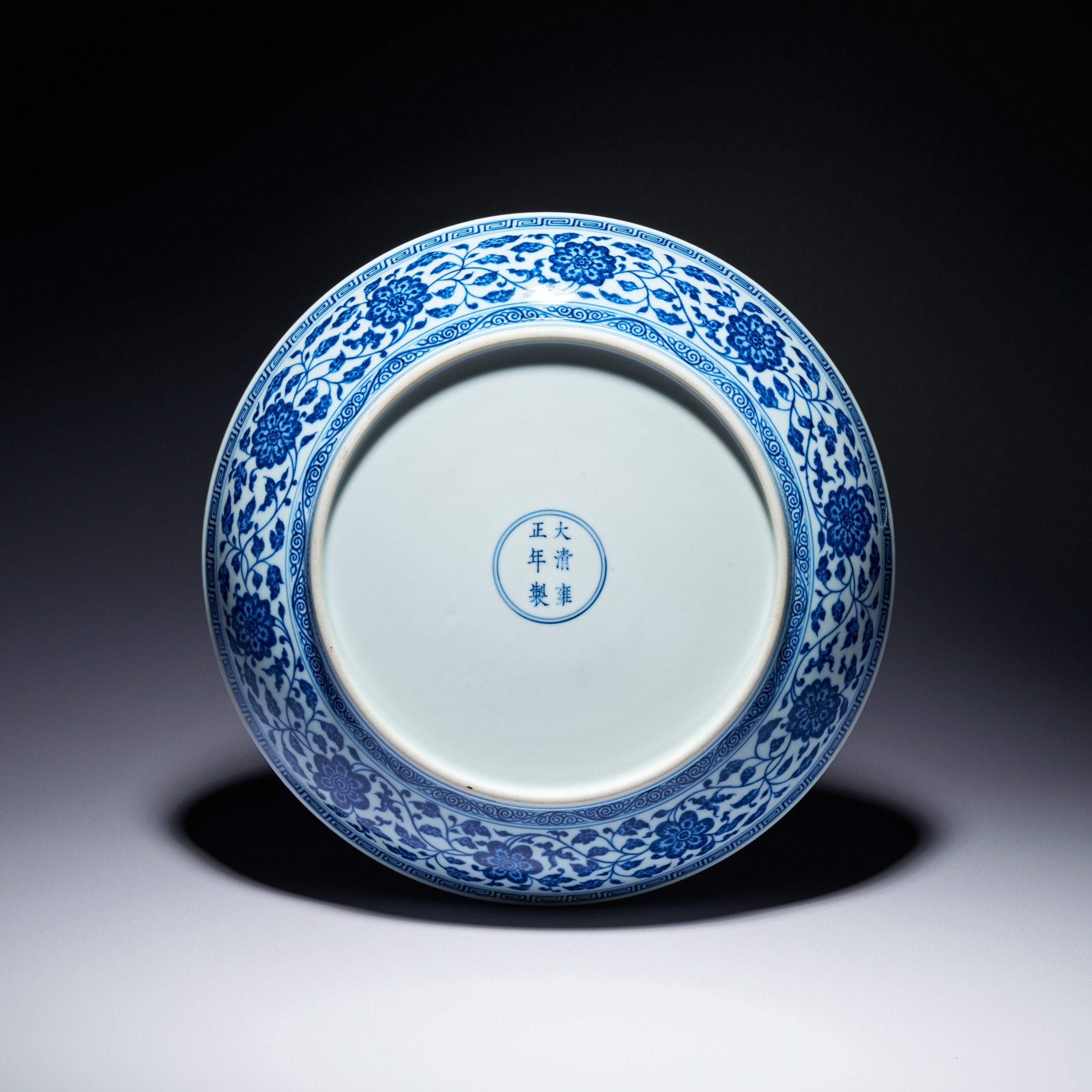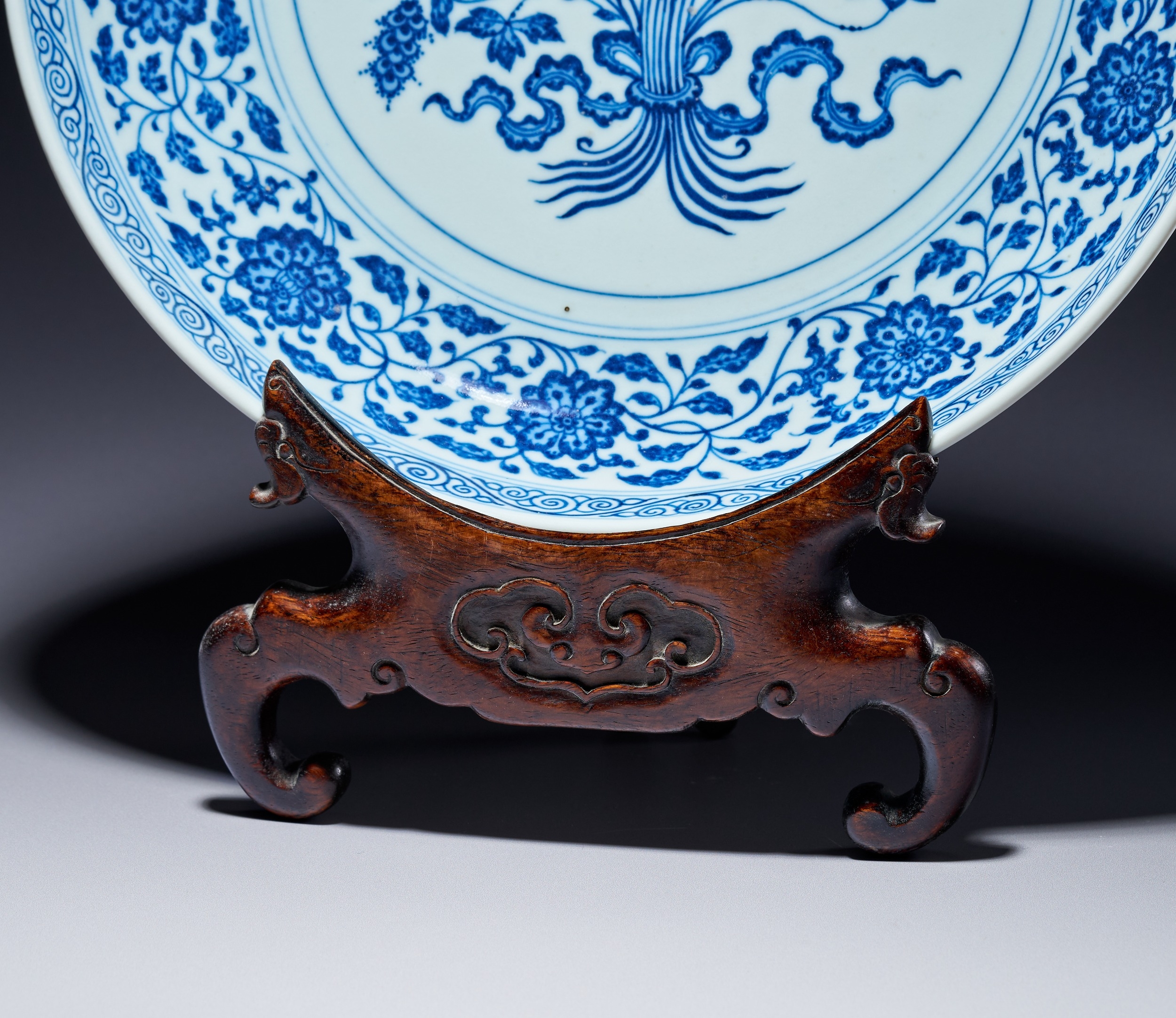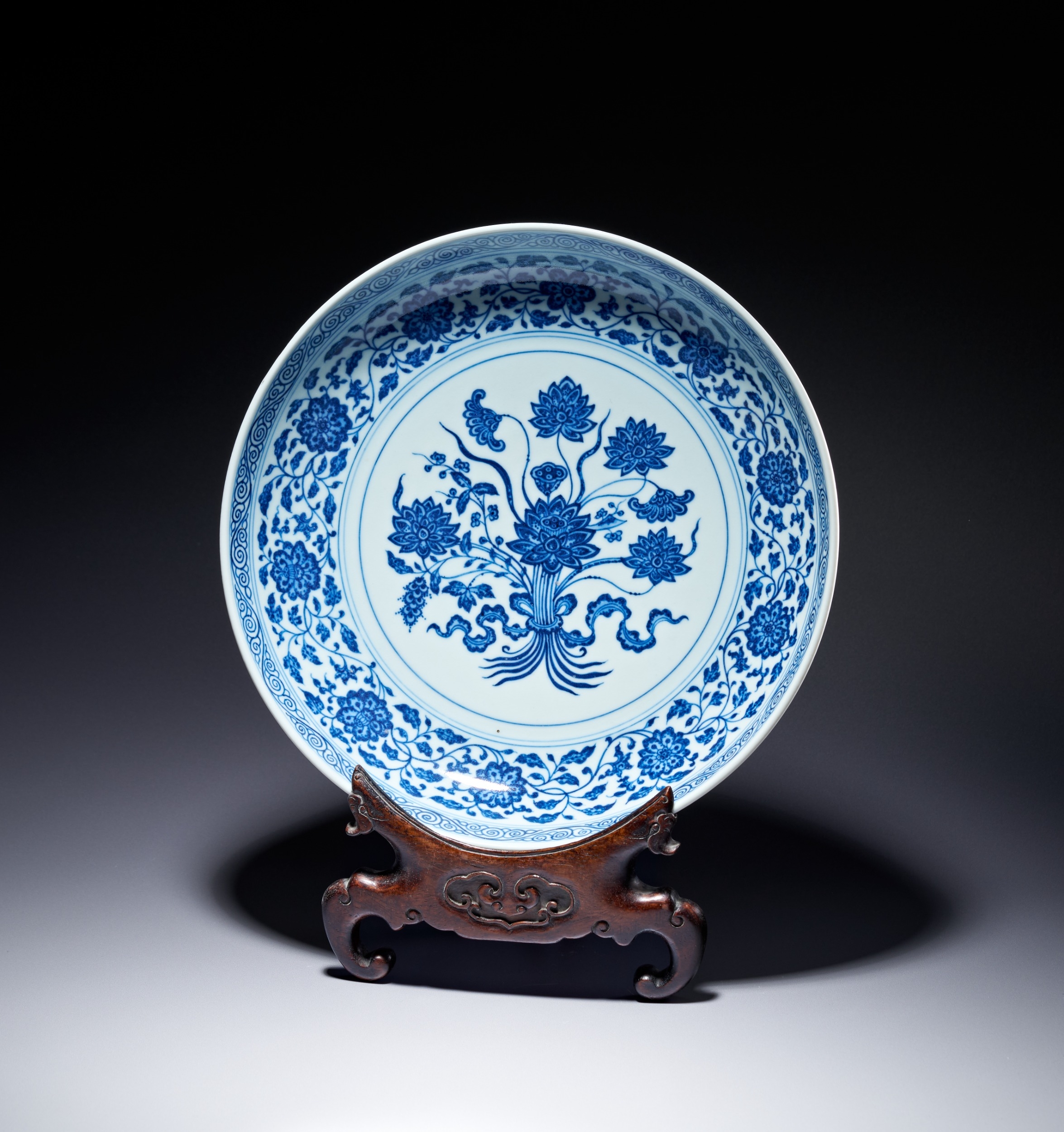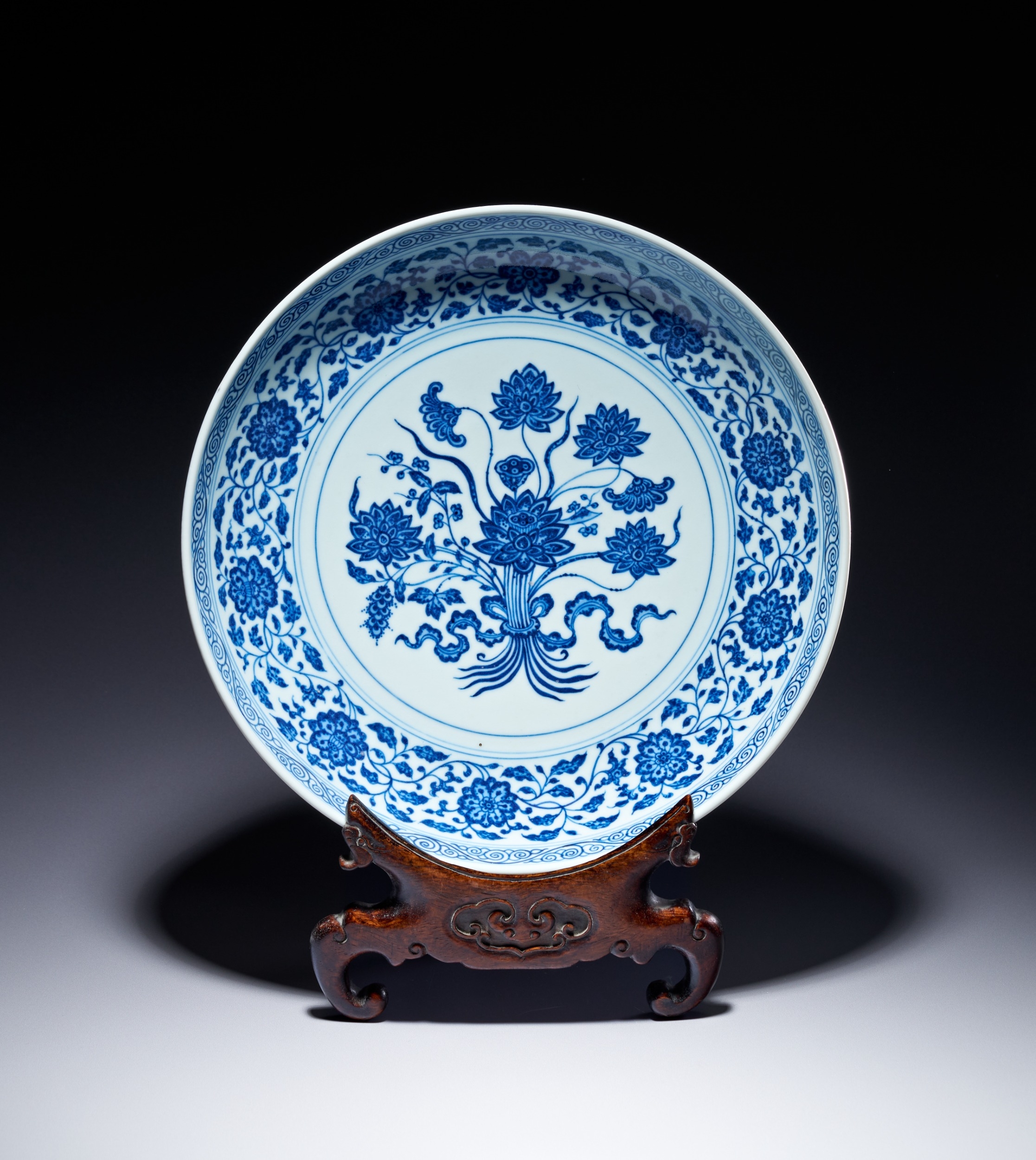 This porcelain dish features a shallow, rounded form with a short foot ring, decorated in underglaze blue in the style of the early Ming dynasty. The interior center is painted with a medallion containing a bouquet of lotus flowers, a seed pod, and leaves, all bound by a ribbon. This central motif is enclosed by double-line borders. The cavetto is decorated with a continuous scroll of composite flowers including peony, lotus, and hibiscus, positioned between double-line borders. The rim is finished with a classic scroll band. The decoration utilizes an intentional heaping and piling effect to emulate the appearance of 15th-century Xuande period wares. The exterior is similarly decorated with a continuous composite floral scroll. The underside of the rim features a key-fret band, and the foot is encircled by a classic scroll border. The base bears an underglaze blue six-character mark in two vertical columns within a double circle. The right column contains the characters Da, Qing, and Yong. The left column contains the characters Zheng, Nian, and Zhi. The mark reads Da Qing Yongzheng Nian Zhi, which translates to Made in the Yongzheng reign of the Great Qing dynasty. The calligraphy is consistent with imperial marks of the period. The dish is accompanied by a custom-carved wooden display stand with ruyi-head and scrolling cloud motifs.