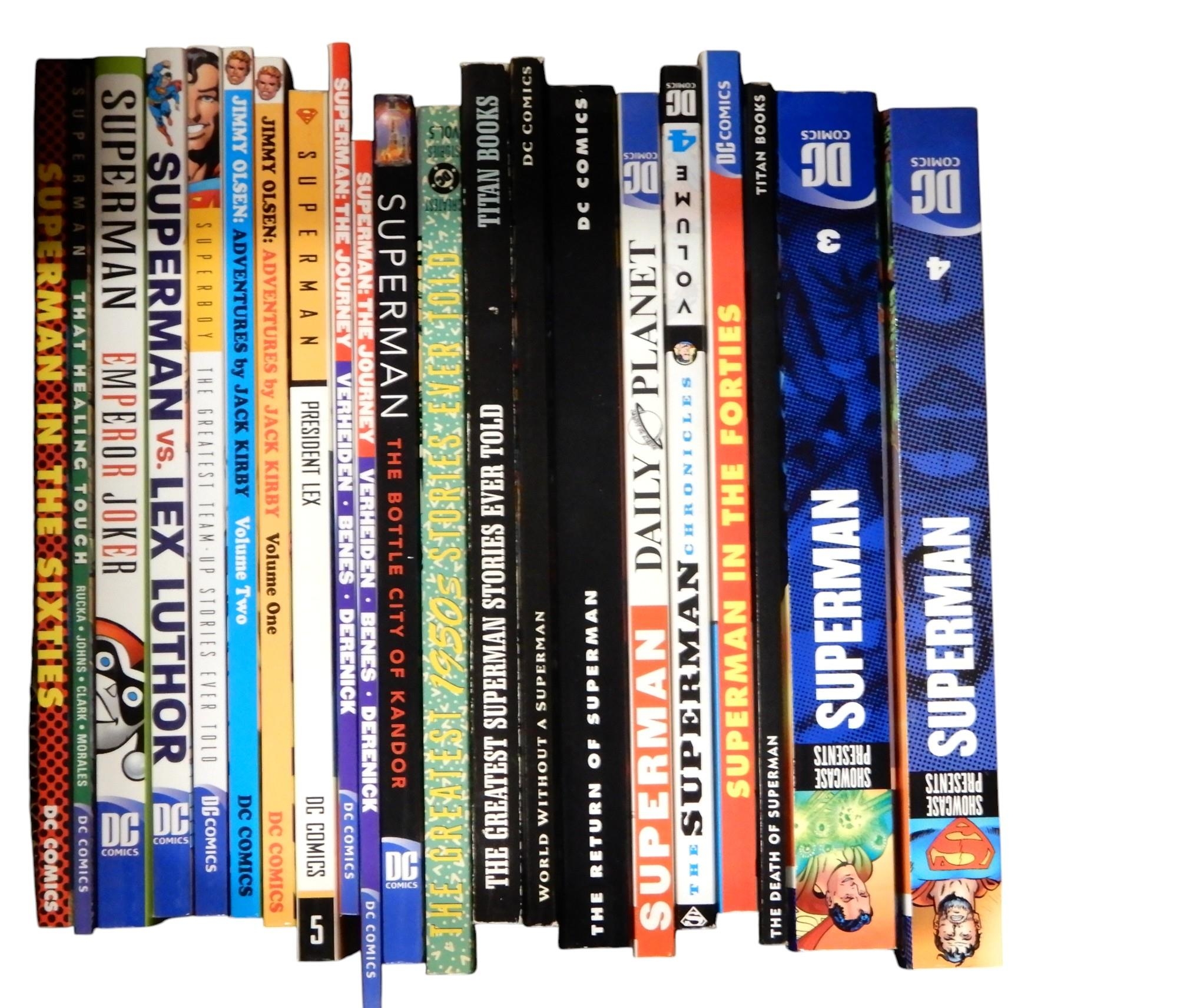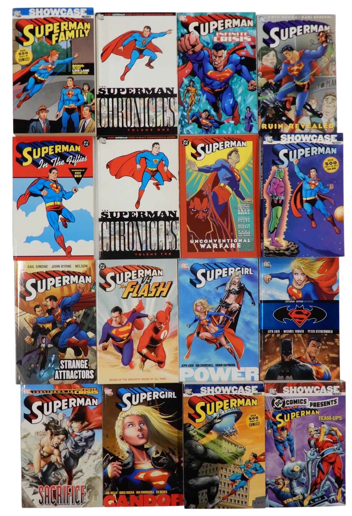 DC; A collection of Superman trade paperbacks including Superman Chronicles 1-4, Superman in the Forties, Sixties, Superman Team-ups, Superman vs the Flash, Unconventional Warfare, Infinite Crisis, Superman Family, Sacrifice, Supergirl Power, Candor, Superman - Batman - Supergirl etc