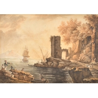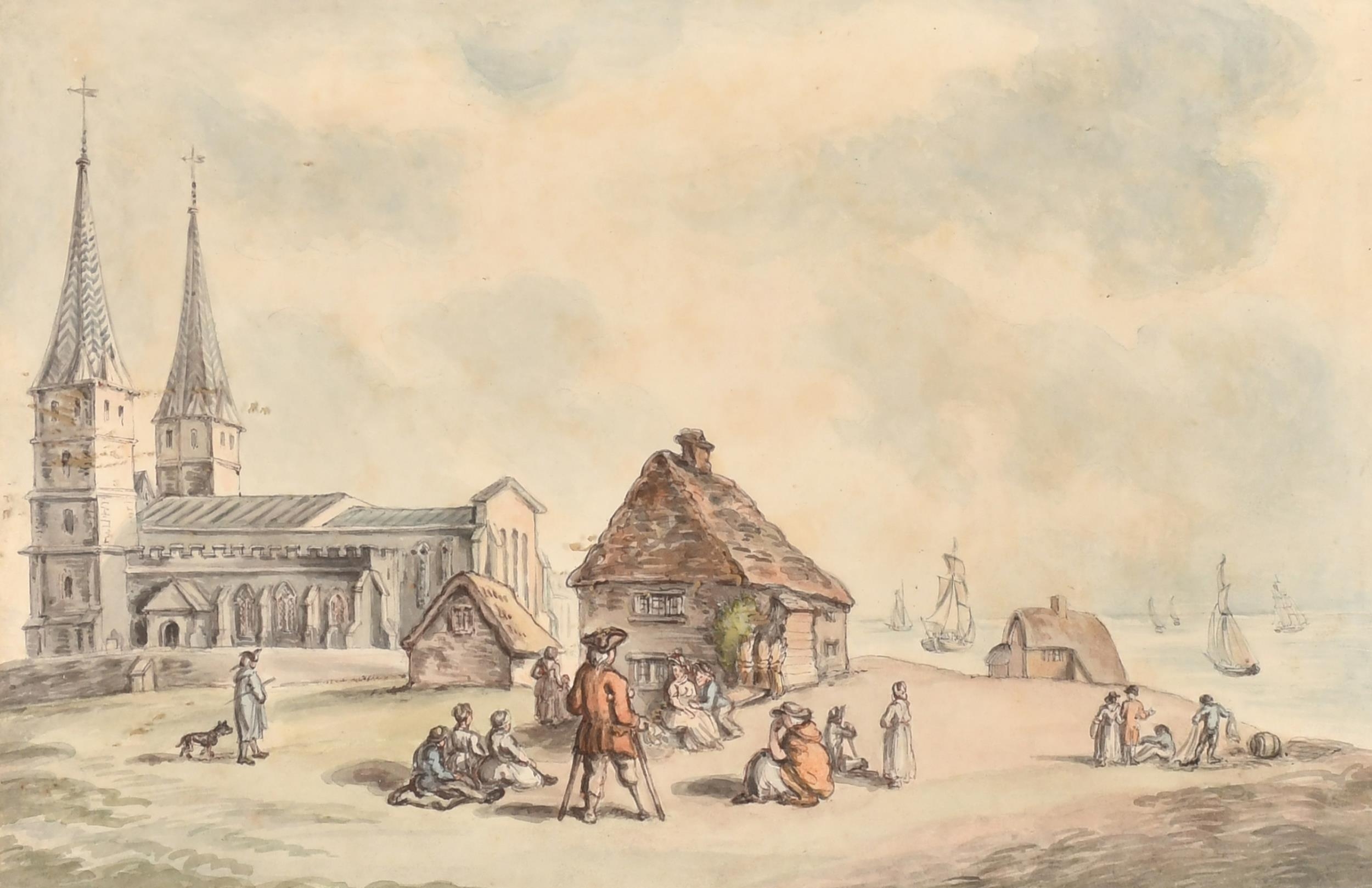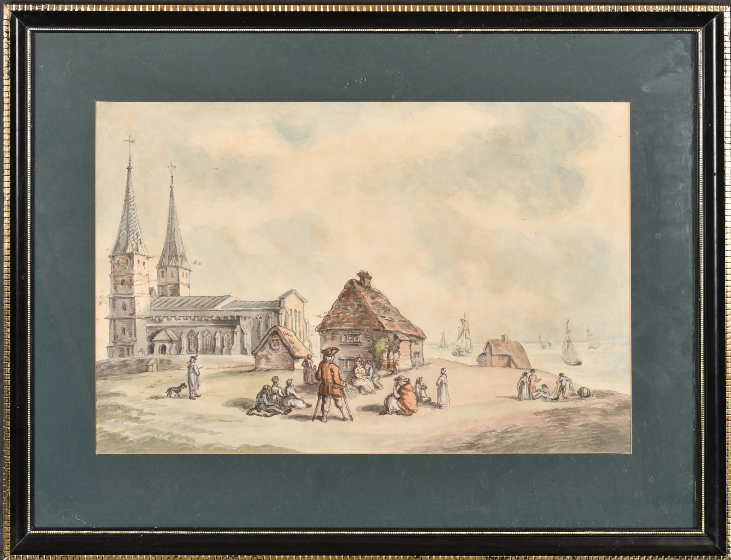 Early 19th Century English School. Figures in a Coastal Landscape, Watercolour, 9.5" x 14.25" (24.1 x 36.2cm)