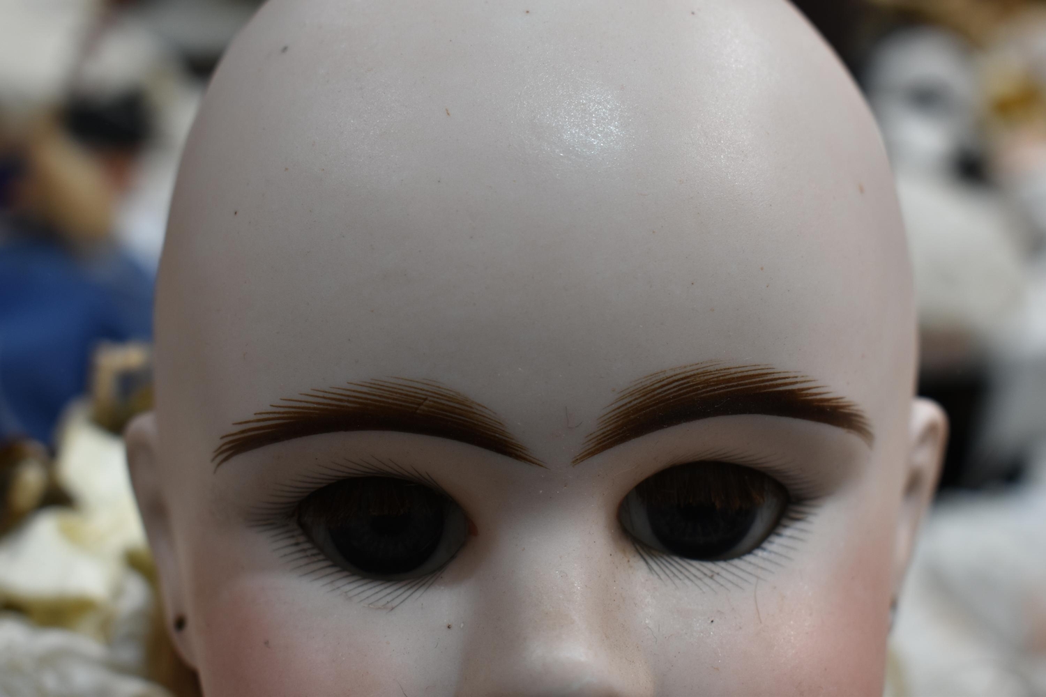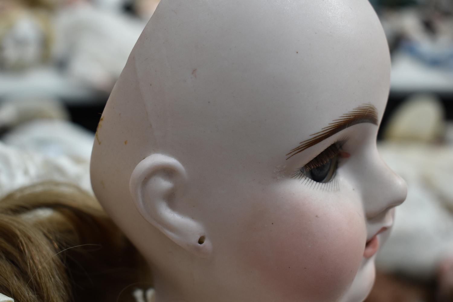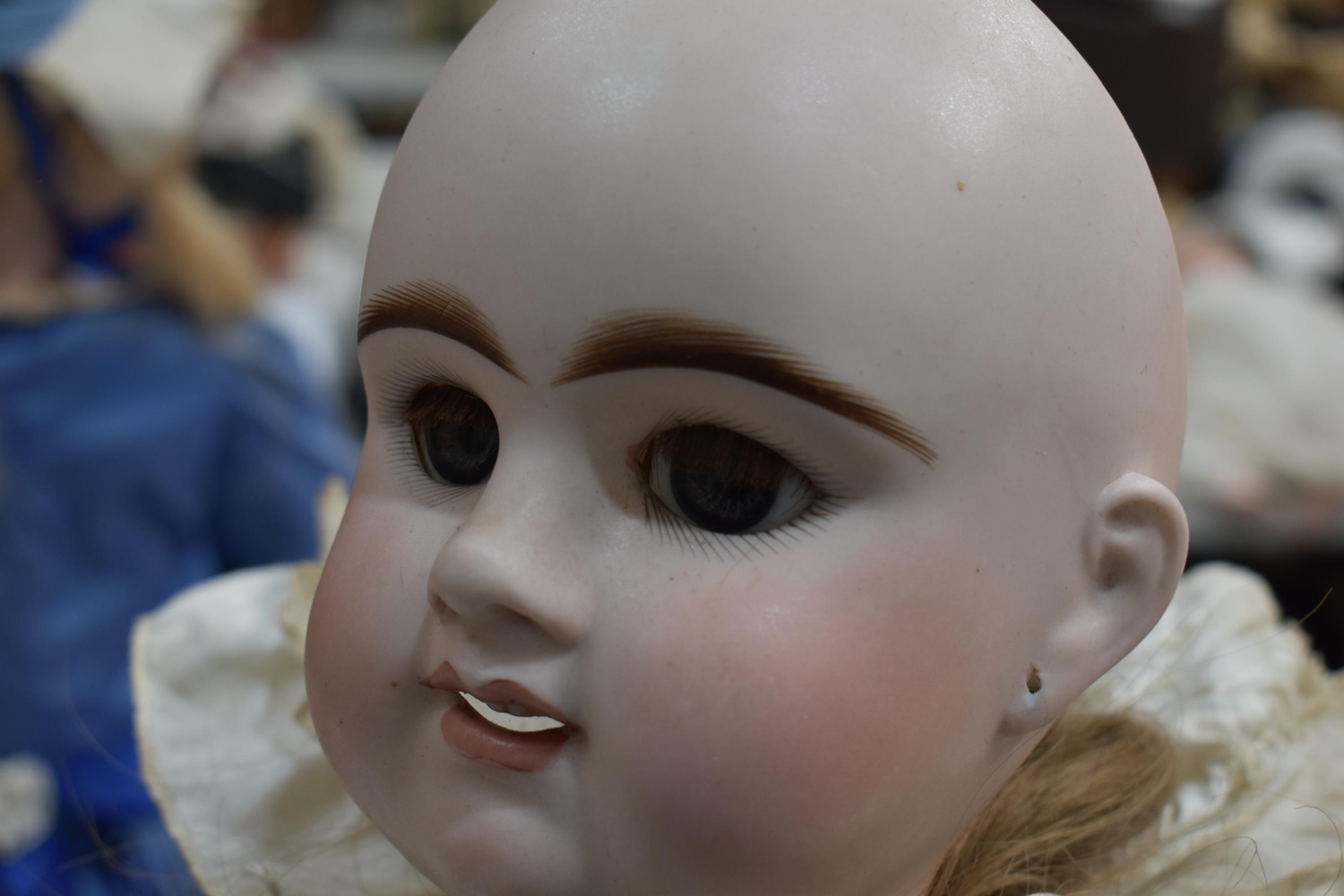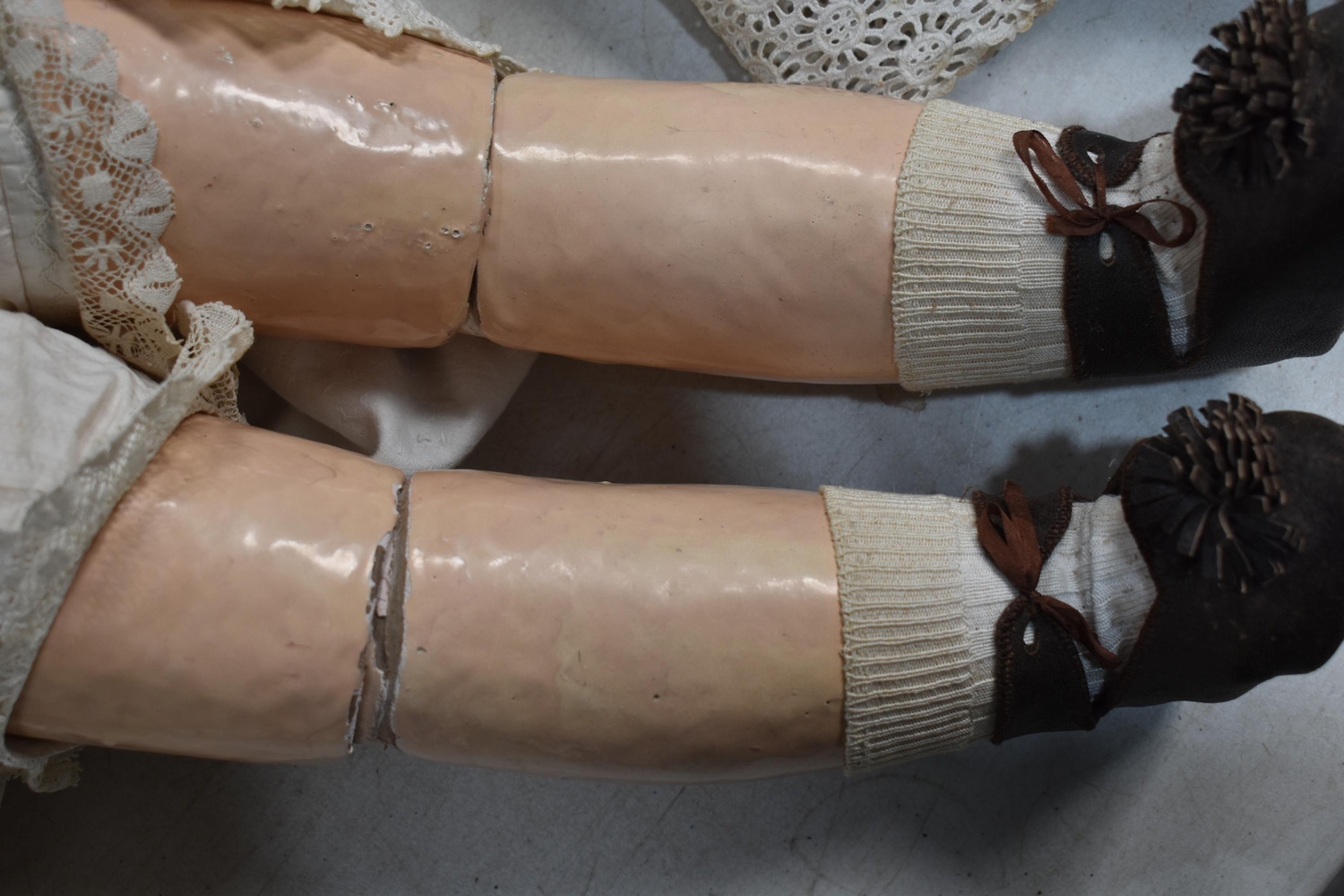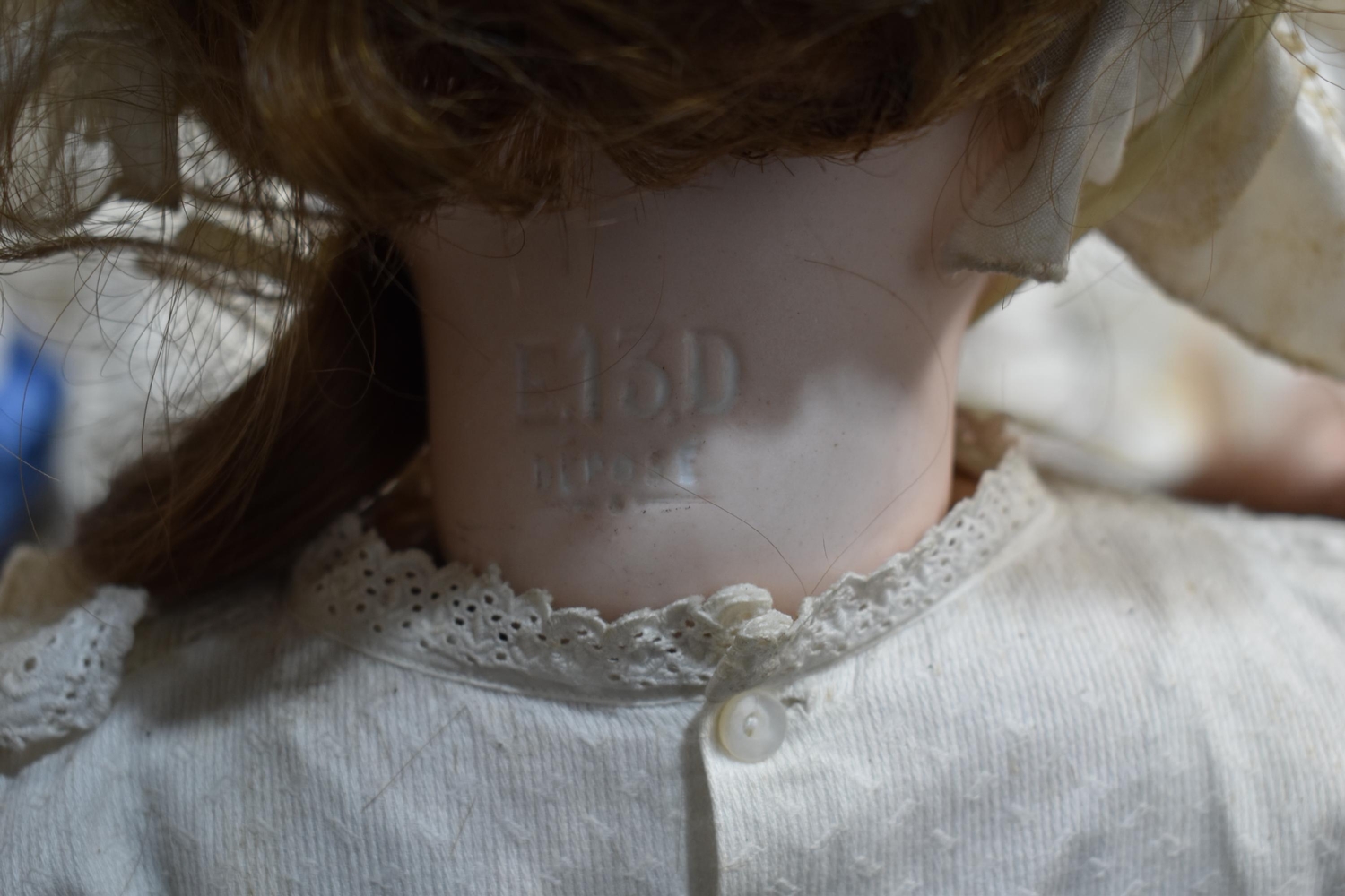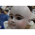 An Etienne Denamur Depose bisque porcelain head bebe companion doll, no. 13, with composition body and articulated limbs 73cm tall.
