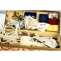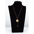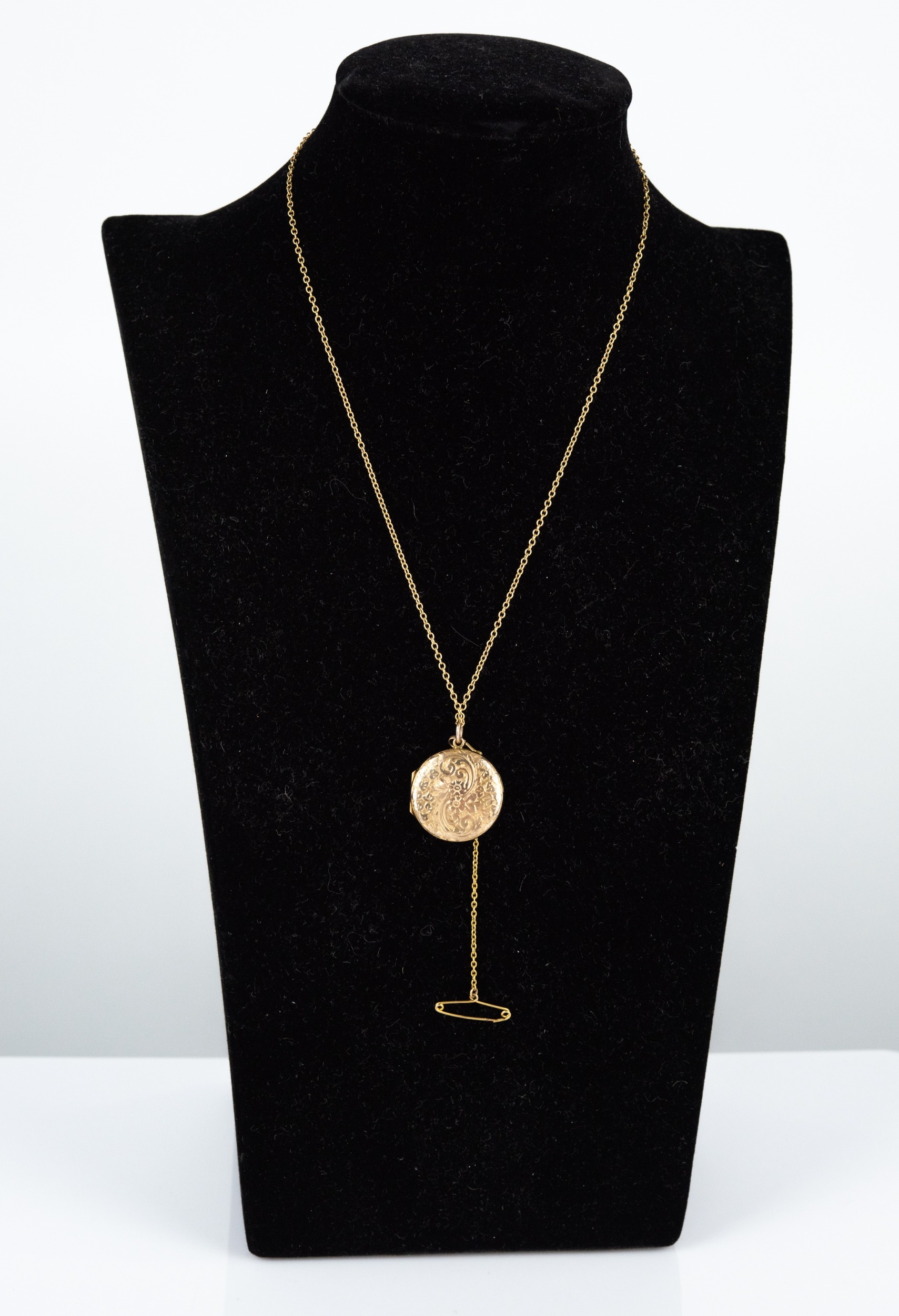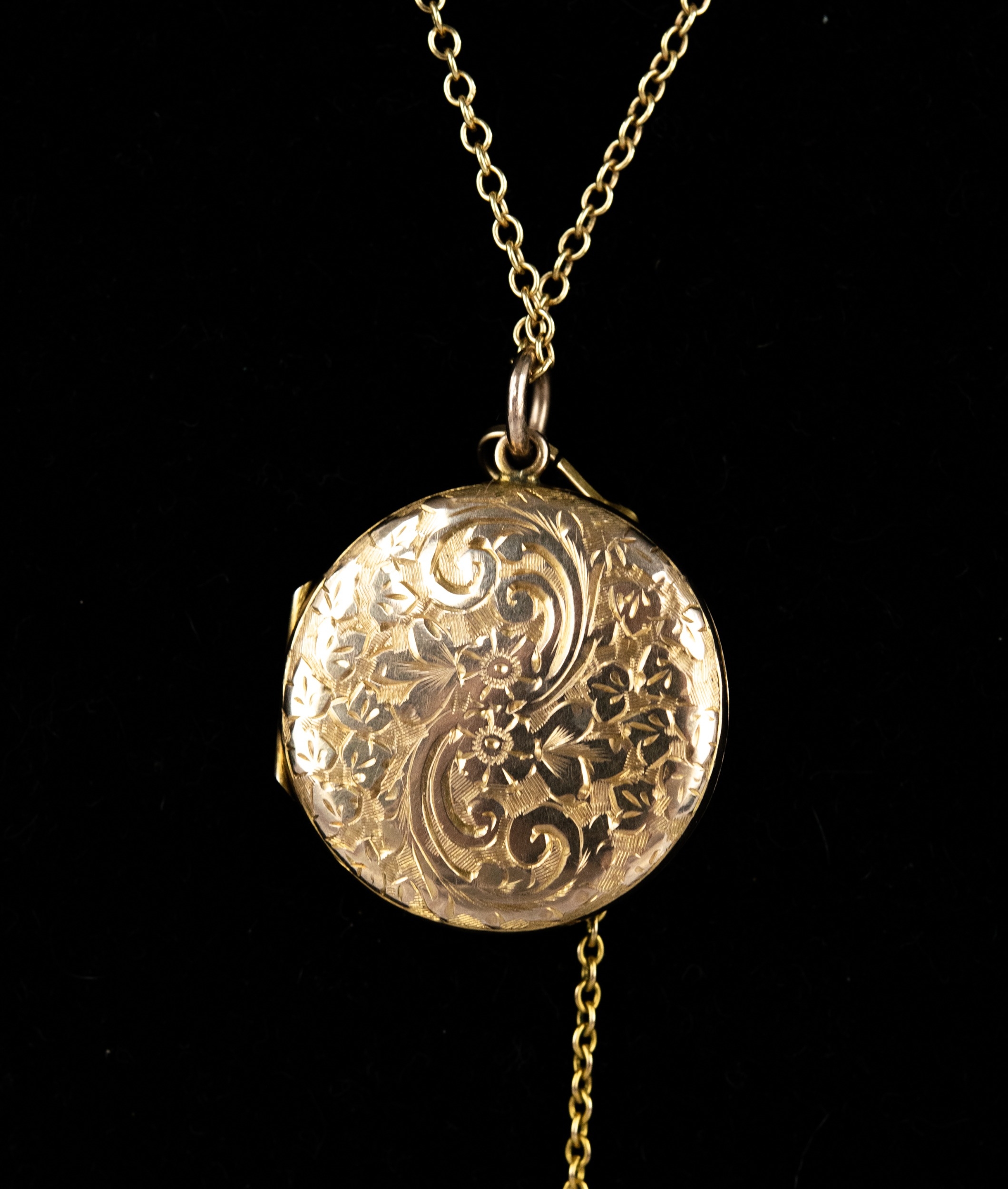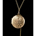GOLD COLOURED METAL CIRCULAR LOCKET PENDANT, all-over foliate scroll engraved, 4.9gms, and a gold-plated fine chain necklace with ring clasp, 17" long (43cm) and a safety chain (locket tests low grade gold)