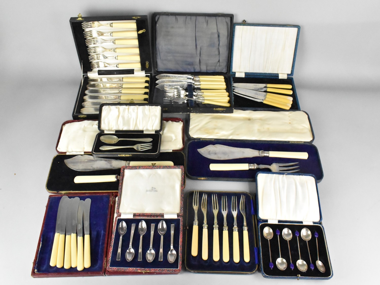 A Collection of Various Cased Cutlery to Include Coffee Bean Spoons, Cased Set of Walker & Hall Teaspoons, Fish Servers etc