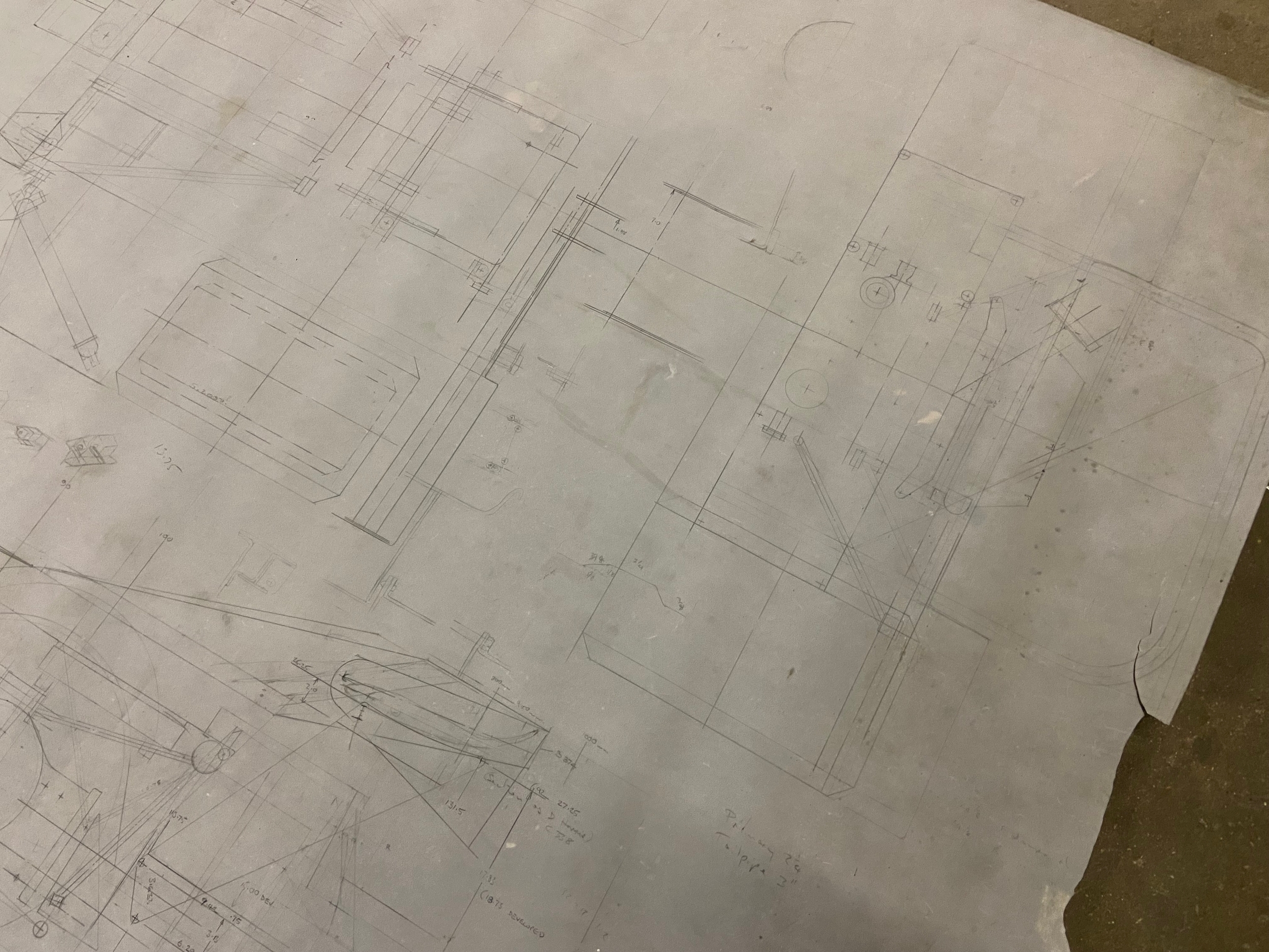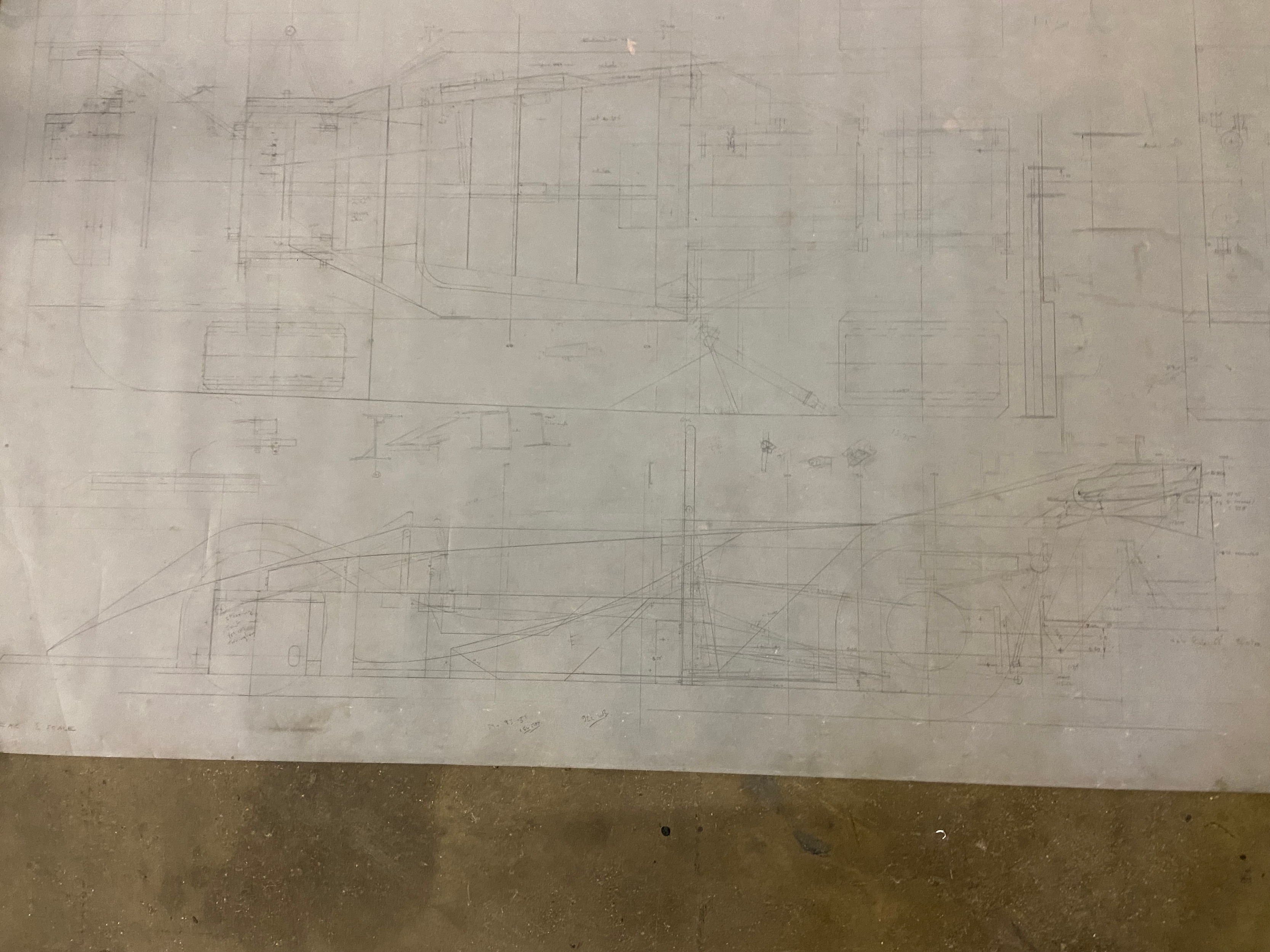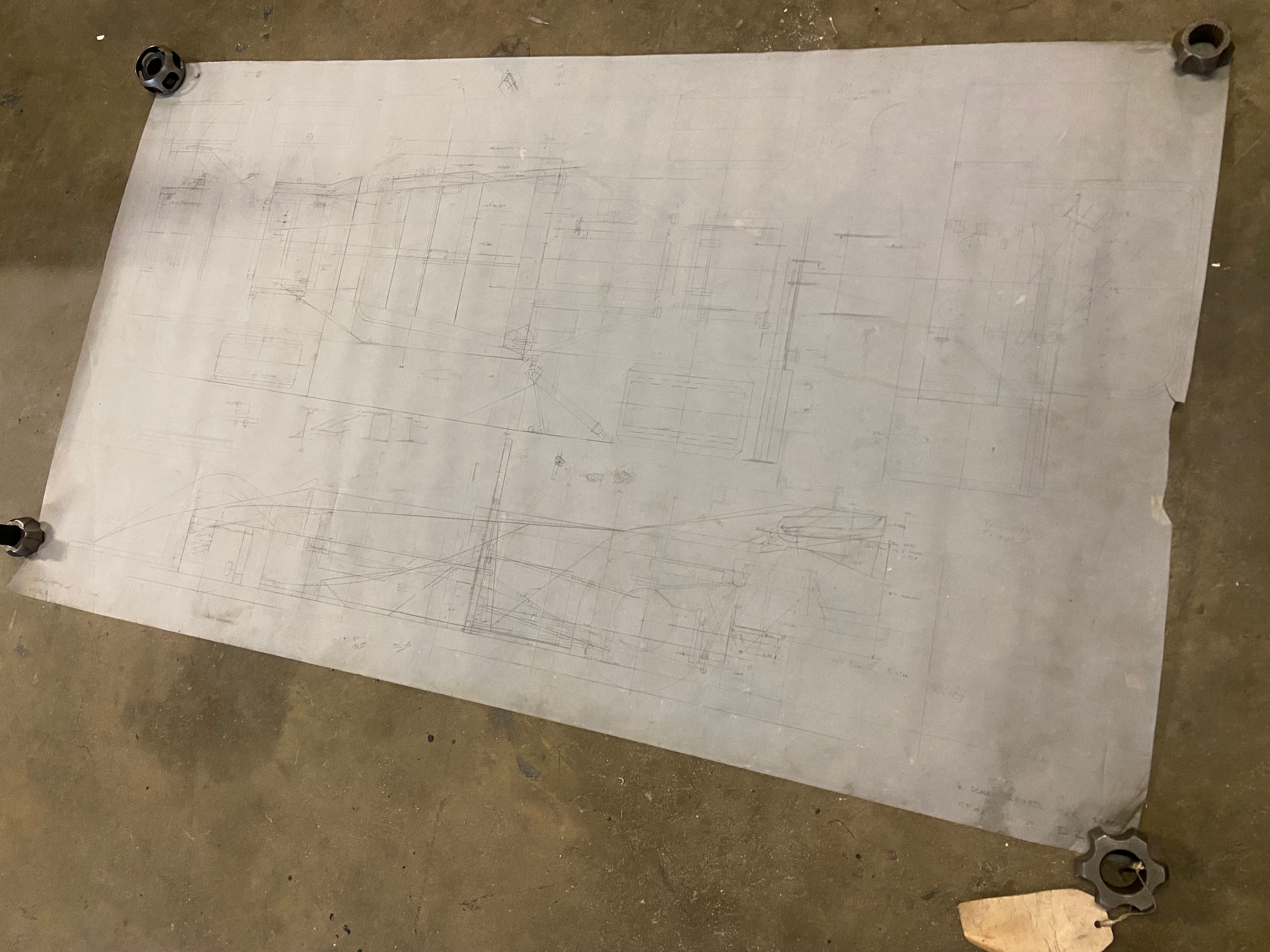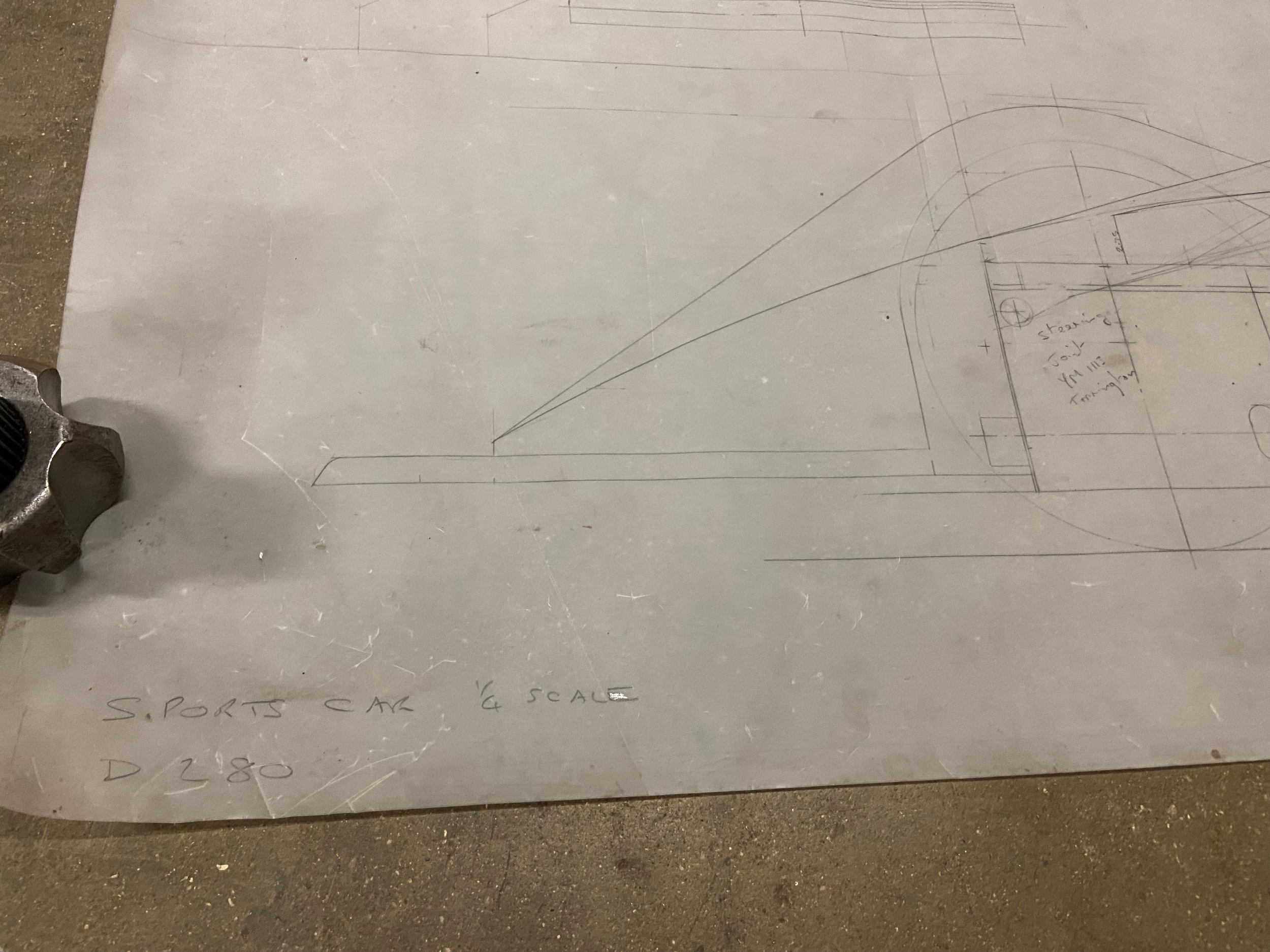 Original Mike Pilbeam 1/4 scale technical drawing for the MP43 hillclimb car. Dated Nov 79. Approx 136cm x 76cm.