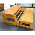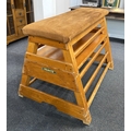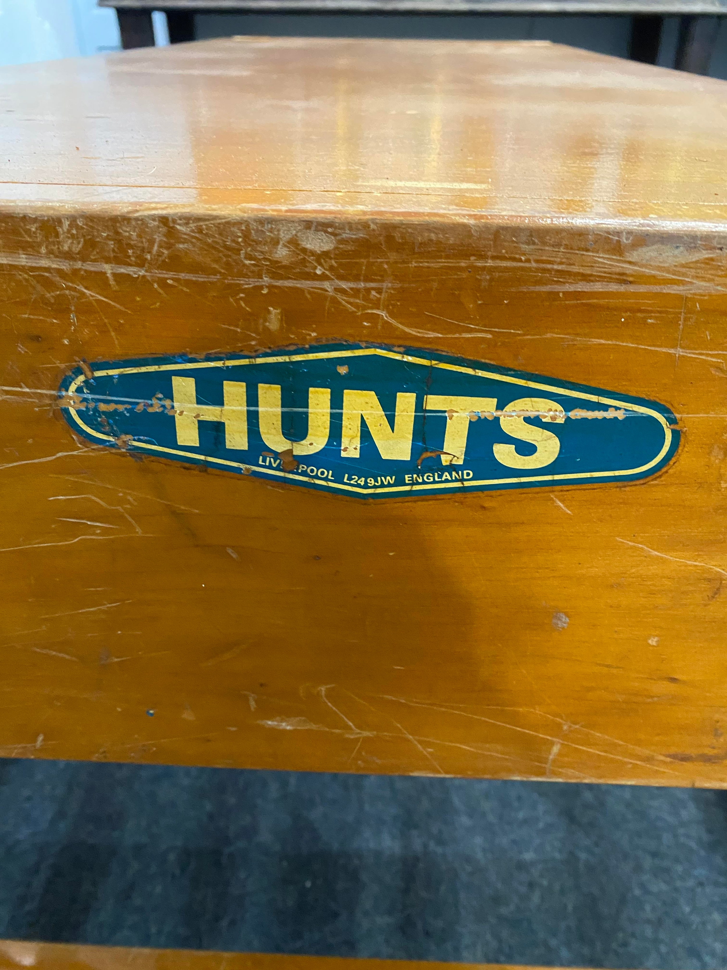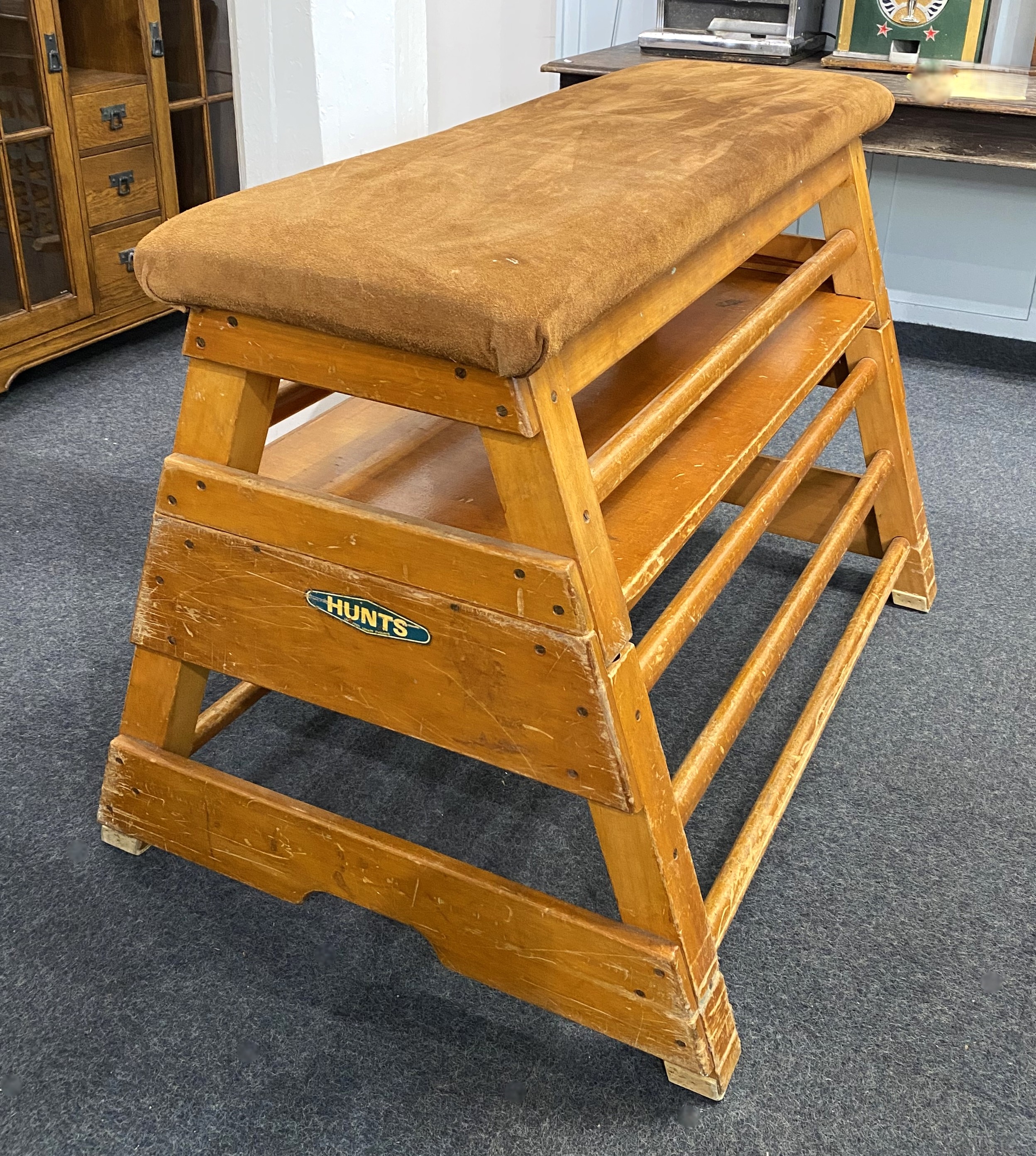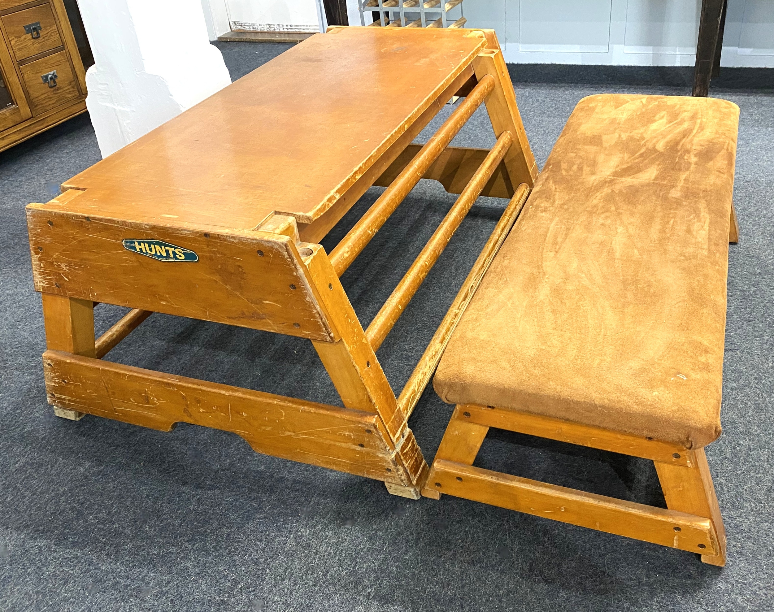 A vintage 'Hunts of Liverpool' vaulting box, in two sections, with padded suade seat, these are often converted to a bench and table, a relatively simple conversion for a cool quirky furniture solution for the retro and vintage interior, 139cm long, by 92cm wide at the base.