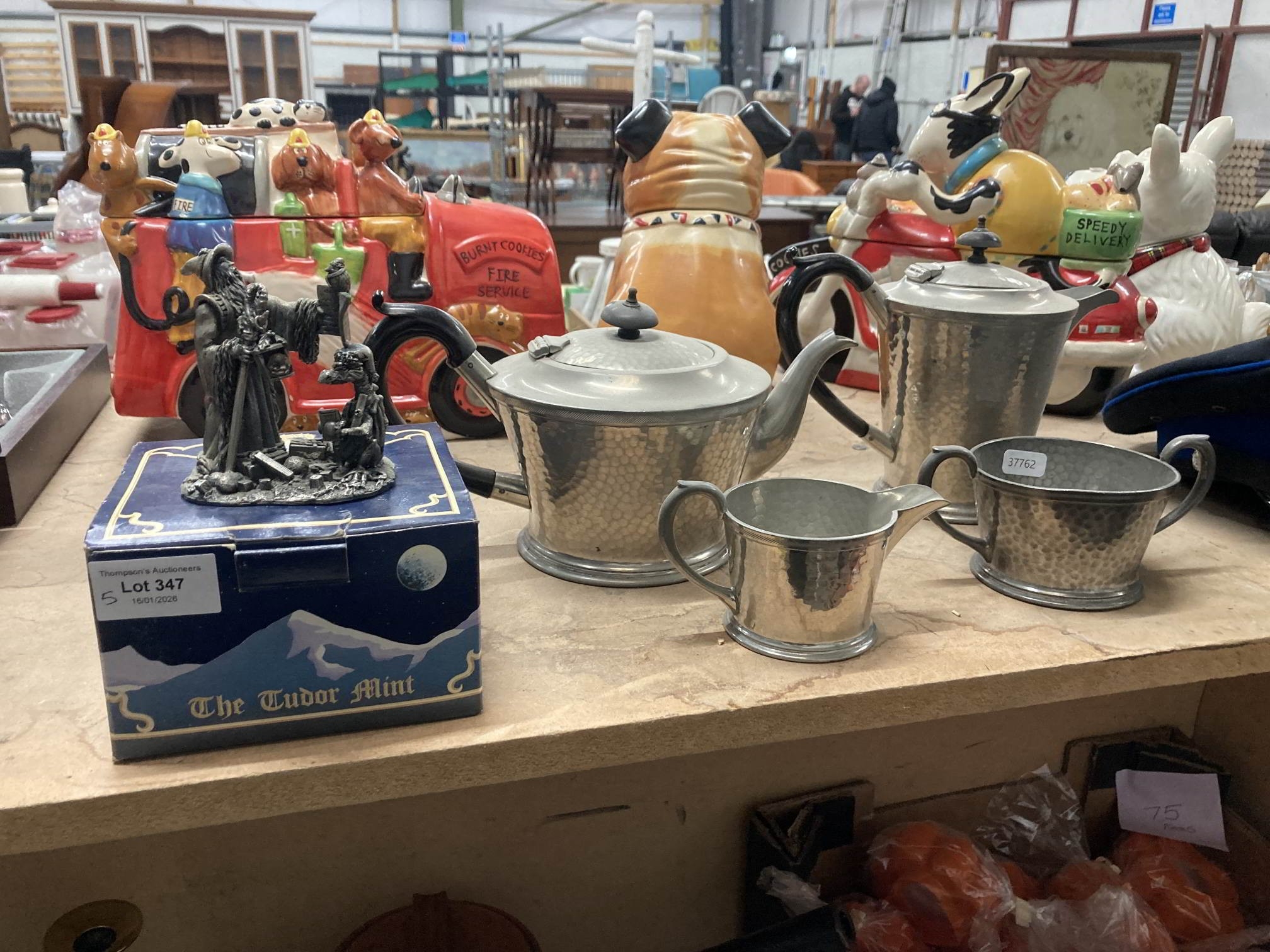 4 piece Period Pewter tea set & a Tudor Mint pewter figurine