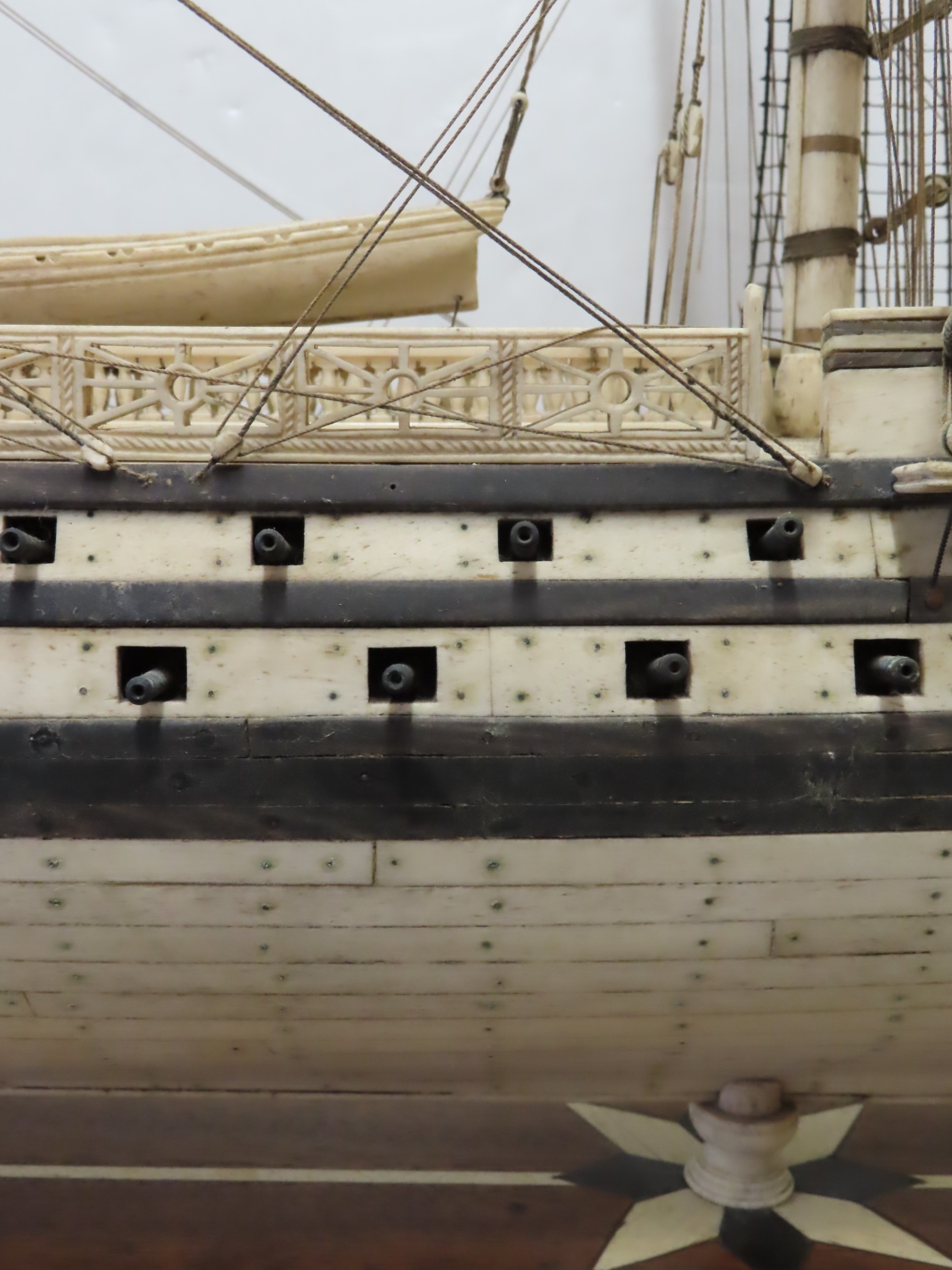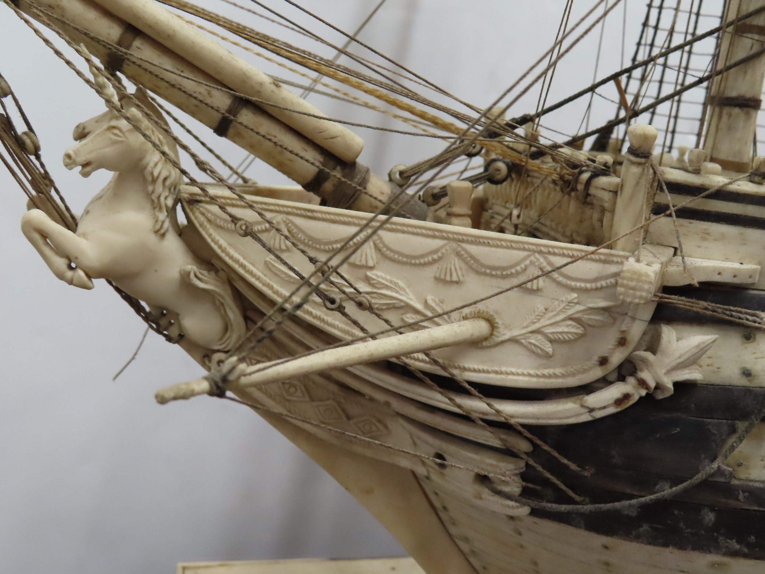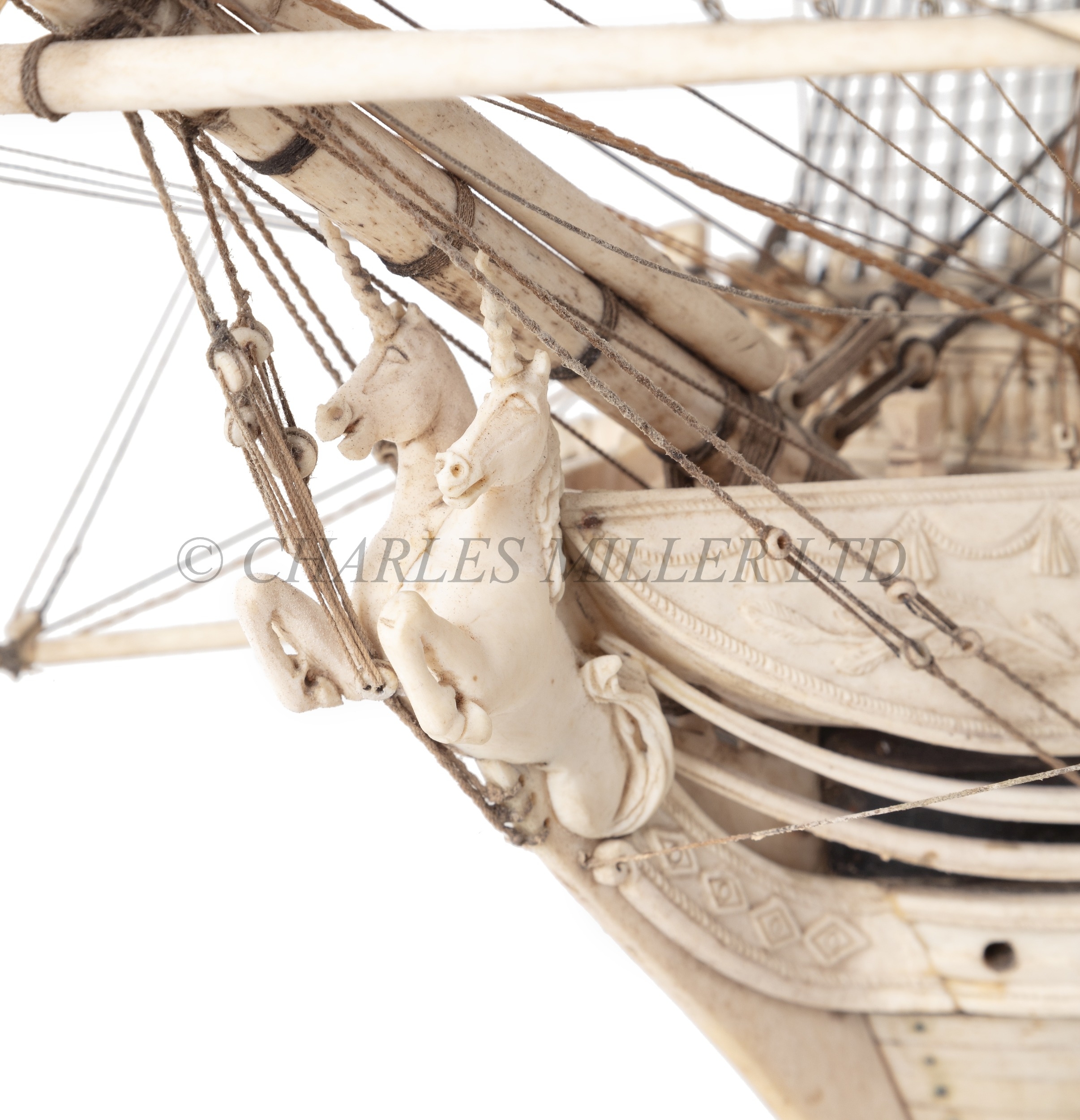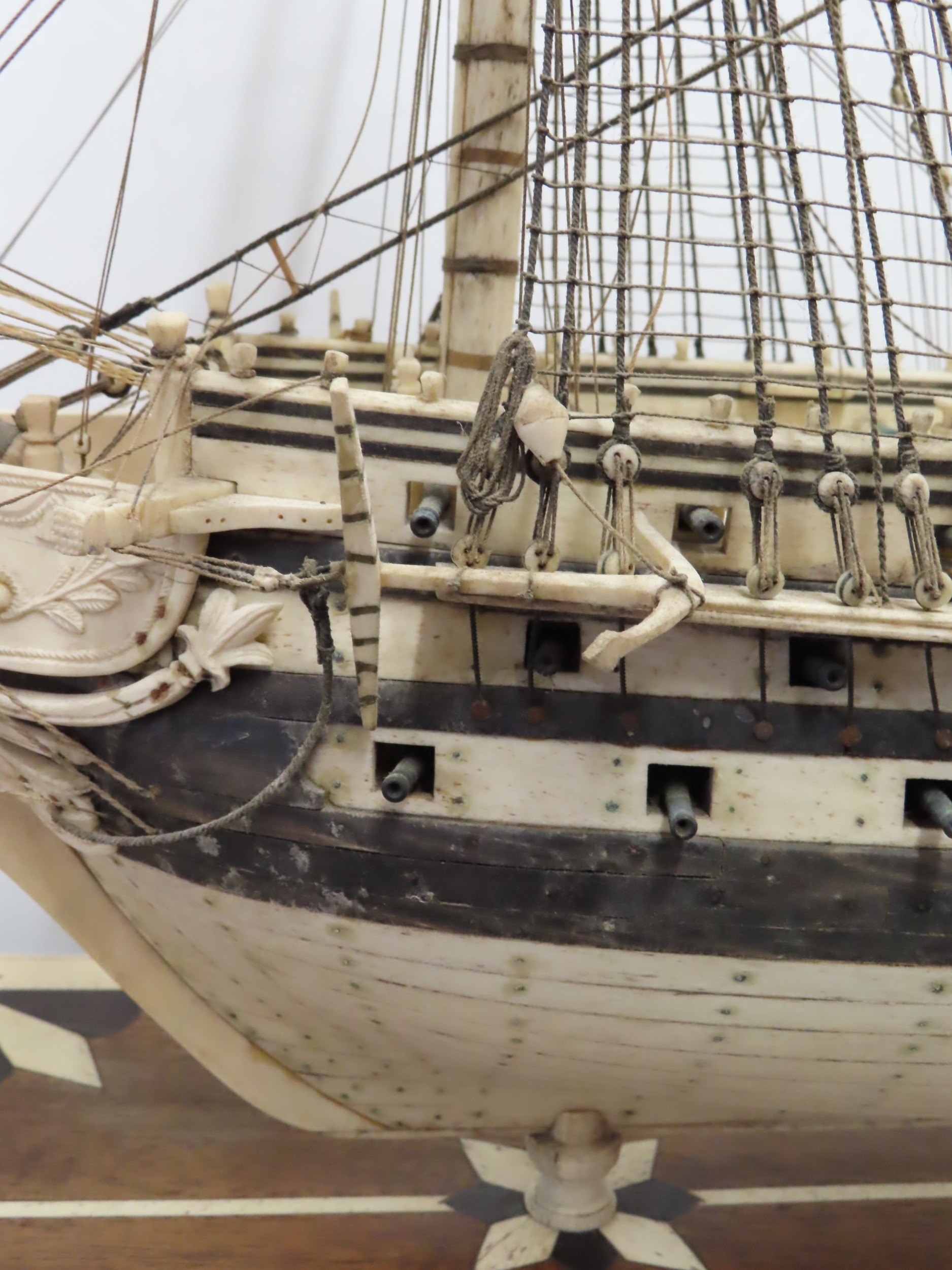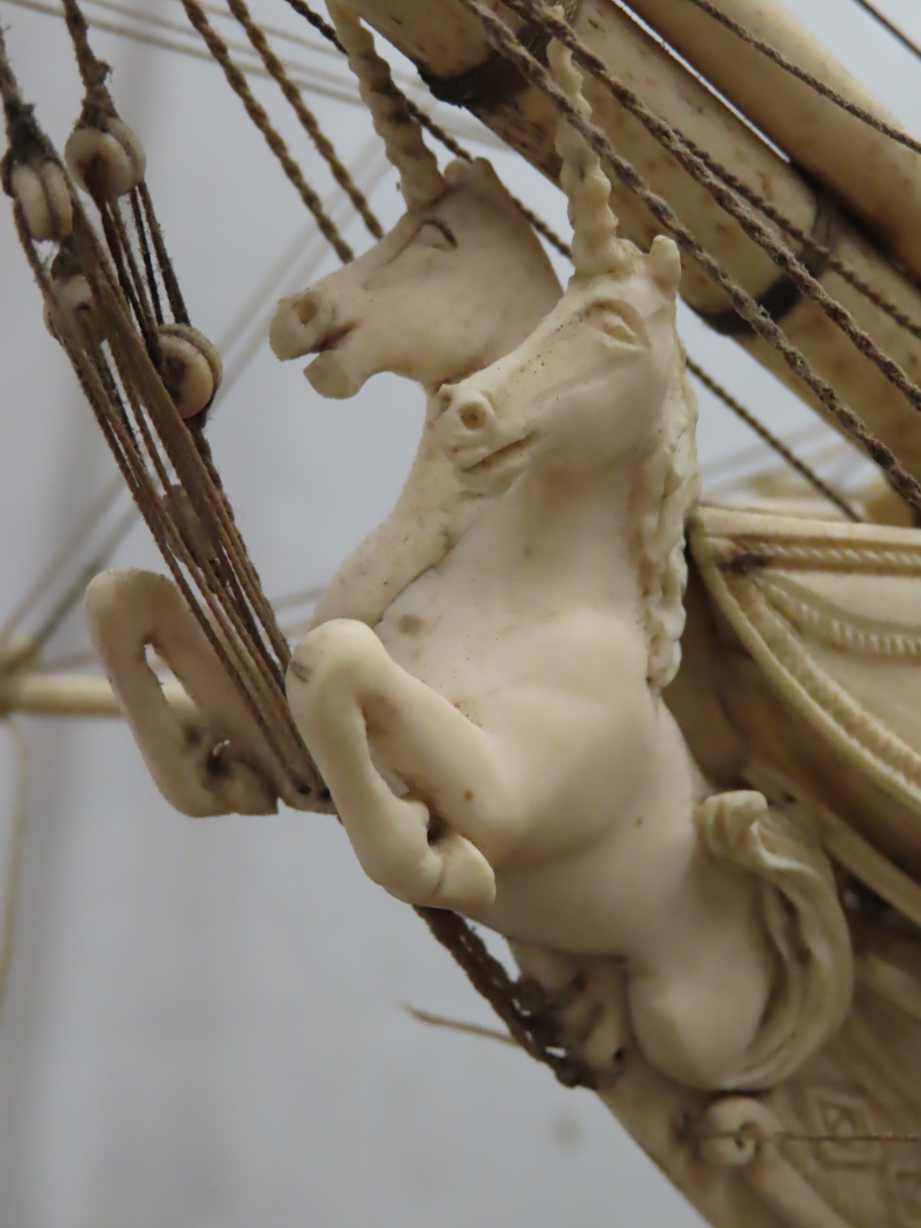 the 31in. planked and pinned hull with contrasting main and secondary wales, oxidised brass guns in ports, double-equestrian unicorn figurehead and finely carved stern with balcony, planked decks with strakes and fittings including gratings, capstan, water casks, well deck with balustrade and conjoined fitted boats over, bilge pump, covered companionways, guns in stepped bone carriages, deck light, bound masts with yards, s'tun'sl booms, standing and running rigging with bone blocks and tackle, mounted via three bone supports to inlaid marquetry display base with feet -- 36 x 52in. (91.5 x 132cm.)