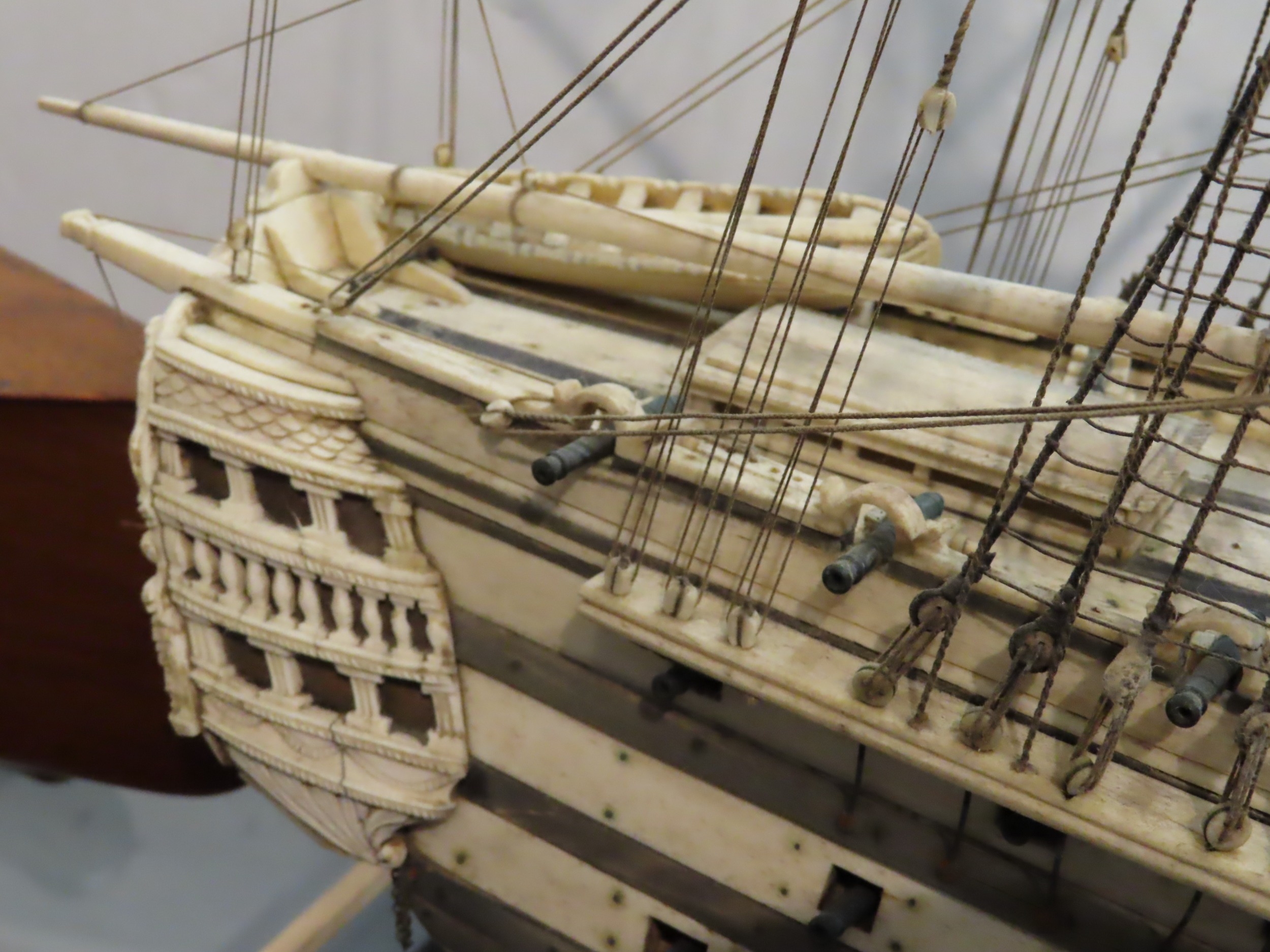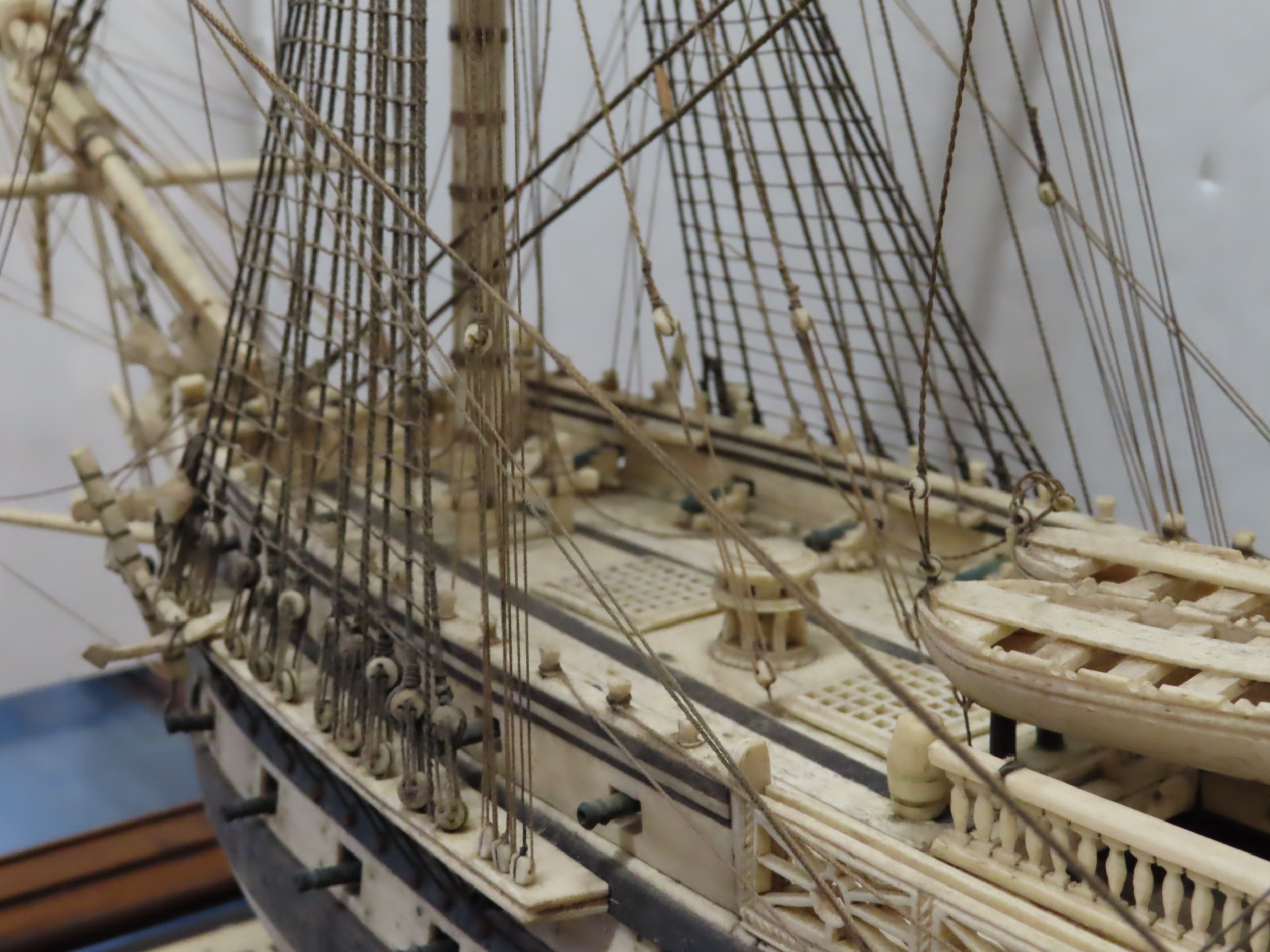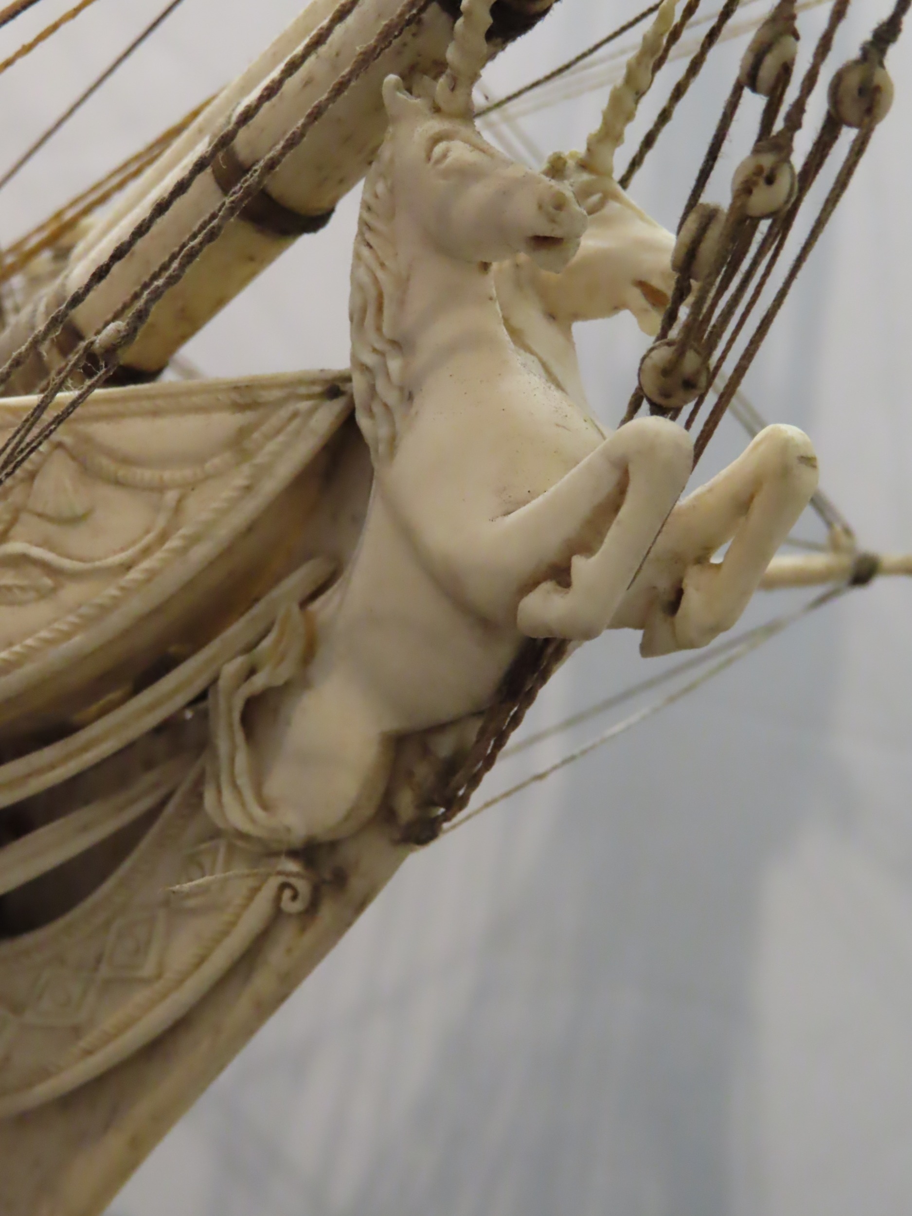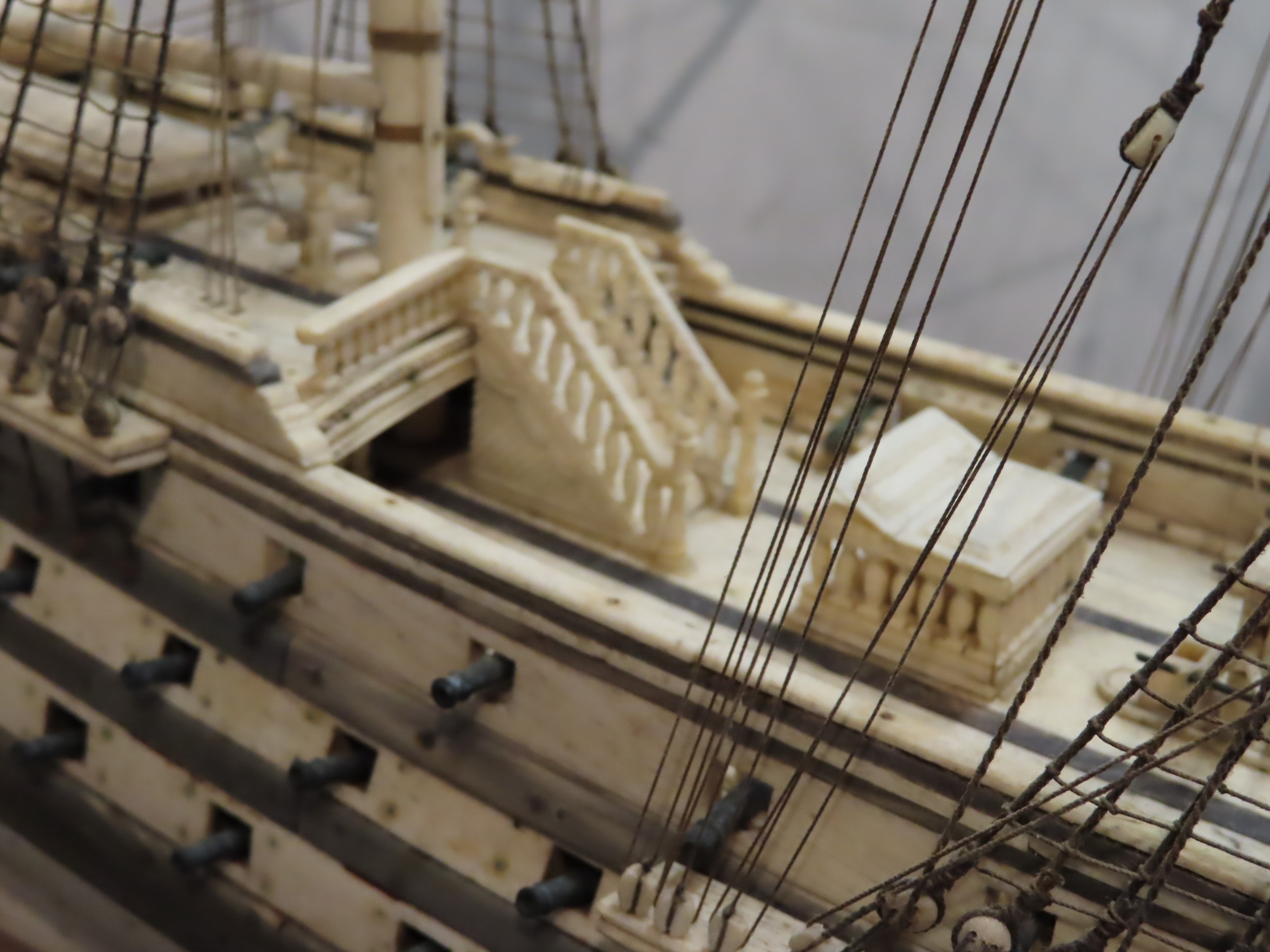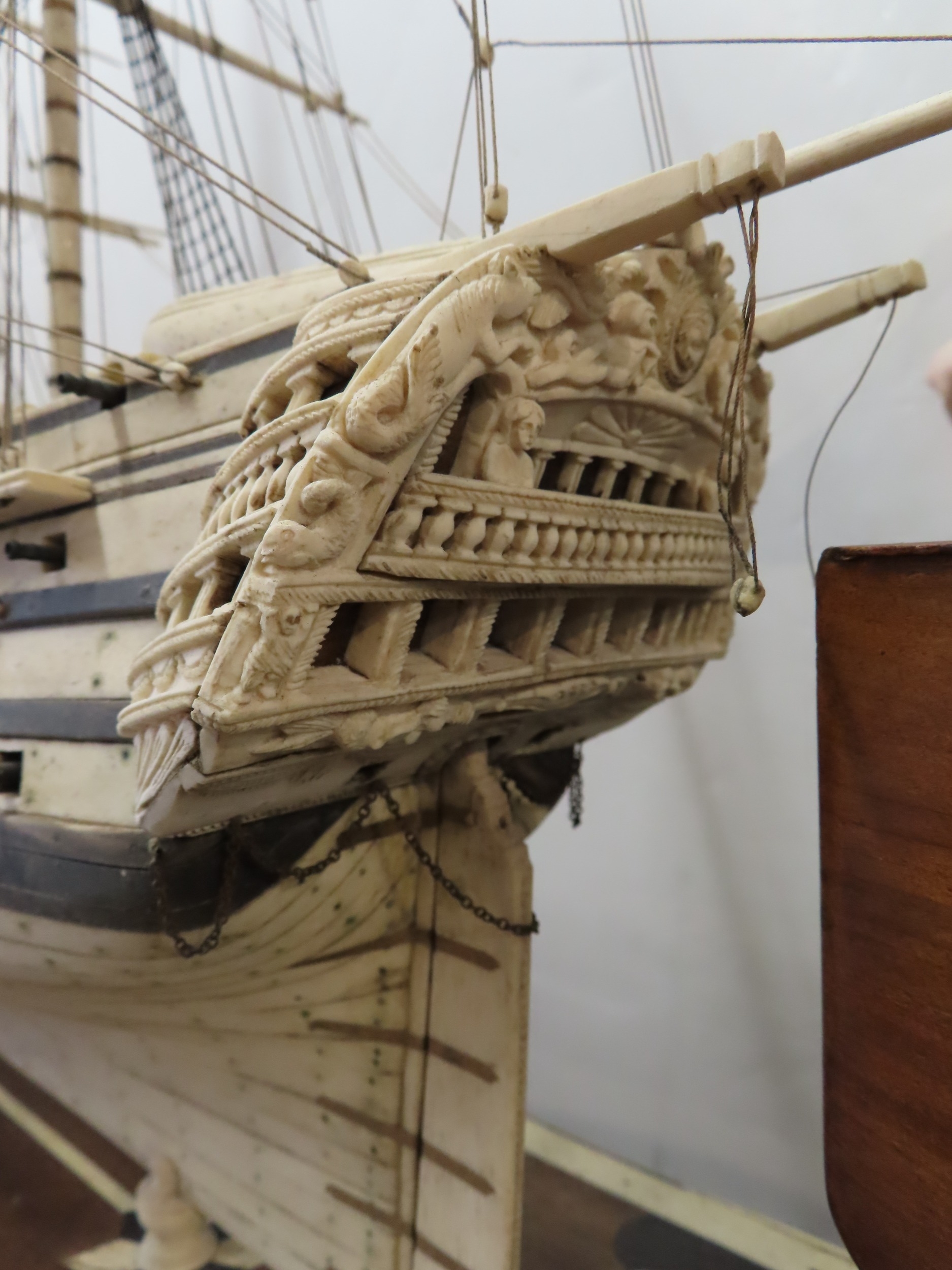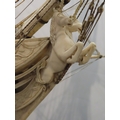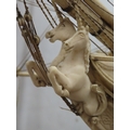 the 31in. planked and pinned hull with contrasting main and secondary wales, oxidised brass guns in ports, double-equestrian unicorn figurehead and finely carved stern with balcony, planked decks with strakes and fittings including gratings, capstan, water casks, well deck with balustrade and conjoined fitted boats over, bilge pump, covered companionways, guns in stepped bone carriages, deck light, bound masts with yards, s'tun'sl booms, standing and running rigging with bone blocks and tackle, mounted via three bone supports to inlaid marquetry display base with feet -- 36 x 52in. (91.5 x 132cm.)