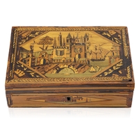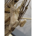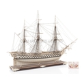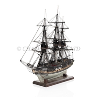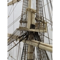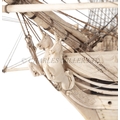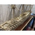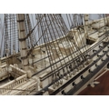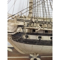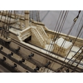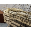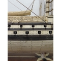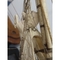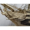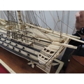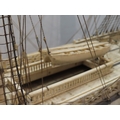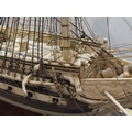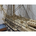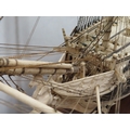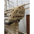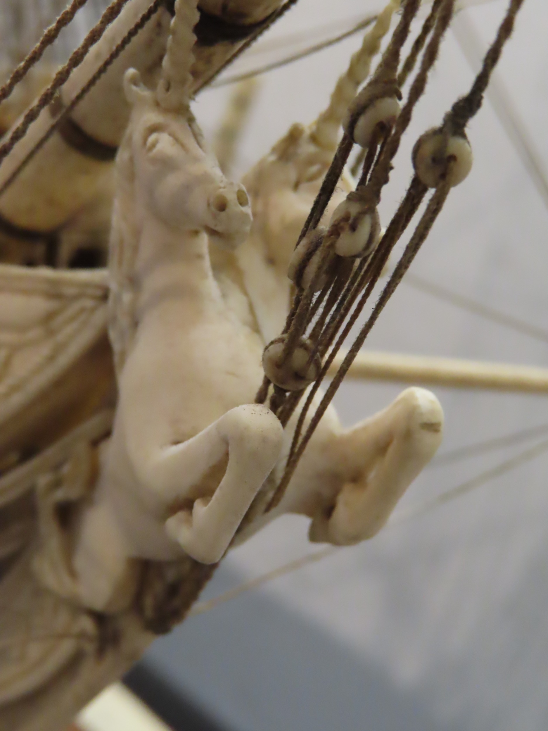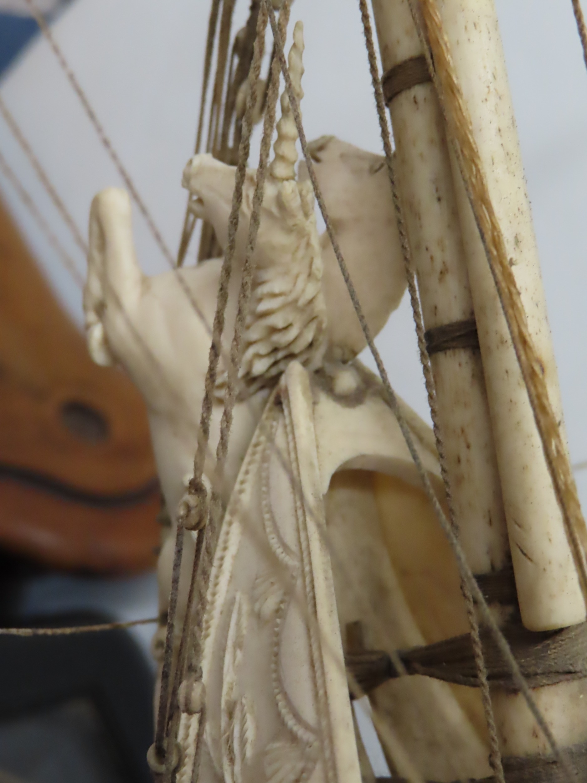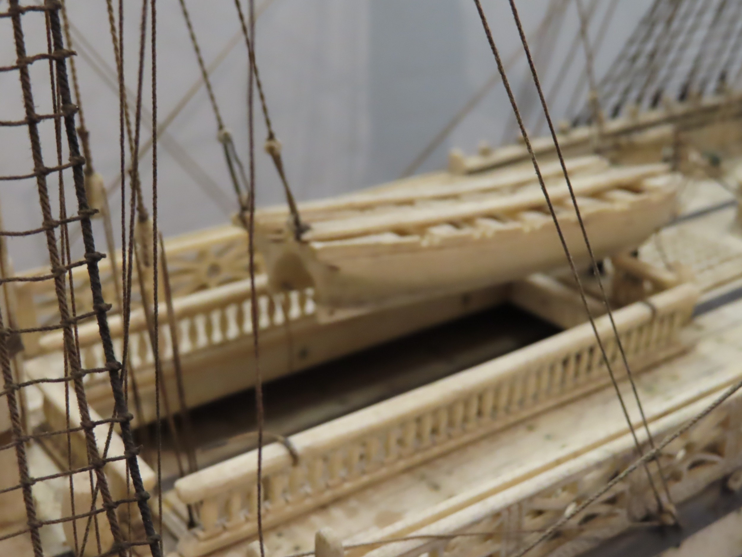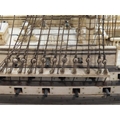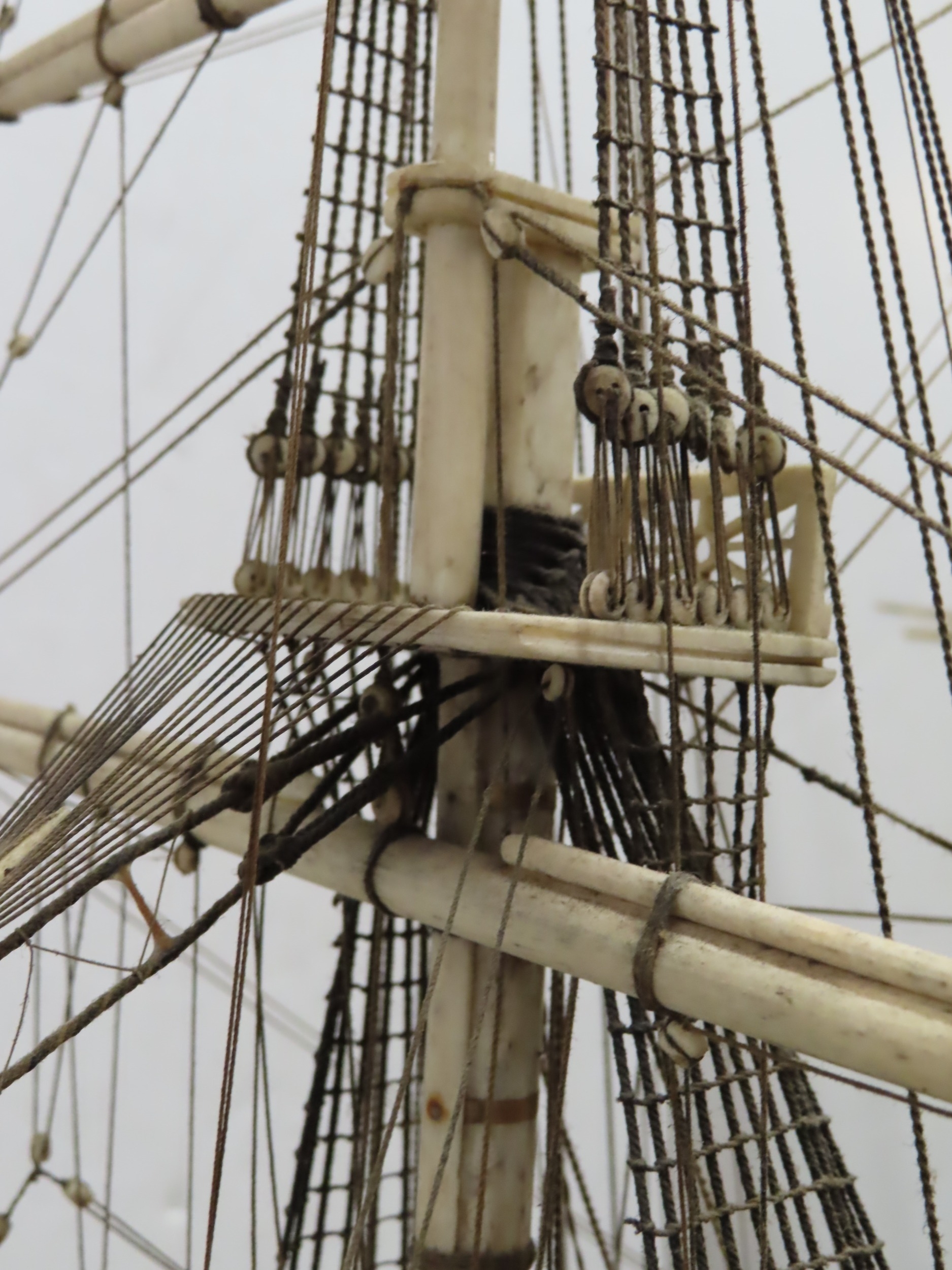 the 31in. planked and pinned hull with contrasting main and secondary wales, oxidised brass guns in ports, double-equestrian unicorn figurehead and finely carved stern with balcony, planked decks with strakes and fittings including gratings, capstan, water casks, well deck with balustrade and conjoined fitted boats over, bilge pump, covered companionways, guns in stepped bone carriages, deck light, bound masts with yards, s'tun'sl booms, standing and running rigging with bone blocks and tackle, mounted via three bone supports to inlaid marquetry display base with feet -- 36 x 52in. (91.5 x 132cm.)