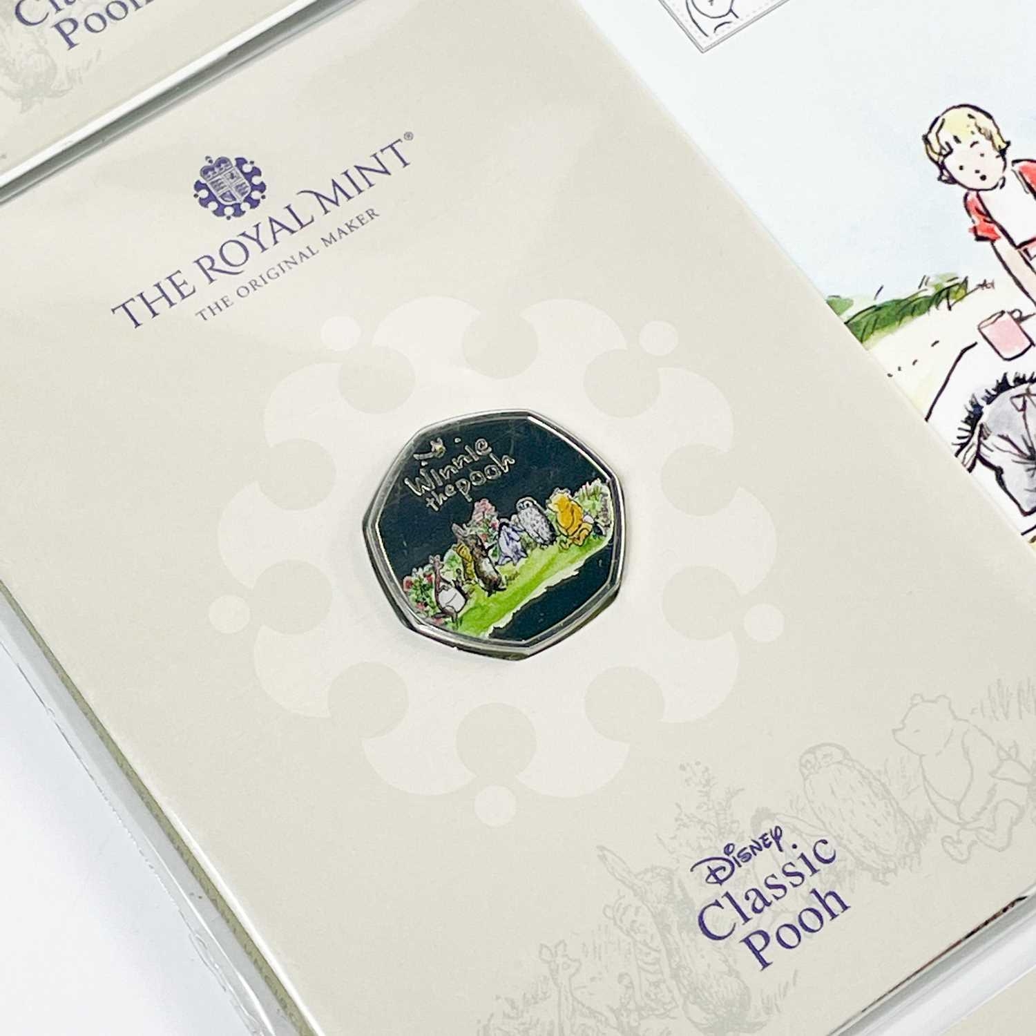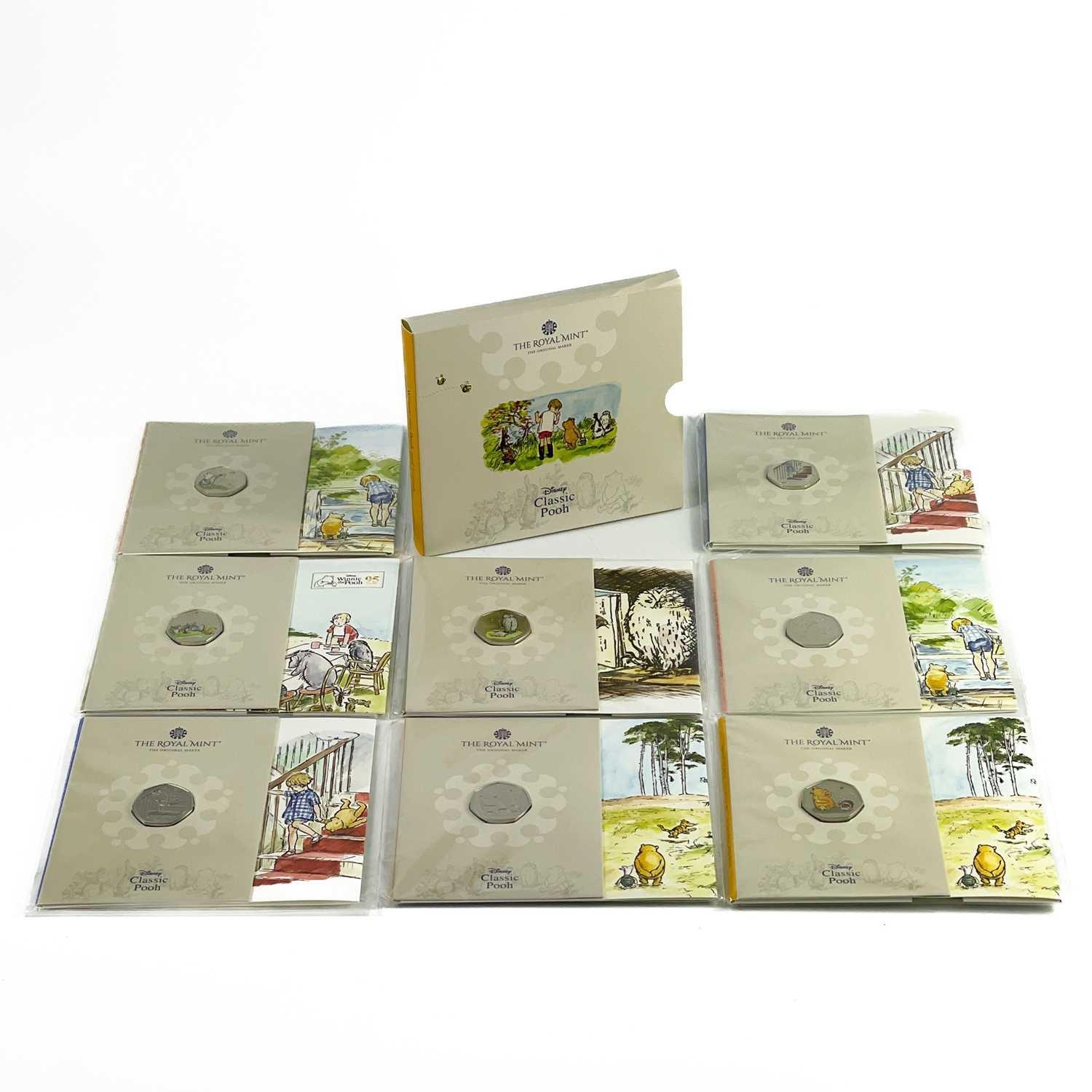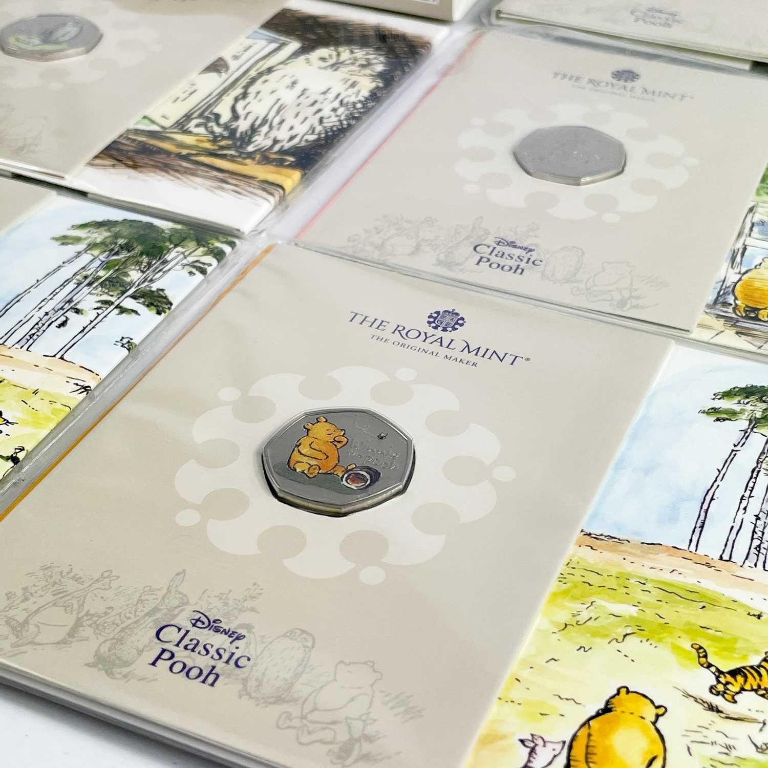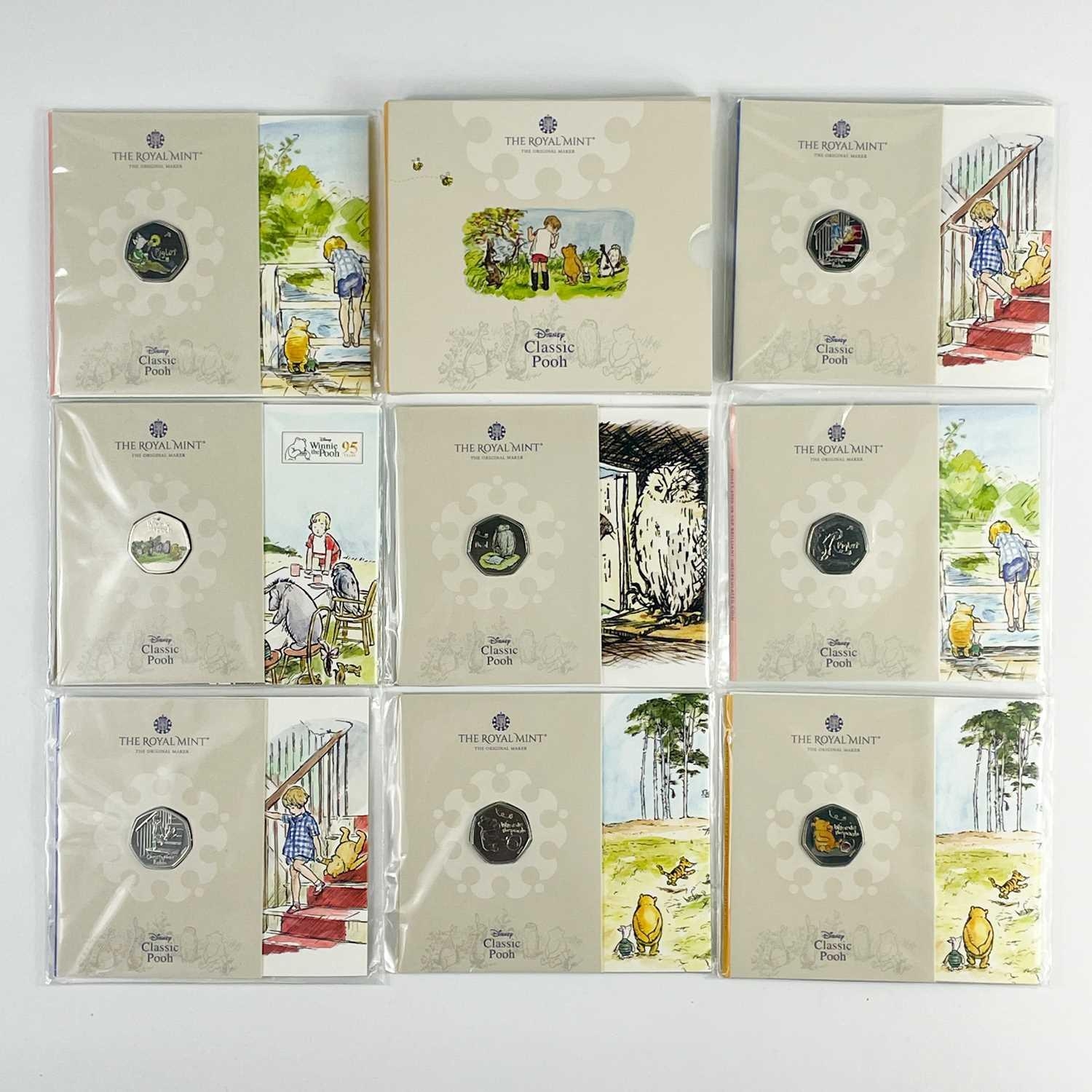 UK 2020 & 2021 50 pence Disney Classic Pooh colourised and uncolourised uncirculated coins in Royal Mint packaging (x8) Comprising: 1: A cardboard sleeve of 3 colourised 2020 coins: Winnie the Pooh, Christopher Robin and Piglet. 2: 2x 2021 colourised coins: Winnie the Pooh and Owl. 3: 3x 2020 uncolourised coins. Christopher Robin, Piglet and Winnie the Pooh.